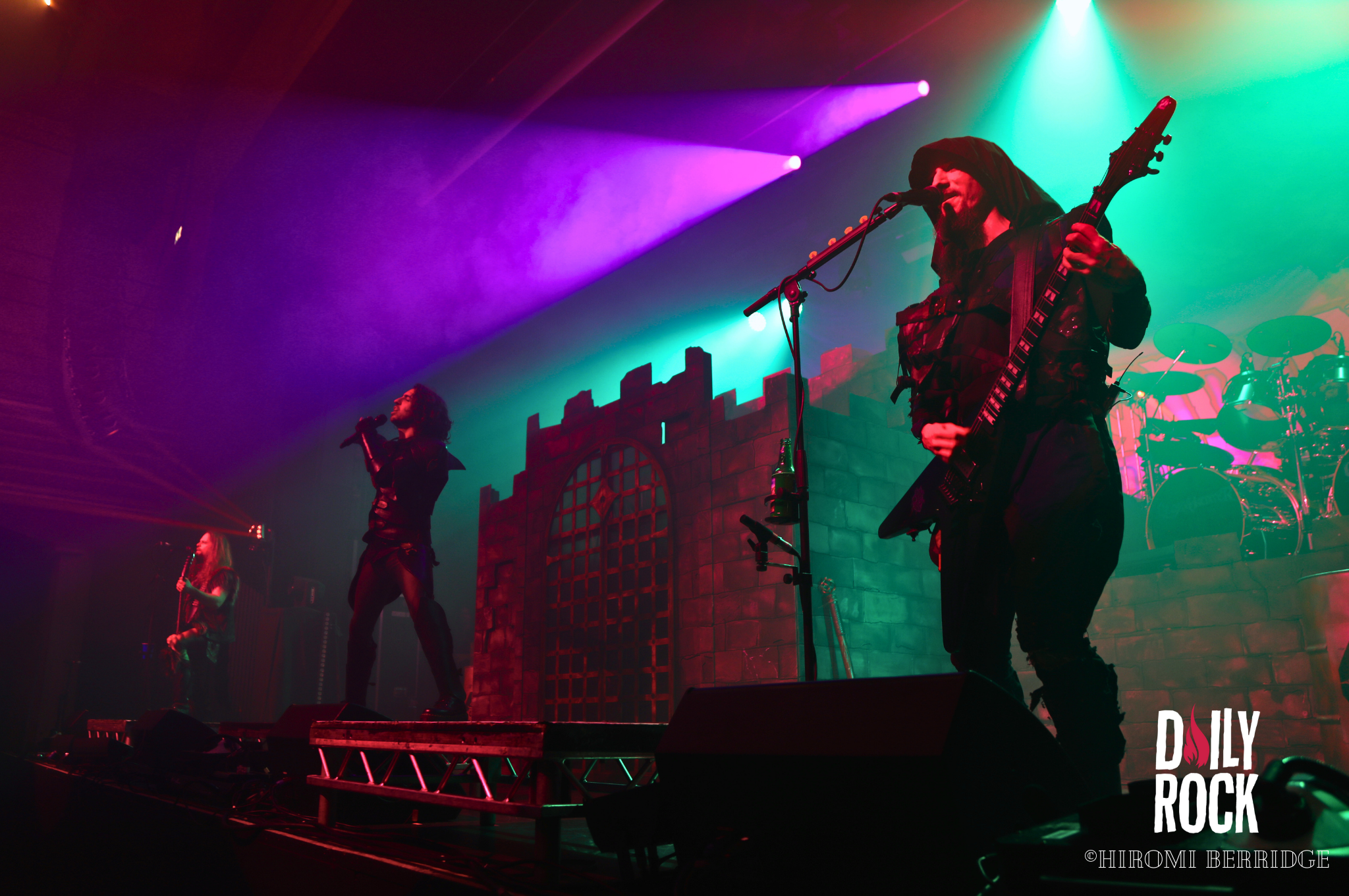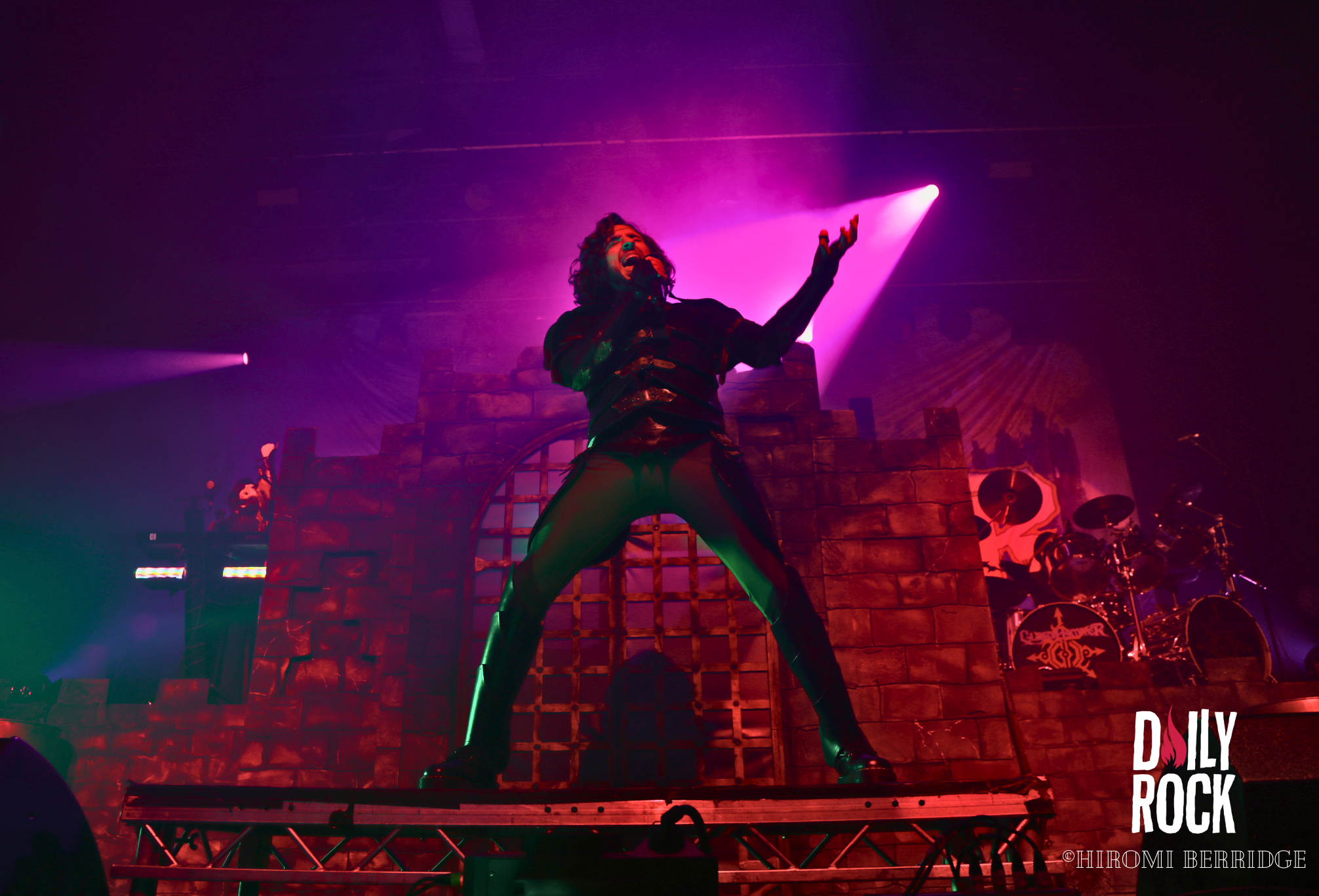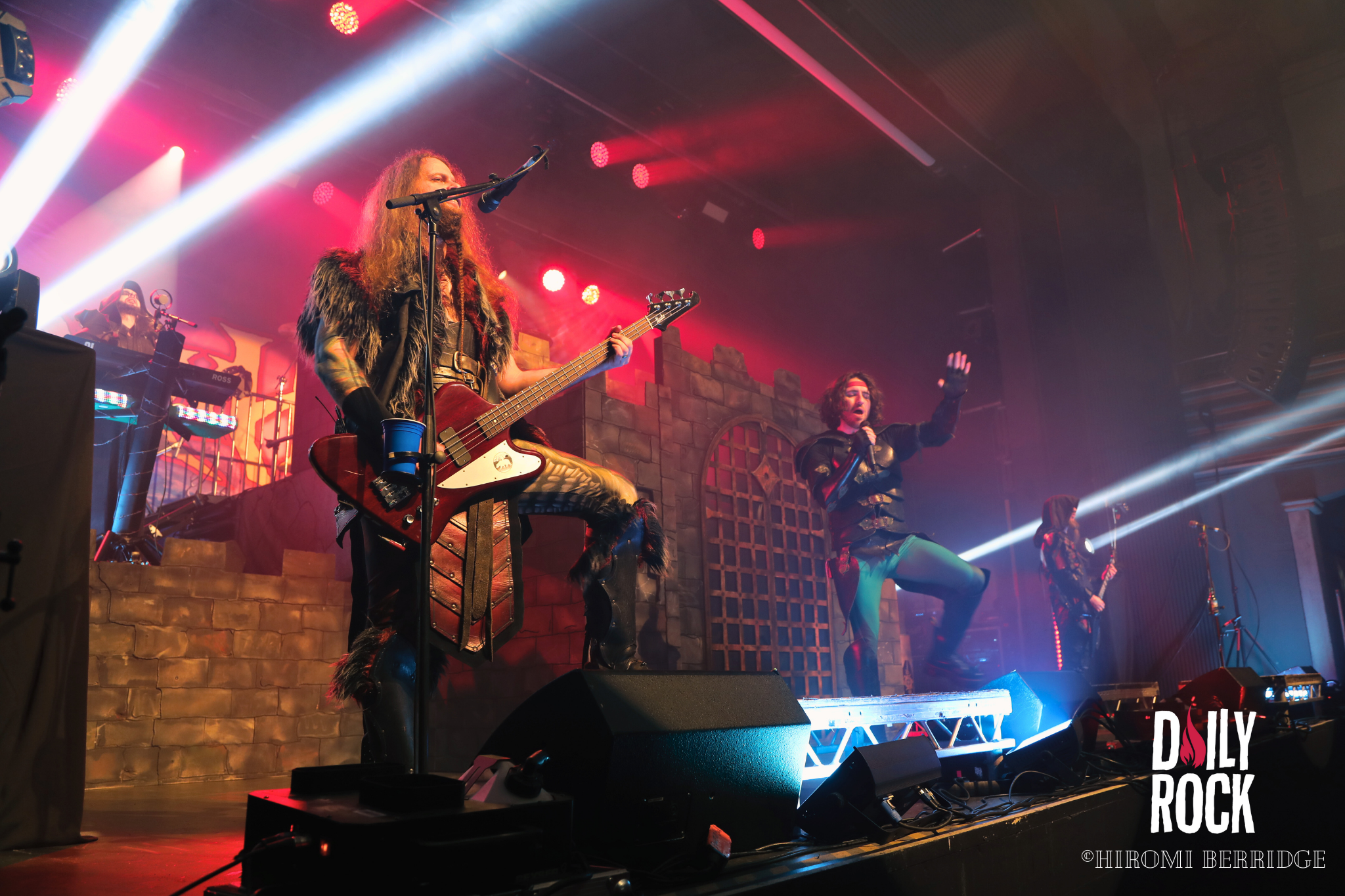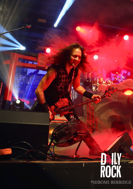 Après plusieurs légendes du Valhalla, des dieux du nord et un cul sec de bière de l’un des chanteurs, on regarde la technique mettre en place un château de brique (oui en carton mais faite un effort d’imagination) et l’immense bannière pour le prochain groupe, Gloryhammer. Comme à leur habitude, le concert commence par une effigie de taille humaine, cette fois-ci de David Hasselhoff. Et puis débarque un à un les musiciens pour nous emmener en voyage à travers l’espace et les dimensions. Que dire de ce groupe qui n’a pas déjà été dit. La voix angélique du chanteur, les solo endiablé du guitariste, les notes pressantes du claviériste et la partie rythmique toujours aussi efficace. Sans oublier notre ami, enfin… ennemie Le Goblin ! Qui se paie même le luxe d’une belle perruque bleu sur une de ses interventions. On pourra se réjouir d’avoir des morceaux de leur tout dernier album “Return to the Kingdom of Fife« , mélangés aux classiques Gloryhammer, Univers on Fire ou encore HootsForce. Le public ne se fait d’ailleurs pas privé pour chanter les paroles, hurler en rythme avec les musiciens, et commencent même les pogos.