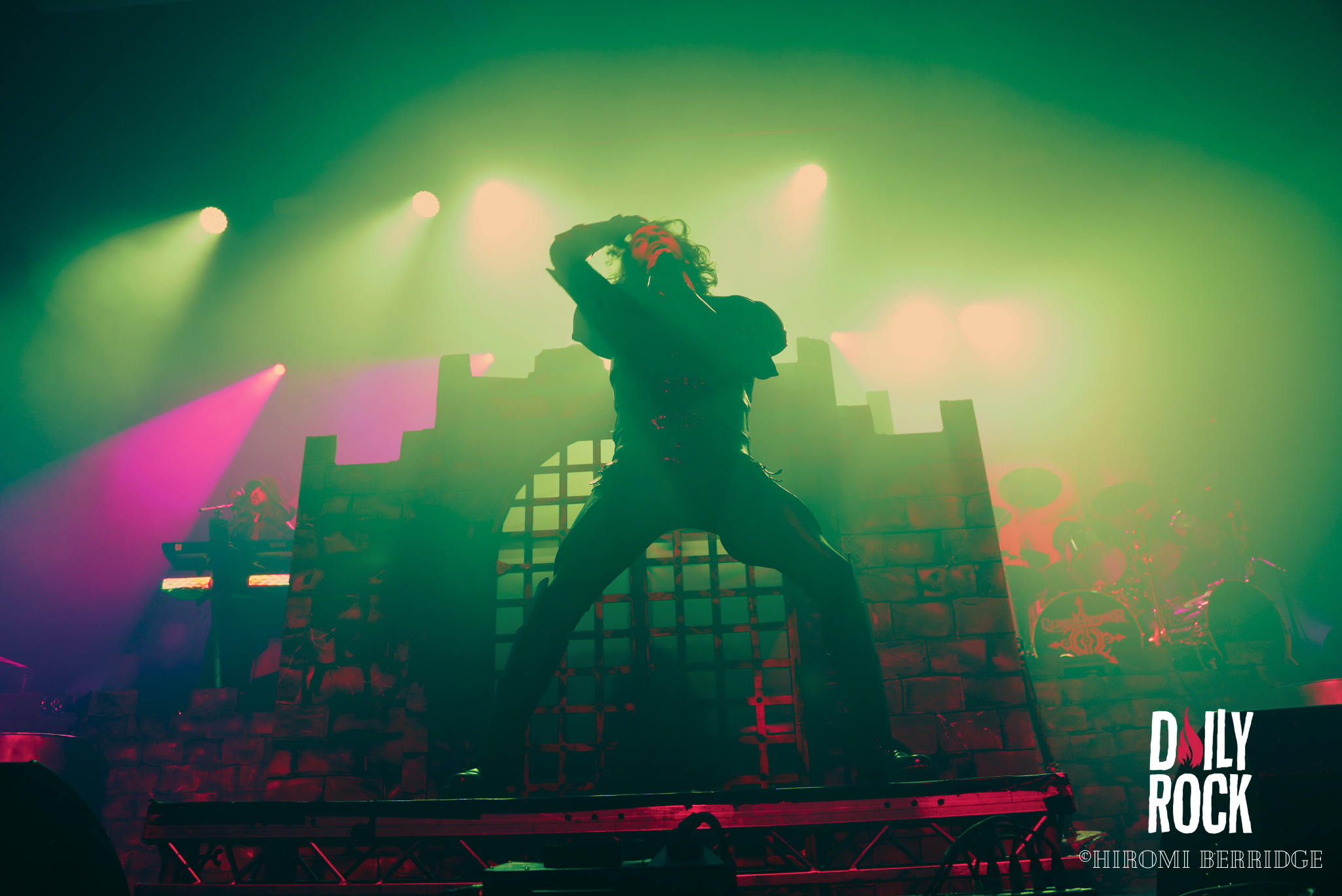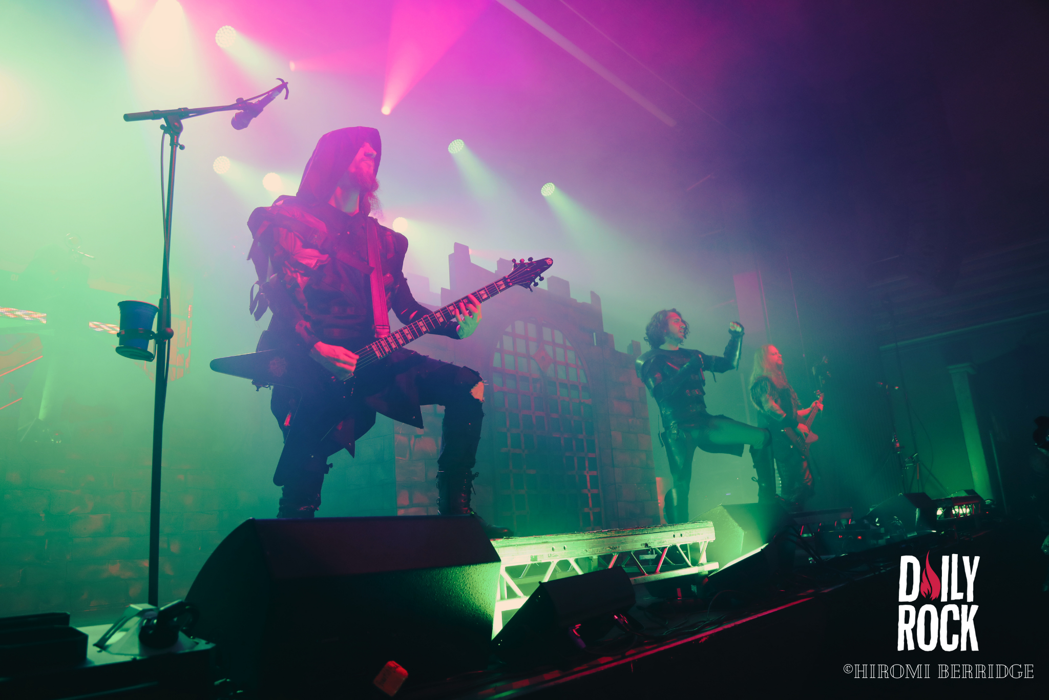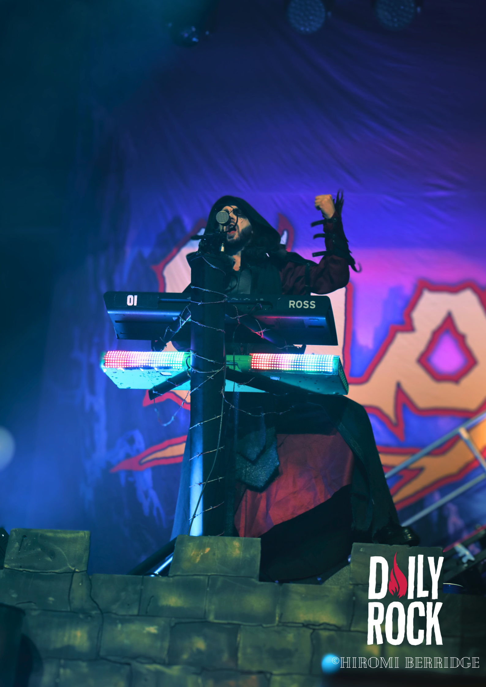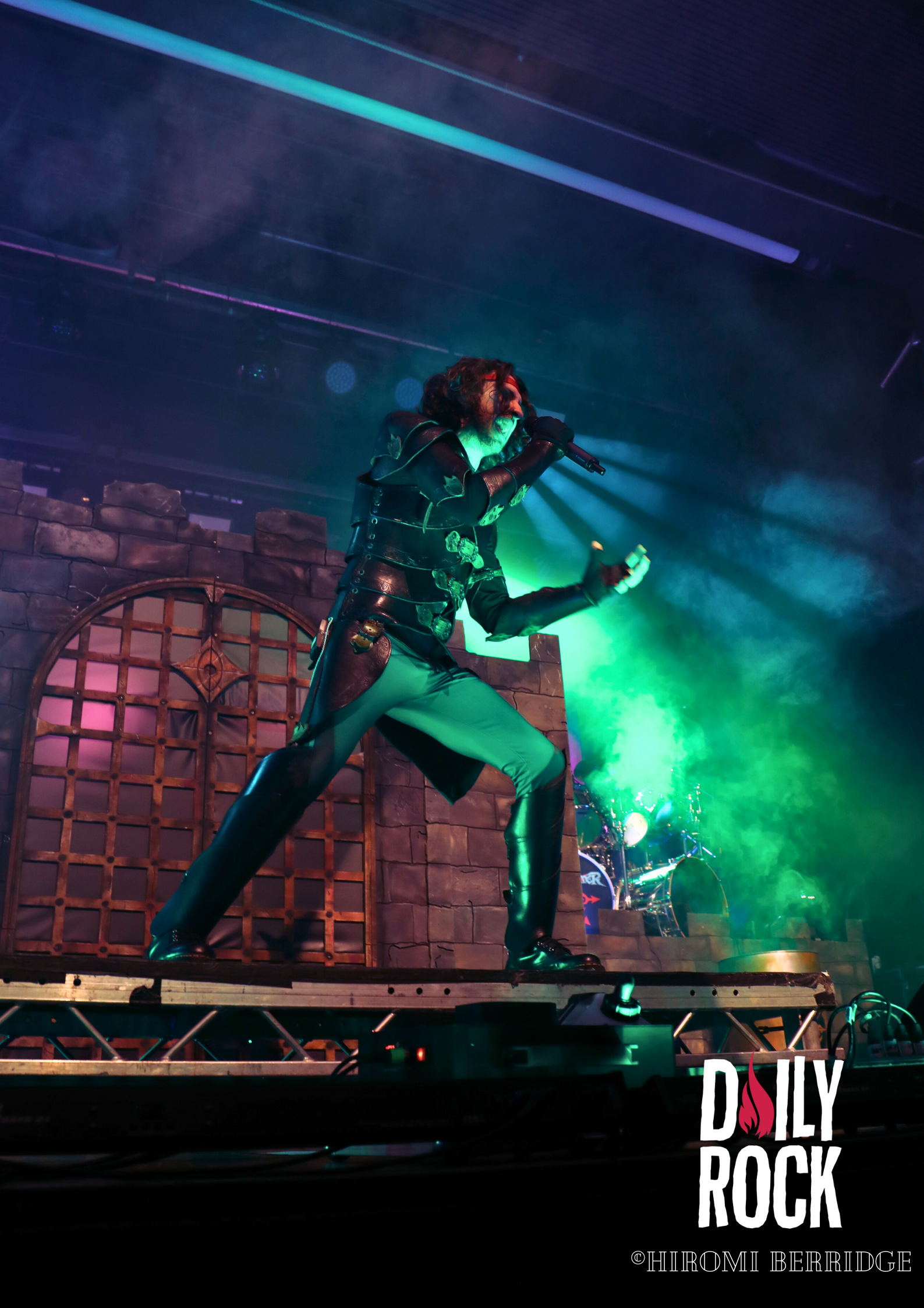 Après plusieurs légendes du Valhalla, des dieux du nord et un cul sec de bière de l’un des chanteurs, on regarde la technique mettre en place un château de brique (oui en carton mais faite un effort d’imagination) et l’immense bannière pour le prochain groupe, Gloryhammer. Comme à leur habitude, le concert commence par une effigie de taille humaine, cette fois-ci de David Hasselhoff. Et puis débarque un à un les musiciens pour nous emmener en voyage à travers l’espace et les dimensions. Que dire de ce groupe qui n’a pas déjà été dit. La voix angélique du chanteur, les solo endiablé du guitariste, les notes pressantes du claviériste et la partie rythmique toujours aussi efficace. Sans oublier notre ami, enfin… ennemie Le Goblin ! Qui se paie même le luxe d’une belle perruque bleu sur une de ses interventions. On pourra se réjouir d’avoir des morceaux de leur tout dernier album “Return to the Kingdom of Fife« , mélangés aux classiques Gloryhammer, Univers on Fire ou encore HootsForce. Le public ne se fait d’ailleurs pas privé pour chanter les paroles, hurler en rythme avec les musiciens, et commencent même les pogos.