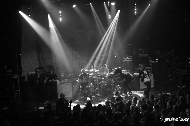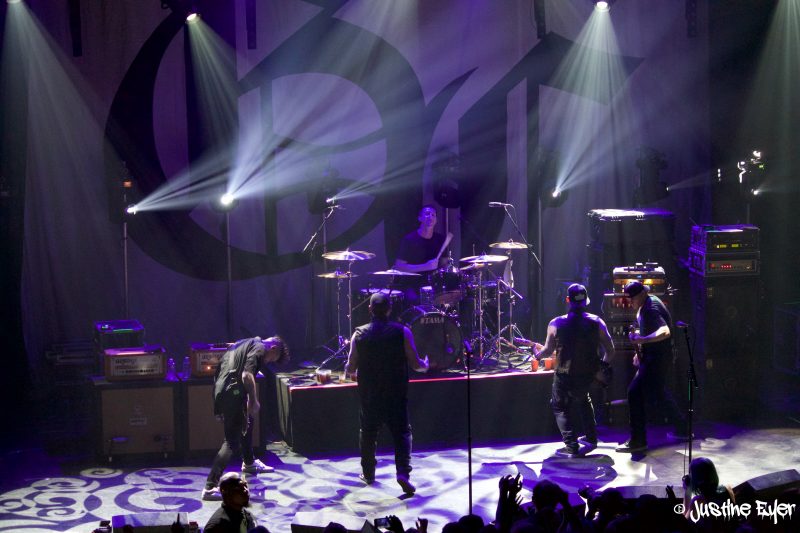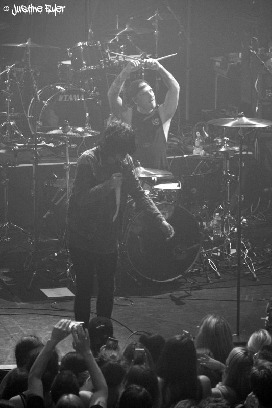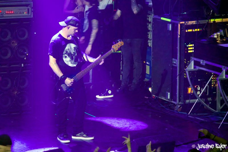 18h45 feu départ ! Issues arrive sur scène. Dès les premiers titres, leurs influences sautent aux oreilles. Linkin Park, Blink-182, Limp Bizkit. Arrêtons là les comparaisons, autant flagrantes soient-elles. On se demande d’ailleurs ce qu’ils font durant ce set qui manquera cruellement de cohérence. Plutôt du nu-metal ou du metalcore ? Plutôt le premier, vu les sons électro-pop qui nous chatouillent les tympans. Je pense que certains DJ d’Ibiza pourraient nous sortir certains de leurs ‘samples’. Pas fameux. Les voix tantôt hurlées, tantôt ‘clean’ s’enchevêtrent avec plus ou moins d’efficacité. Le public présent se veut presque réceptif. Le groupe d’Atlanta est répétitif sur la longueur, et l’on se dit, ‘ok c’est bon, on a compris’ ! Nous méritons de nous abreuver pour faire passer cette première pilule assez amère.