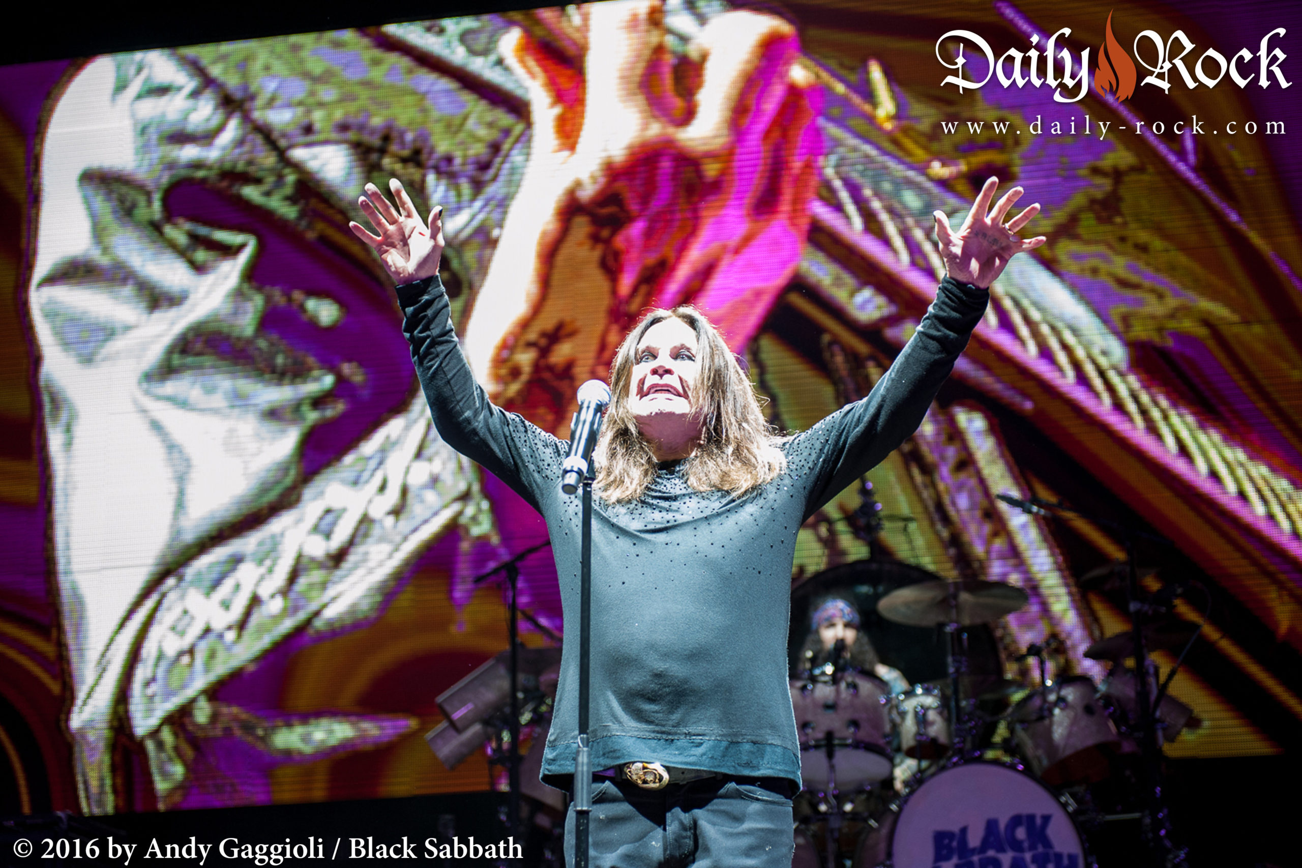 Anticipé par la célèbre cloche à mort, le groupe monte sur scène sur les notes épiques de ‘Black Sabbath’. Lente, sulfureuse…HEAVY. Le son est comme il faut pour un concert de metal: clair, puissant, avec la basse qui cogne dans l’estomac. On continue avec ‘Fairies Wear Boots’ et une succession de classiques comme ‘Into the Void’, ‘Snowblind’, la mythique ‘War Pigs’ , ‘N.I.B’ ou ‘Iron Man’ alternées à des morceaux moins connus comme ‘Hand of Doom’ ou ‘Dirty Woman’. Ces derniers des morceaux avec beaucoup de parties jouées, peut-être est-ce pour permettre à Ozzy de reposer sa voix de temps en temps ? Un Ozzy -qui malgré tout- a un bon niveau vocal. Bien sûr de temps en temps il ne trouve pas la juste note ou semble un poil discordant (j’ai même eu l’impression qu’une deuxième voix le soutiennait derrière la scène pour les parties plus difficiles) mais la prestation reste très bonne. Il est de bonne humeur Mr. Osbourne et n’arrête pas de demander au public de applaudir ou de crier. Il jette les habituels seaux d’eau sur les premiers rangs et, entre les morceaux, nous donne des ‘uhuh’, avec toute la salle qui fait écho. Le ‘Madman’ souris et réplique ‘You’re crazier than me’. A droite Tony Iommi. Calme, derrière ses lunettes de soleil, le guitariste joue une montagne de riffs bien plus impressionnante que d’abattre une montagne elle-même. De l’autre côté Geezer Butler, qui nous martèle avec sa basse, fournis un effort très intense sur les rythmes frénétiques de Tommy Clufetos derrière les futs. Ce dernier a la fin de ‘Rat Salad’ aura aussi son moment de gloire, avec un long mais très intéressant solo. Il est né dans la mauvais période, Tommy. Il semble sorti d’un film de Woodstock: longue barbe et cheveux attachés par une bandana, et un style de batterie très old-school. Tandis que les batteurs modernes n’arrêtent pas d’exaspérer avec des techniques disparues de double-caisse, lui, il donne davantage d’importance aux combinaisons de futs et cymbales pour un résultat très énergique et spectaculaire. Bien fait. La soirée termine avec les classiques ‘Children of the Grave’ et l’immortelle ‘Paranoid’. Pour tous les présents ce soir ça aurait été un moment de très forte émotion… The End ! ‘Thank you. You’re number one. God bless you all’ nous hurle Ozzy avant de prendre congé du public. Au revoir Ozzy, au revoir Tony, au revoir Geezer, vous allez nous manquer ![Andy Gaggioli]