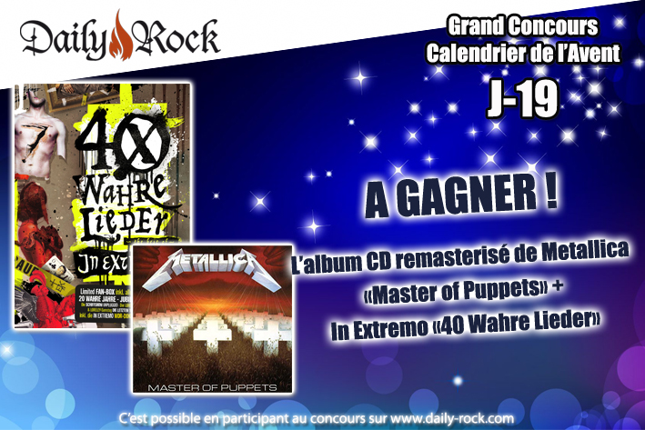 Nous mettons en concours un lot composé de l’album remasterisé de Metallica « Master of Puppets » + In Extremo « 40 Wahre Lieder ». Pour y prendre part, remplissez le formulaire ci-dessous. Le gagnant sera informé par courriel et recevra son lot directement par la Poste. Bonne chance à tous.