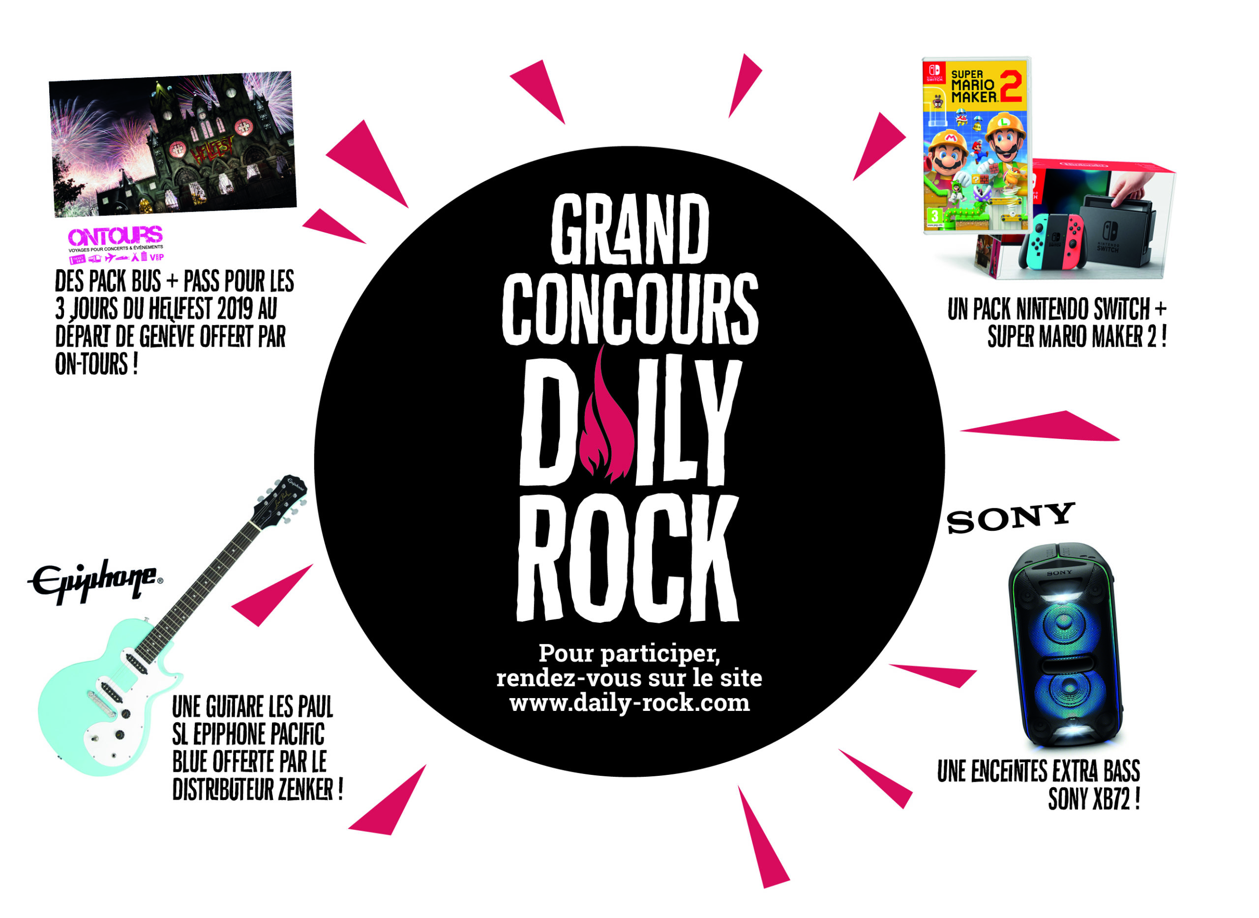 Daily Rock vous propose un grand concours cet été pour gagner de super lots comme un pack bus + pass 3 jours pour le Hellfest (Départ de Genève), Une guitare Epiphone, un pack Nintendo Switch + Super Mario Maker 2 et également une enceinte Extra Bass Sony XB72 ! Bonne chance à tous !
