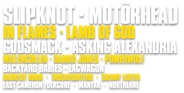 SLIPKNOT * MOTÖRHEAD * IN FLAMES * LAMB OF GOD * GODSMACK * ASKING ALEXANDRIA * MILLENCOLIN * DANKO JONES * POWERWOLF * BACKYARD BABIES * LAGWAGON * DARKEST HOUR * TRUCKFIGHTERS * SKINNY LISTER * EAST CAMERON FOLKCORE * MANTAR * NORTHLANE *