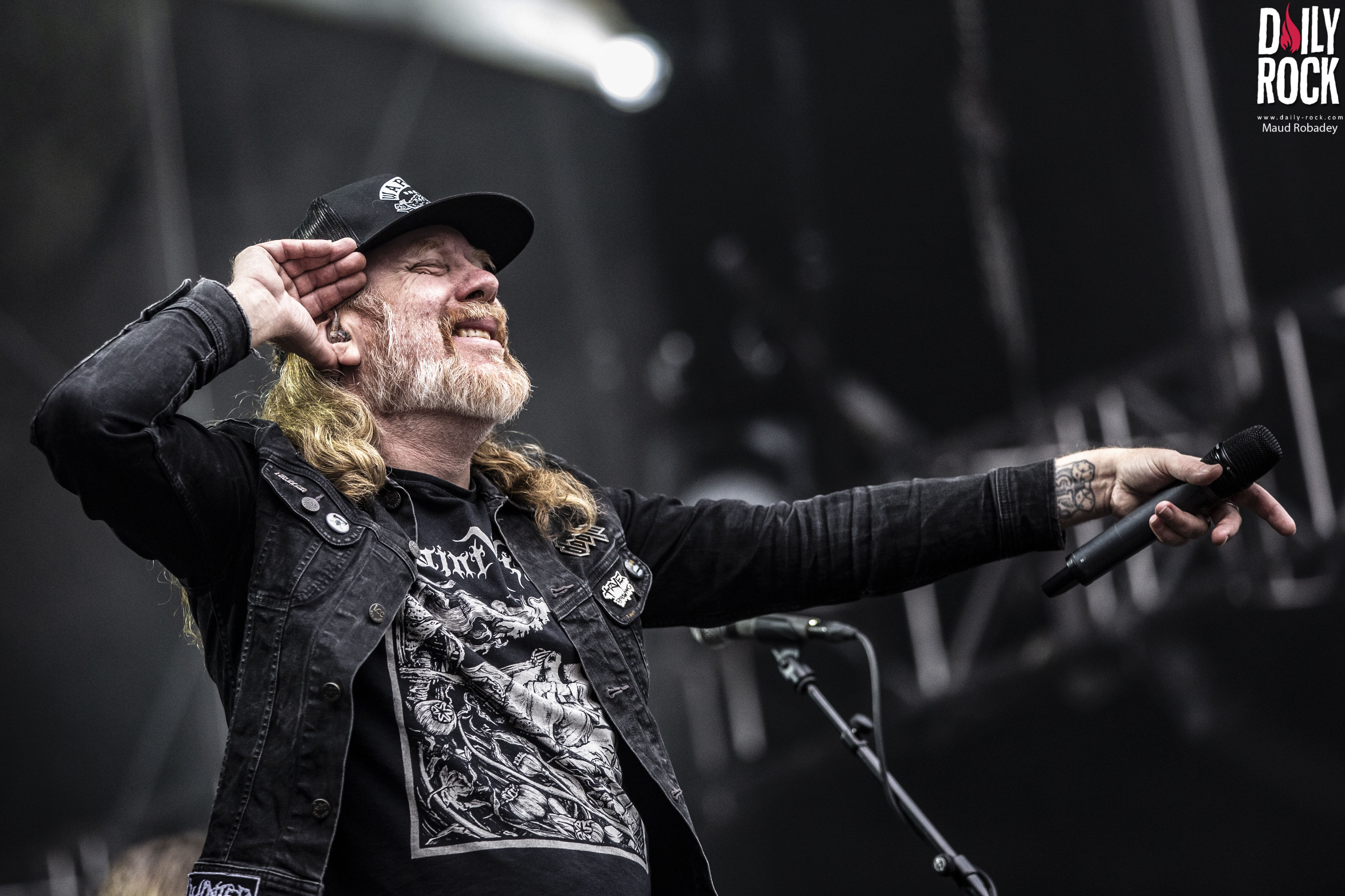 Avec un peu de regret nous sommes contraintes de louper Graveyard pour pouvoir avoir une bonne vue sur le concert de Sabaton, connus pour leurs décorations et leur mise en scène. Les décors de scène mettent un certain temps à être placés, ce qui laisse le temps à la fatigue et le froid de venir presque nous faire renoncer au show. Après un combat acharné avec l’envie de retourner à la tente je croise les merveilleux festivalier.ère.s avec qui j’ai eu la chance de partager mes nuits et certains moments du festival. Des bruits de canon retentissent et nous laissent découvrir avec émerveillement la scène époustouflante des Suédois. La Jungfrau s’est transformée en véritable champ de bataille, avec des décors de tranchées et autres barbelés. On notera que pour une fois les photographes n’auront pas la meilleure vue : même avec l’aide d’un tabouret, impossible de voir ce qu’il se passe sur scène. Le groupe remercie à plusieurs reprise le public du Greenfield pour avoir bravé la tempête. Malgré le contexte sérieux des thèmes abordés dans ses titres le groupe a su amener de véritables notes humoristiques. Joakim Brodén s’est amusé pendant une bonne partie du concert avec un poulet lancé depuis la foule et a aussi réussi à tenir en haleine le public à chaque petite pause. Sabaton a aussi joué à ‘qui finira sa bière le plus vite’ et se faire rappeler plusieurs fois sur scène grâce au ‘One more beer’ de la foule. Entre les prouesses pyrotechniques et la mise en scène, nous avons été époustouflé.e.s du début à la fin du show.