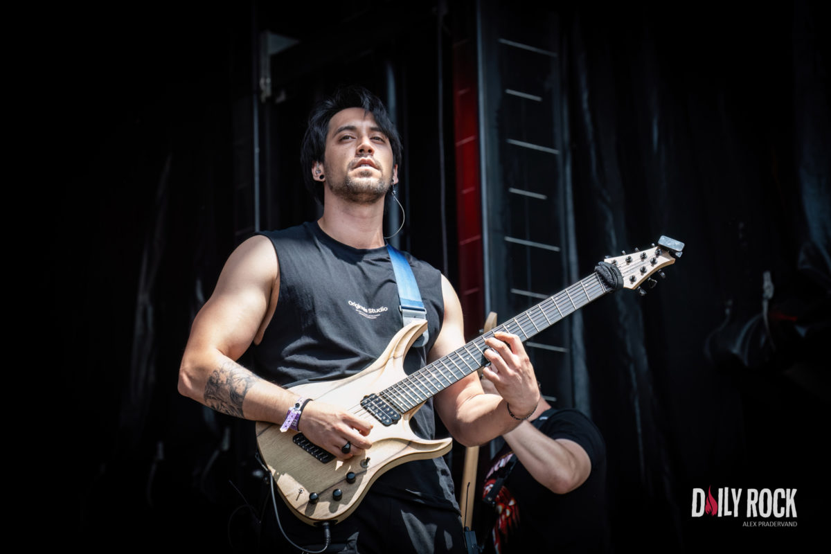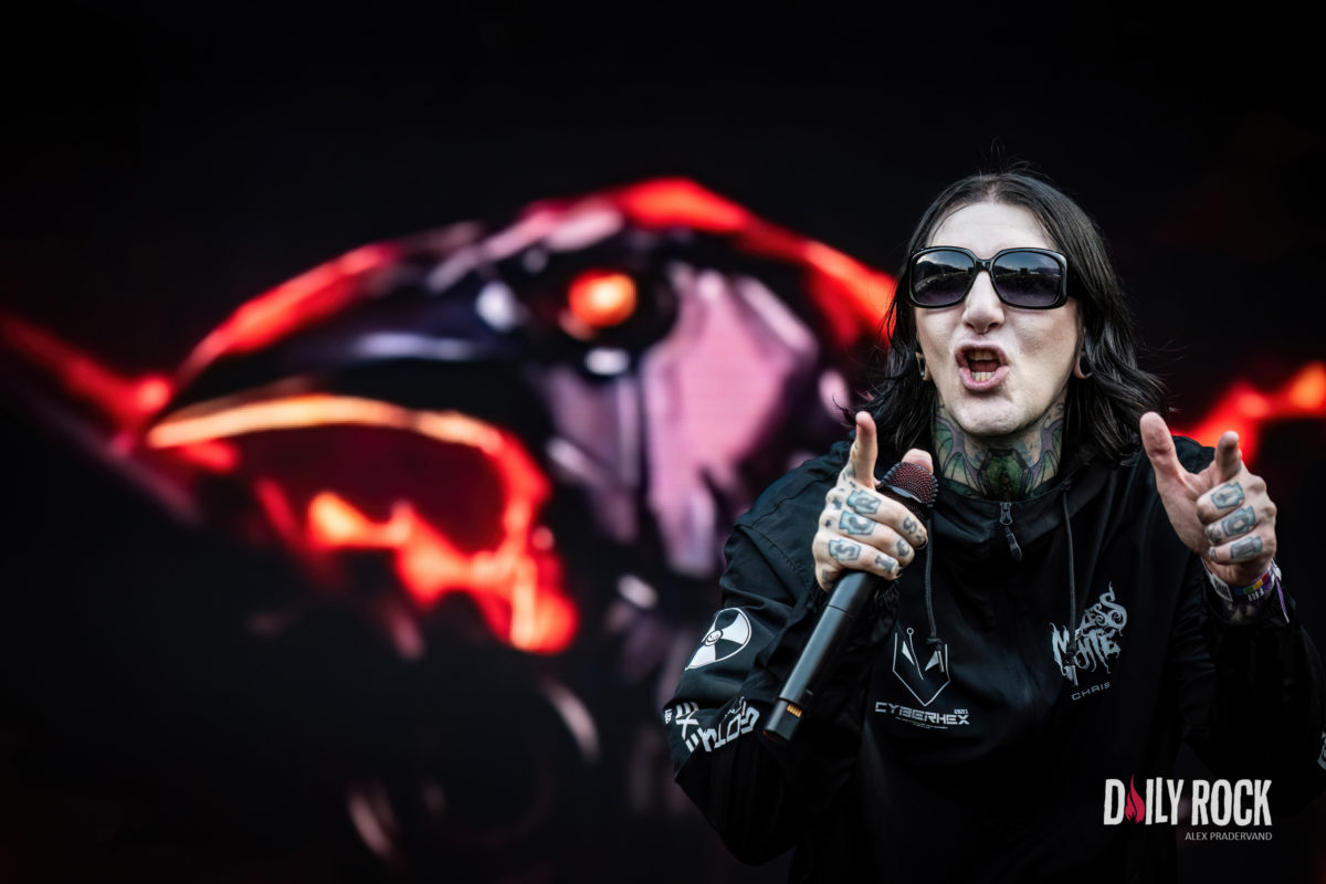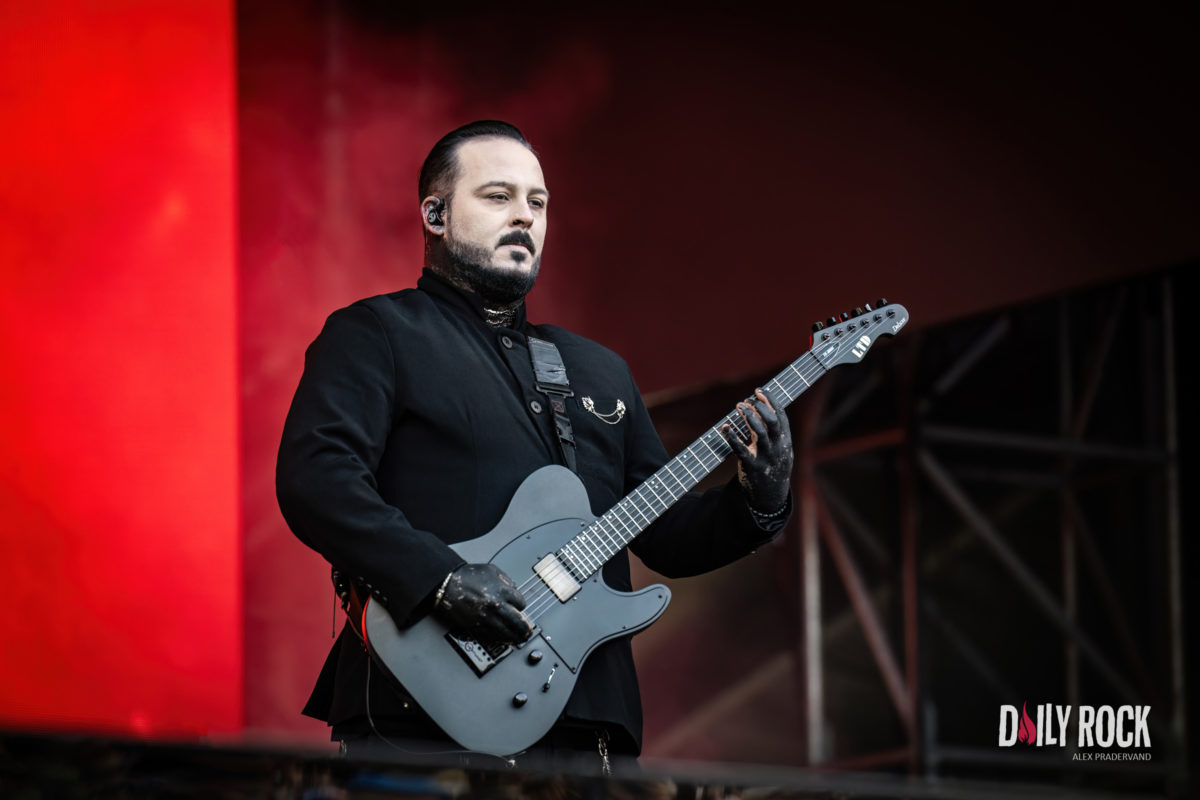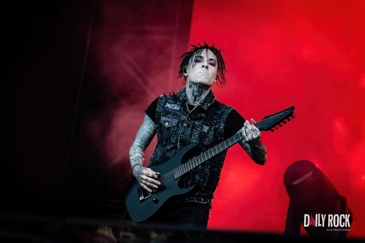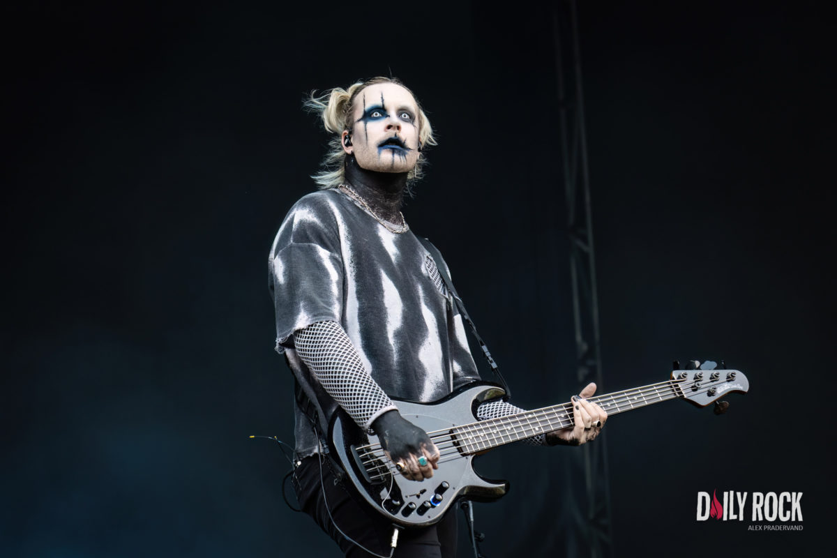 Changement d’ambiance avec Motionless in White sur la grande scène. D’entrée de jeu, on se laisse surprendre par Chris, qui arbore d’habitude beaucoup de maquillage. Il faut croire que la chaleur et le soleil ont eu raison de lui. En tout cas, le groupe est solide et ça fait plaisir de les retrouver. Sur les écrans, Justin Morrow nous gratifie de son show horreur avec ses lentilles de contact blanches qui lui confèrent un regard glacant.