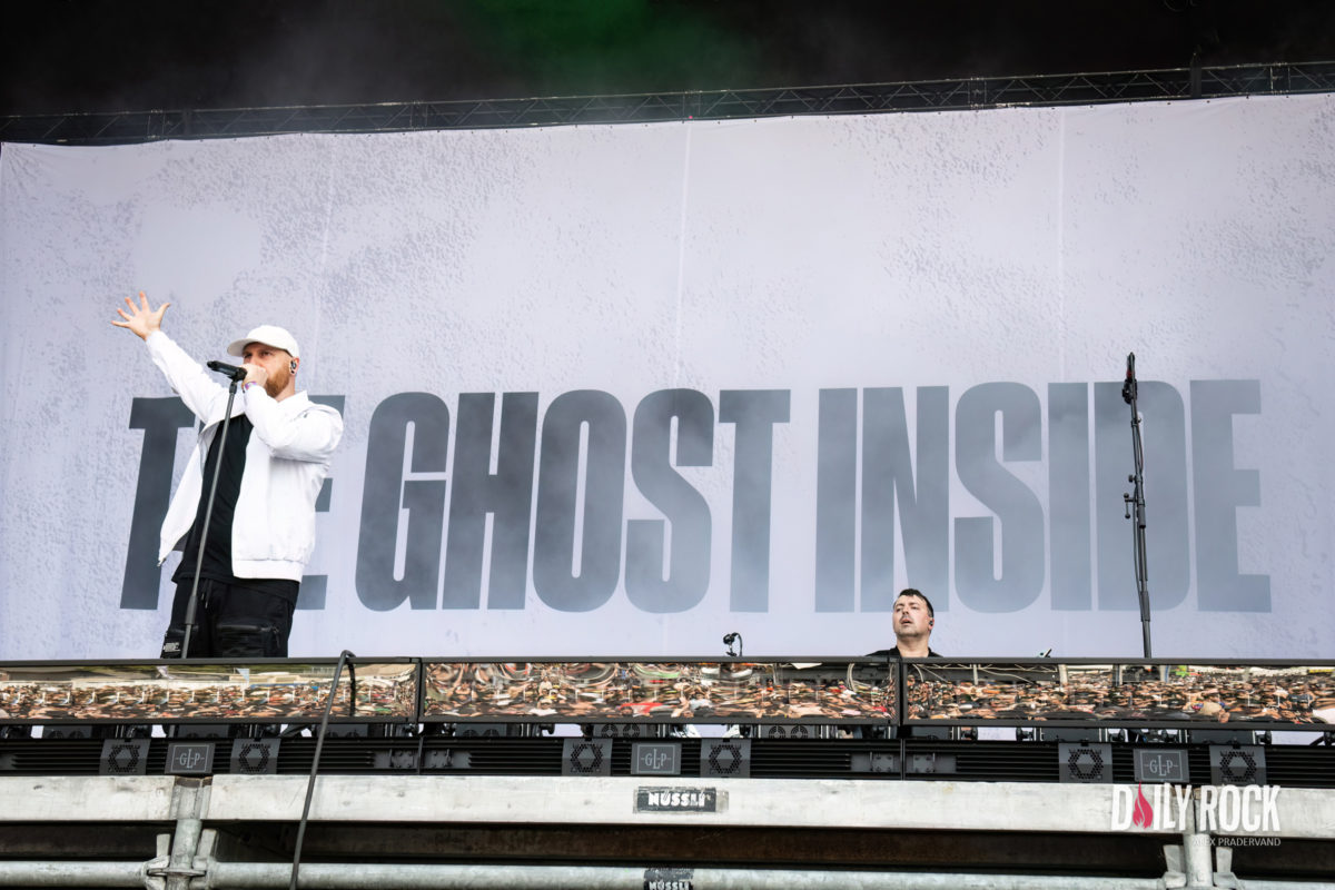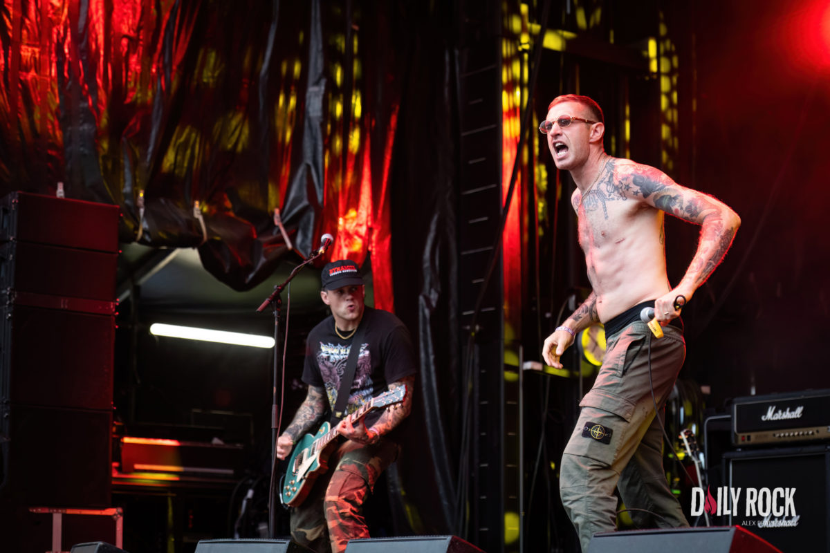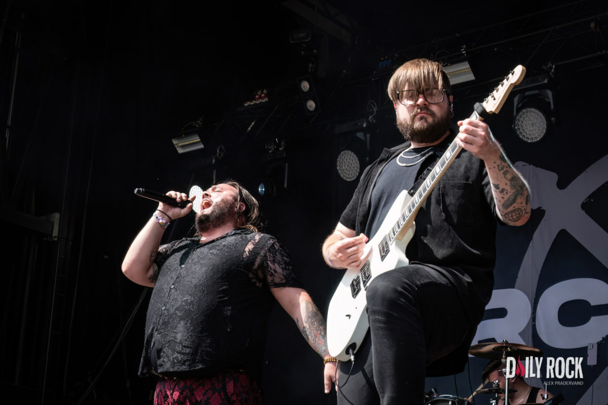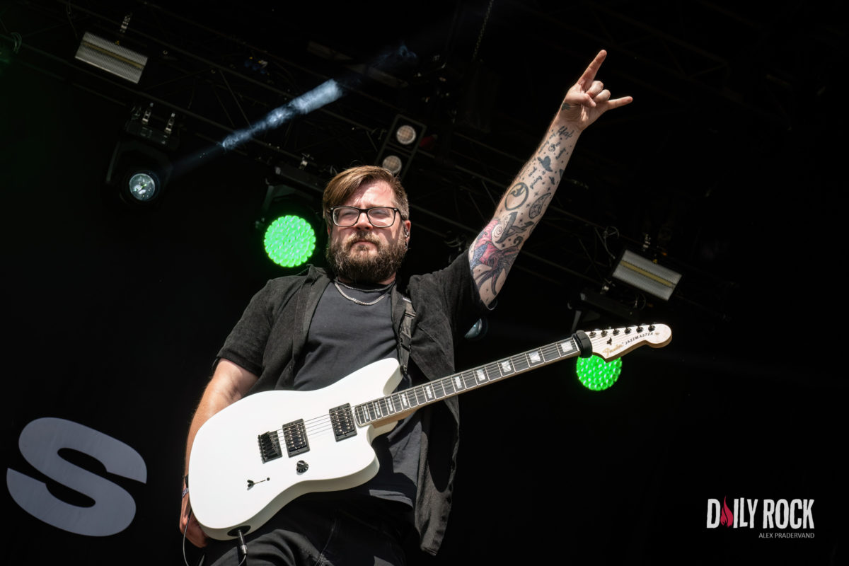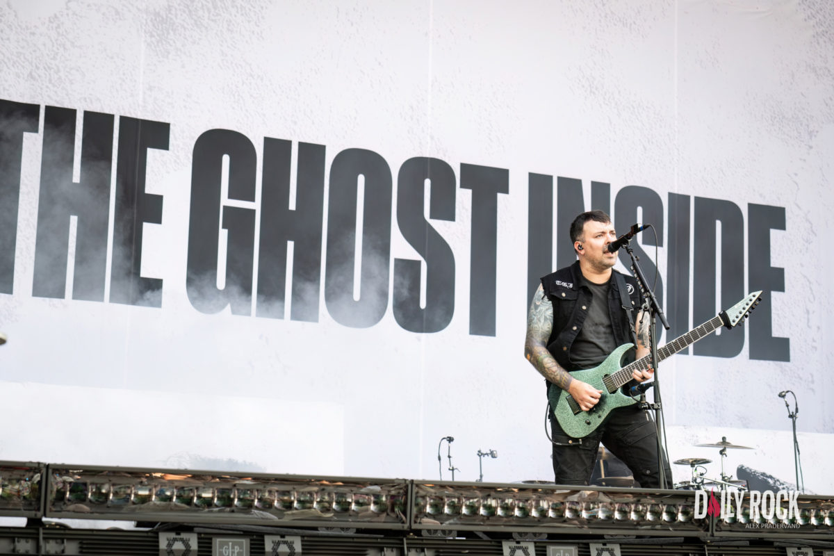 Changement d’ambiance avec Motionless in White sur la grande scène. D’entrée de jeu, on se laisse surprendre par Chris, qui arbore d’habitude beaucoup de maquillage. Il faut croire que la chaleur et le soleil ont eu raison de lui. En tout cas, le groupe est solide et ça fait plaisir de les retrouver. Sur les écrans, Justin Morrow nous gratifie de son show horreur avec ses lentilles de contact blanches qui lui confèrent un regard glacant.