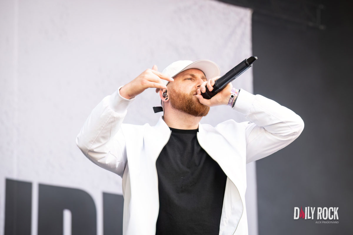 Entre temps , quelque chose de grand se prépare sur la grande scène. On dirait presque que le décor d’un film se met en place. On n’a aucun détail mais ça nous donne envie d’en savoir plus. Tout a coup, des bureaux surgissent d’on ne sait où et la scène se métamorphose en open space. Dans un fracas inattendu, une explosion se fait entendre et quelqu’un tombe du plafond. C’est là qu’apparaît Alligatoah. Le Macklemore du metal se lance dans du rap et de la casse d’objets divers. Visuellement, ça envoie grave. Musicalement, peut mieux faire. En tout cas, ça change de ce qu’on a vu jusque là.