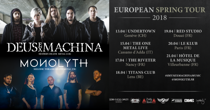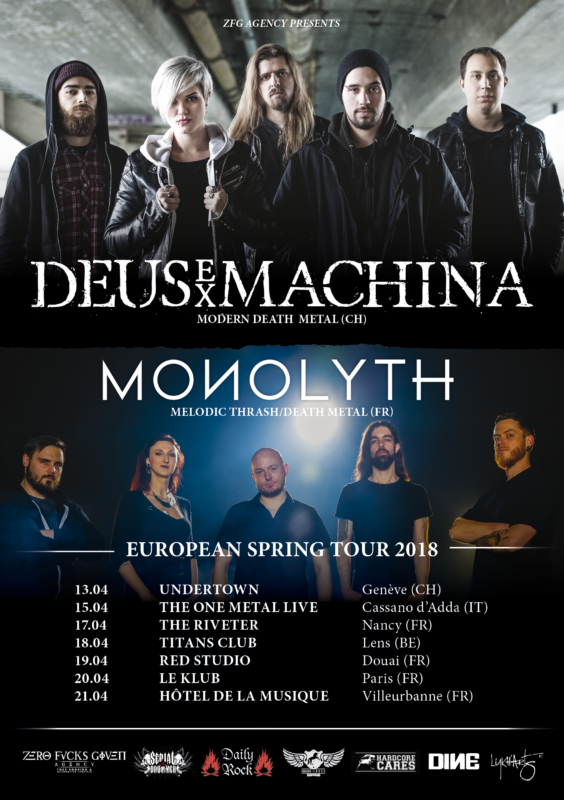 Le groupe genevois Deus Ex Machina est fier de vous présenter sa toute première tournée européenne en compagnie du groupe parisien Monolyth ! Du 13 au 21 avril 2018, ils tailleront la route à travers la Suisse, l’Italie, la Belgique et la France.