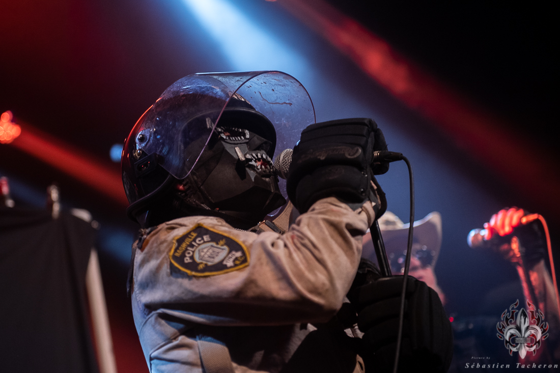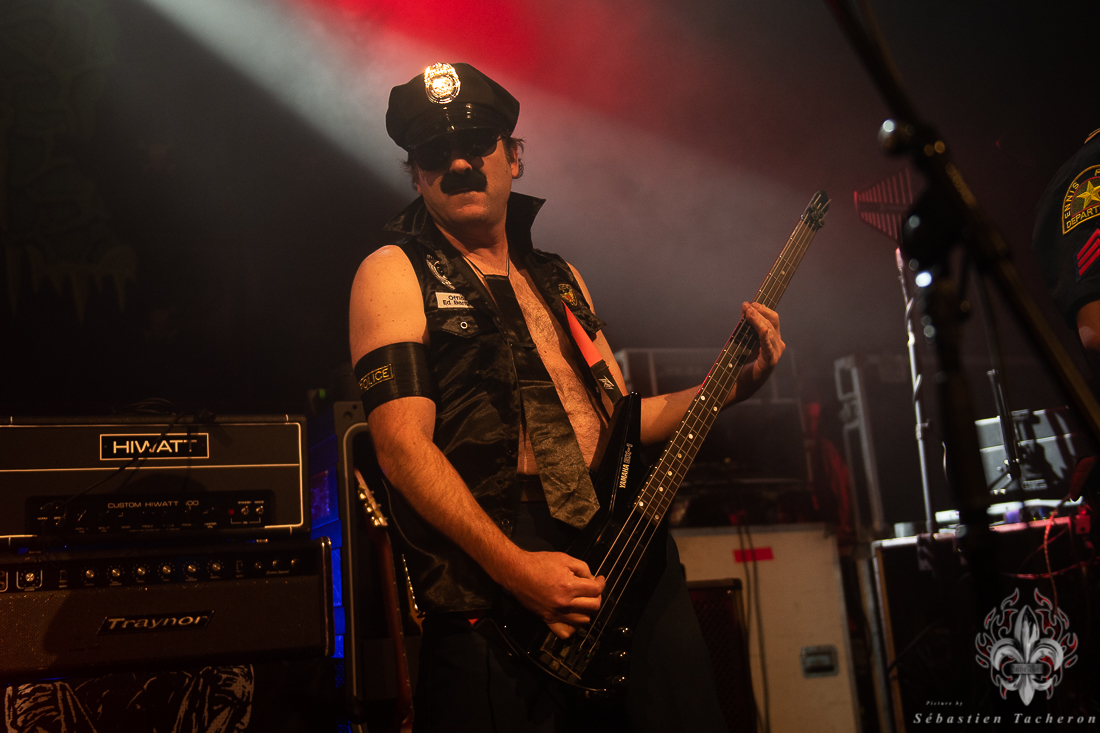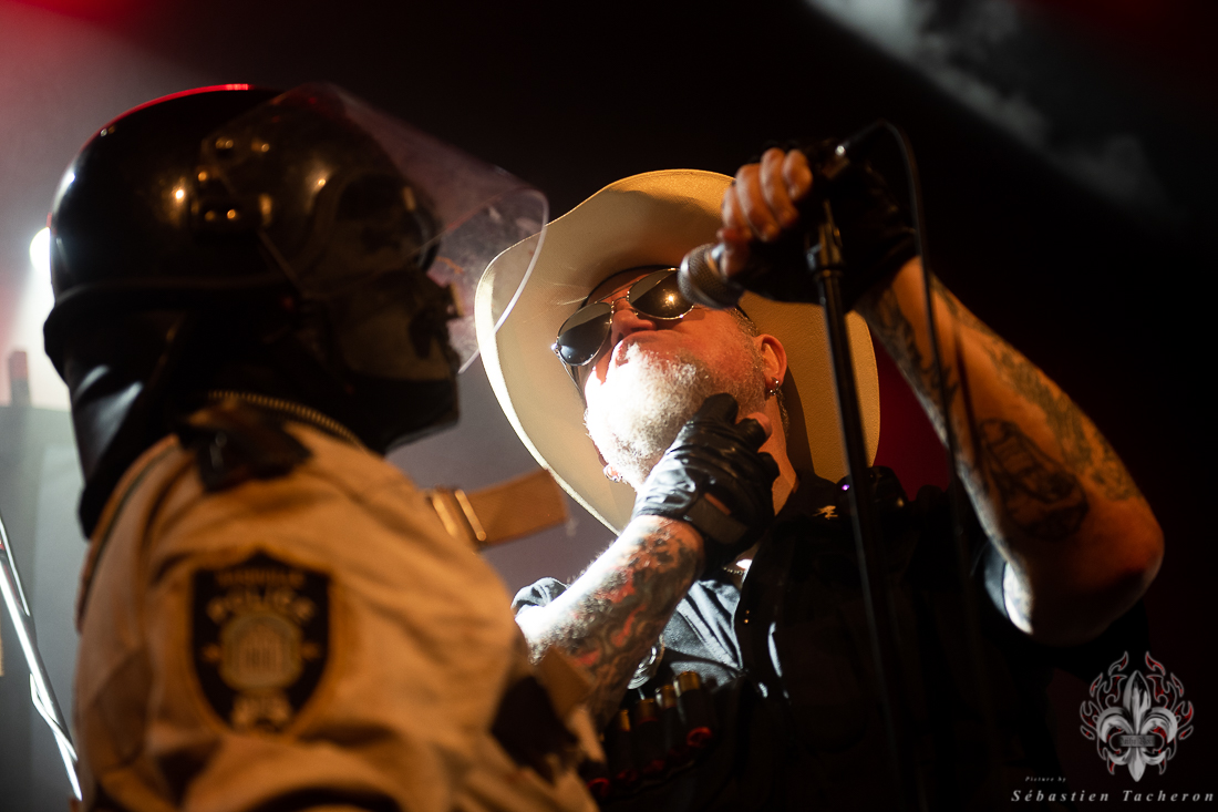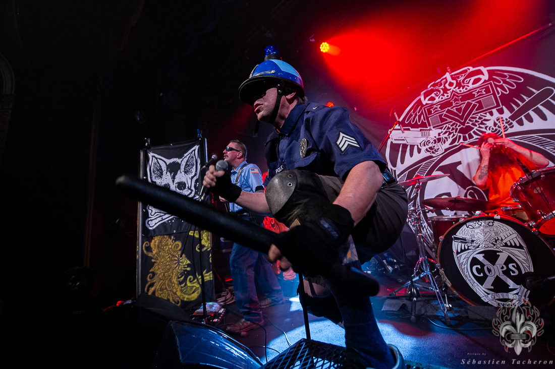 C’est le groupe X-Cops qui s’est chargé de mettre l’ambiance et de débuter cette soirée. En arrivant à la salle, je n’avais jamais entendu parler de ce groupe. Tous les musiciens sont habillés en policiers et le batteur, et un autre membre qui fait l’animation, sont quant à eux habillé en prisonnier. Leur musique est un mélange de punk hardcore mélangé au Métal qui fait du bien aux oreilles. Ça lance bien une soirée.