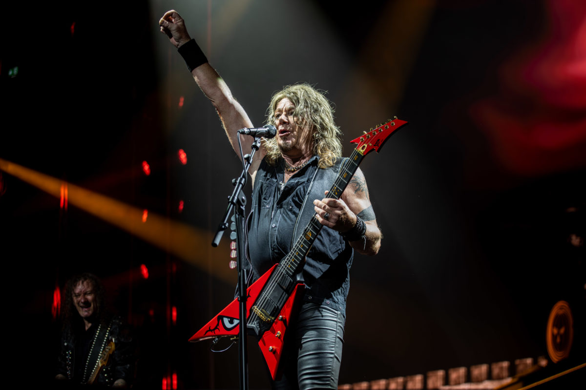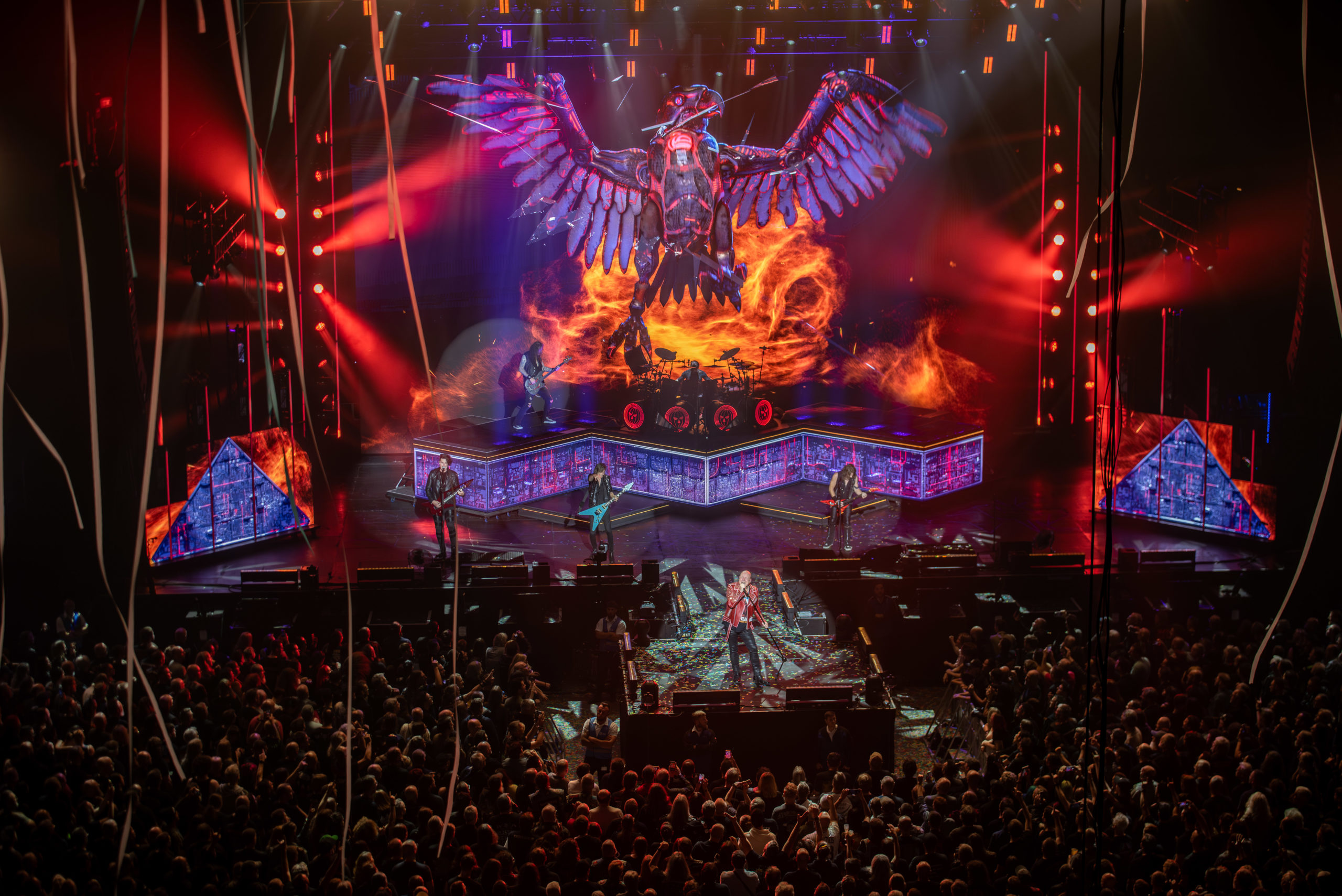 L’écran projette des animations d’une qualité bluffante. Et cette scène ! Une avancée impressionnante qui permet aux musiciens de venir chercher le public, de le regarder droit dans les yeux. Premier show de la tournée, précise le chanteur : « On s’est demandé si on avait déjà joué au Lux… non ? Vous, vous êtes déjà venus nous voir ? » La foule hurle en réponse. Comme s’explique le chanteur, à 60 ans on commence à avoir la mémoire qui flanche. Heureusement, il n’oublie pas encore les paroles. Et là, sur Ride the Sky, c’est la première explosion de confettis, un mur de serpentins qui retombe lentement sur un public déjà conquis. Sur I Want Out, même délire : une pluie de confettis, des cris, des bras levés, un moment suspendu. La salle entière chante à pleins poumons, et franchement, c’est beau à voir.