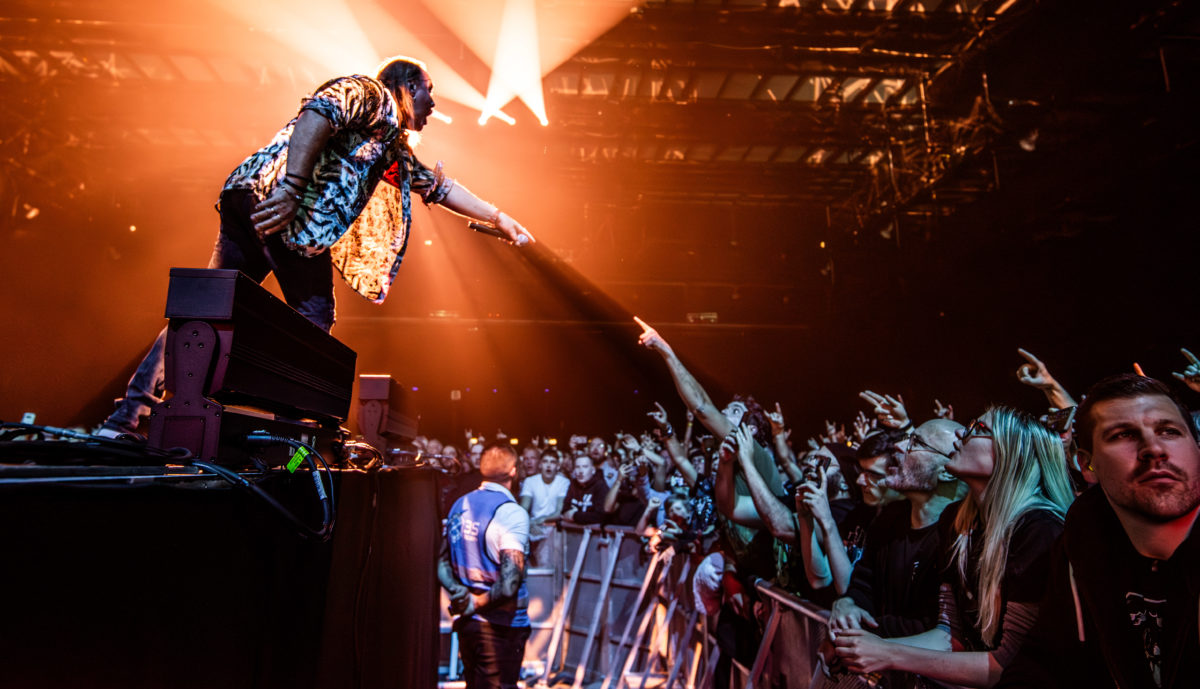 Et là, place aux maîtres. Formés en 1984, les papes du power metal allemand, les mythiques Helloween. Une entrée spectaculaire : pluie d’artifices, lumière orange, la fameuse citrouille qui se dessine lentement sur le mur de fond en LED. Il n’en fallait pas moins pour fêter les 40 ans du groupe et la première date de leur tournée ! Les cris montent, la tension explose. Les guitares se croisent, bam, le premier riff fend l’air. Un des gratteux, looké façon Synyster Gates, balance un solo qui met tout le monde d’accord. Après une chanson, l’écran s’anime : un personnage encapuchonné apparaît, mystérieux, presque théâtral, qui guidera les spectateurs tout le long du concert.