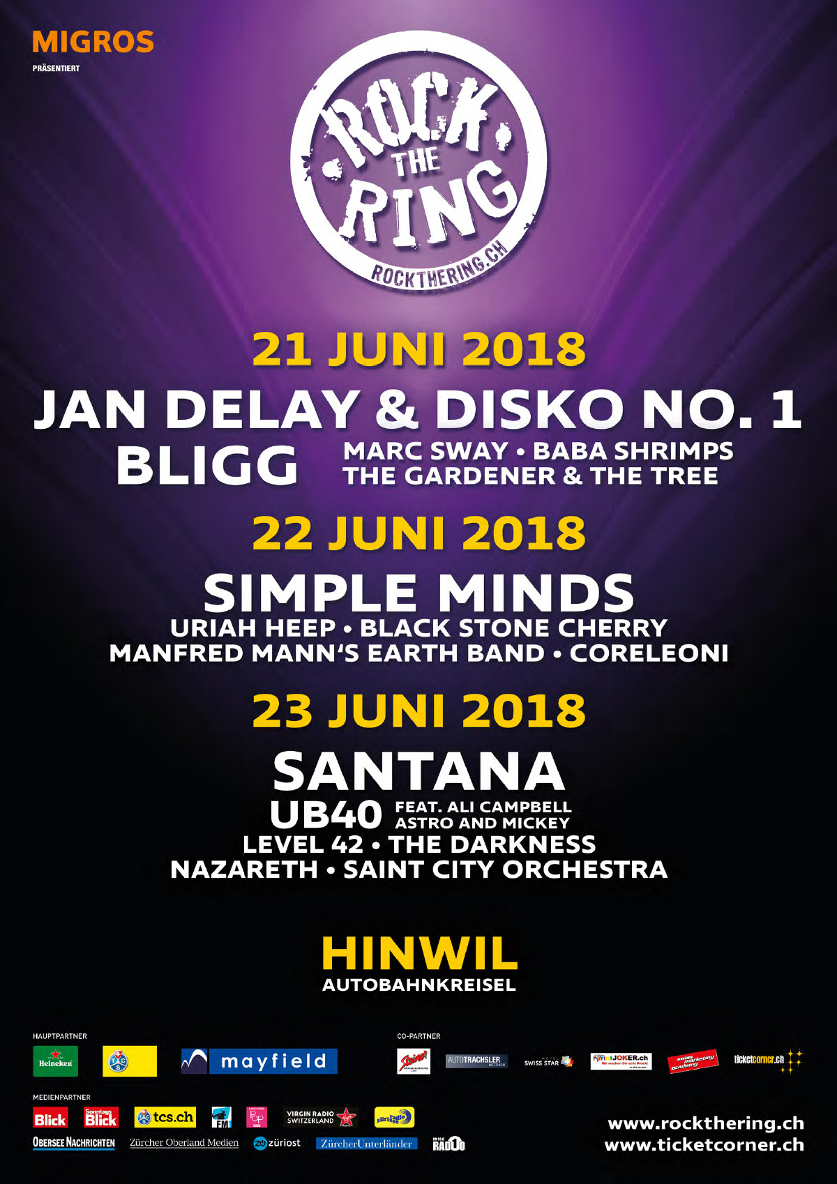 Le festival Rock The Ring arrive dans un petit mois, et propose une affiche tout aussi alléchante que celle de l’année dernière. Aux côtés de Jean Delay & DIsko N°1, Bligg, Simple Minds, le grand Santana, UB40 et bien d’autres mettrons le feu à toute la région zurichoise.
