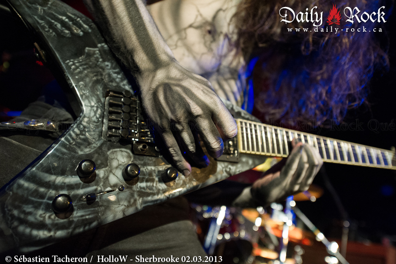 Hollow viennent nous donner le coup de grâce. C’est un groupe ma foi aussi très théâtral, mais dans un autre contexte. Quand on y pense bien, Sanguine Glacialis était un très bon groupe pour ouvrir pour eux, car leur contexte visuel sanglant et macabre va très bien avec celui de Hollow, qui est pour sa part squelettique (plus du côté du guitariste que les autres) et ténébreux. D’ailleurs, il semble y avoir une belle chimie entre les membres de Hollow et de Sanguine Glacialis. Je dis cela parce qu’en premier lieu j’ai vu leur batteur Blake donner un coup de main à Pascale de Sanguine Glacialis pour arranger la batterie. Ça va un peu de soi puisque c’est lui qui fournit le kit de base sur lequel elle a joué, mais d’un autre coté je crois qu’il n’est pas nécessairement obligé de faire cela, mais que c’est par professionnalisme et par générosité. Également, la claviériste de S.G portait une camisole de Hollow lors de la soirée. Le groupe Hollow ont une recette très intéressante, mélangeant des éléments du metal symphonique avec ceux du death metal et même du black metal. Leur thématique visuelle est intéressante, chacun a sa particularité, l’utilisation du sombre et du clair dans les maquillages donne un aspect chaotique, par exemple le guitariste a le torse entier maquillé en plus du visage, les os d’une cage thoracique y sont représentés. Les contrastes sont judicieusement utilisés dans les maquillages et tenues de scène des membres du groupe, ce qui donne un look vraiment accrocheur. Les gars de Hollow ont vraiment une énergie spectaculaire sur scène, en plus que leur matériel a vraiment beaucoup d’étoffe. L’énergie est communicative, la musique, mélodique et expressive, tantôt lourde tantôt rapide. Le guitariste est un musicien très habile, on peut sentir son expérience de son instrument, et sa capacité à nous présenter son matériel de manière solide tout en ayant une prestance scénique du tonnerre. Il est d’ailleurs également guitariste dans le groupe de death metal Québécois Your Last Wish. C’est compréhensible que ce soit eux qui ont gagné le concours local pour jouer sur la scène du Heavy MTL l’an dernier, car c’est vraiment un groupe distingué du lot et leur style est accessible en plus d’être brillamment développé. Il y a de très beaux contrastes entre le mélodique et l’aspect sombre dans la pièce « Vlad ». Particulièrement au moment ou il y a un passage qui sonne très mélodieux pendant lequel le bassiste (Snow) fait un « tapping » sur sa basse. Il faut le préciser, Vlad est en fait le nom de leur ancien bassiste qui est décédé depuis 2007, donc j’imagine que cette chanson est une sorte d’hommage à Vlad. Certains passages de la pièce me rappellent un peu Stratovarius et Kalmah en même temps. Quand vient le temps de la pièce « Birth », le chanteur appelle une de leurs acolytes à se joindre à leurs rangs. De qui s’agit-il? C’est Maude, la claviériste de Sanguine Glacialis. Je saisis d’avantage maintenant, la raison pour laquelle elle portait les couleurs de Hollow. En plus d’être un support pour les artistes avec qui elle partage la scène au sens figuré, c’est possiblement aussi une sorte d’uniforme pour partager la scène avec eux au sens propre du terme. Sa participation au vocal seulement apporta une dimension intéressante dans le son de Hollow. On a droit a un duo de vocal auquel on ne s’attendait pas, commençant par des échanges et plus tard les deux chantent ensemble. On a droit aussi à un moment dramatique lorsqu’elle s’effondre après avoir poussé un cri de mort. Elle reste là, gisant sur le sol quelques instants alors que le chanteur poursuis seul, puis se relève avec la gestuelle d’une personne en pleine agonie, se tiens debout et droite à nouveau et relance sa puissante voix de plein fouet sur le public. C’est franchement un duo bien combiné, les deux voix se soutiennent très bien. Ce fut un spectacle qui vient clore très bien une soirée pendant laquelle chacun des groupes nous en ont mis plein la vue.