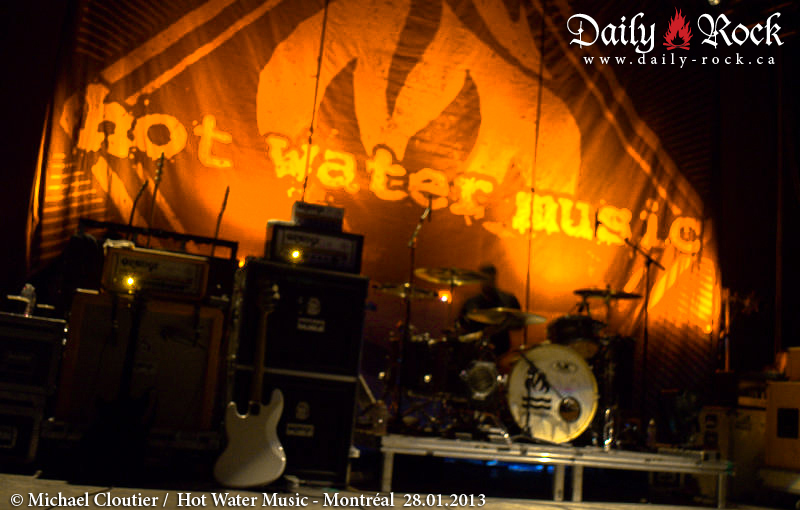 Après plus d’une demie heure d’attente, les gens, affaiblis, s’étant assis au parterre se relèvent finalement pour accueillir la légendaire formation de la Floride, et j’ai bien sûr nommé; Hot Water Music. Nous nous rappelons de leur dernier passage à Montréal, assurant la première partie de Rise Against, en septembre dernier au Centre Bell. Les gars, maintenant “headliner” ont ainsi mis le paquet avec une bannière gigantesque à leur effigie et une intro décousue permettant au groupe d’embarquer tranquillement sur la scène. Toutefois, soyez tranquille, le groupe est resté fidèle à lui-même et nous a offert une prestation sobre et sans artifice, mais avec une fougue et une passion qui se reflète jusqu’aux fins fonds de l’Olympia. La salle n’avait pas ouvert le deuxième étage et c’est donc sur un plancher bien comblé, que le quatuor nous ont servi quelques pièces du premier album en 8 ans; Exister. Entre autre Drag my Body et State of Grace, ont bien su faire lever la foule mais, on voyait bien que les vieux de la vieille s’étant déplacés pour l’occasion en demandaient plus pour leur vieux “stock” justement! Ils nous ont alors, généreusement, brassé la sauce en nous enfilant : Remedy, Trusty Chords, Rooftops, Paper Thin, de bons vieux classiques dont nous étions tous assoiffés. Je me dois aussi de glisser un mot à propos de ce, les demoiselles comprendront ici mon choix de qualificatif, délicieux Chuck Ragan. Ma foi, quel homme! Avec sa voix plus rauque que jamais qui le rend parfois presque inaudible, ses cheveux en bataille et sa barbe non-rasée, son énergie débordante à laquelle nous ne pouvons que répondre à en demandant encore et encore, le co-leader de la formation est dans une forme impitoyable. Il se touche le cœur à plusieurs reprises, nous darde de remerciements auxquels nous nous accrochons, disons-le nous, tout un performeur qui a bien sa place sur scène. Finalement, 50 minutes après la première chanson, le groupe se retire pour revenir sur les planches et nous offrir un rappel de trois “tounes”! Quelle ambiance! Sommes toute, j’ai juste envie de les prendre dans mes bras et de leur dire, please, ne partez plus pour si longtemps…