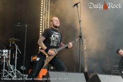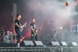 Viennent ensuite les gars d’Herod. Là, on n’est plus dans le délire de la veille avec des butterfly et du teen rock partout. C’est carrément du lourd, voire même un peu trop. Peut-être était-ce à cause des contraintes liées au plein air et/ou au plafond sonore légal de 93 dB, mais le son paraissait vraiment trop compressé, les deux huit cordes peinaient à se détacher du bourdonnement général et que dire de la batterie, qui faisait figure de boite à rythme en fond. La prestation, elle, était nickel, une énergie monstrueuse qui faisait tout de même bouger quelques têtes et générait quelques pogos.