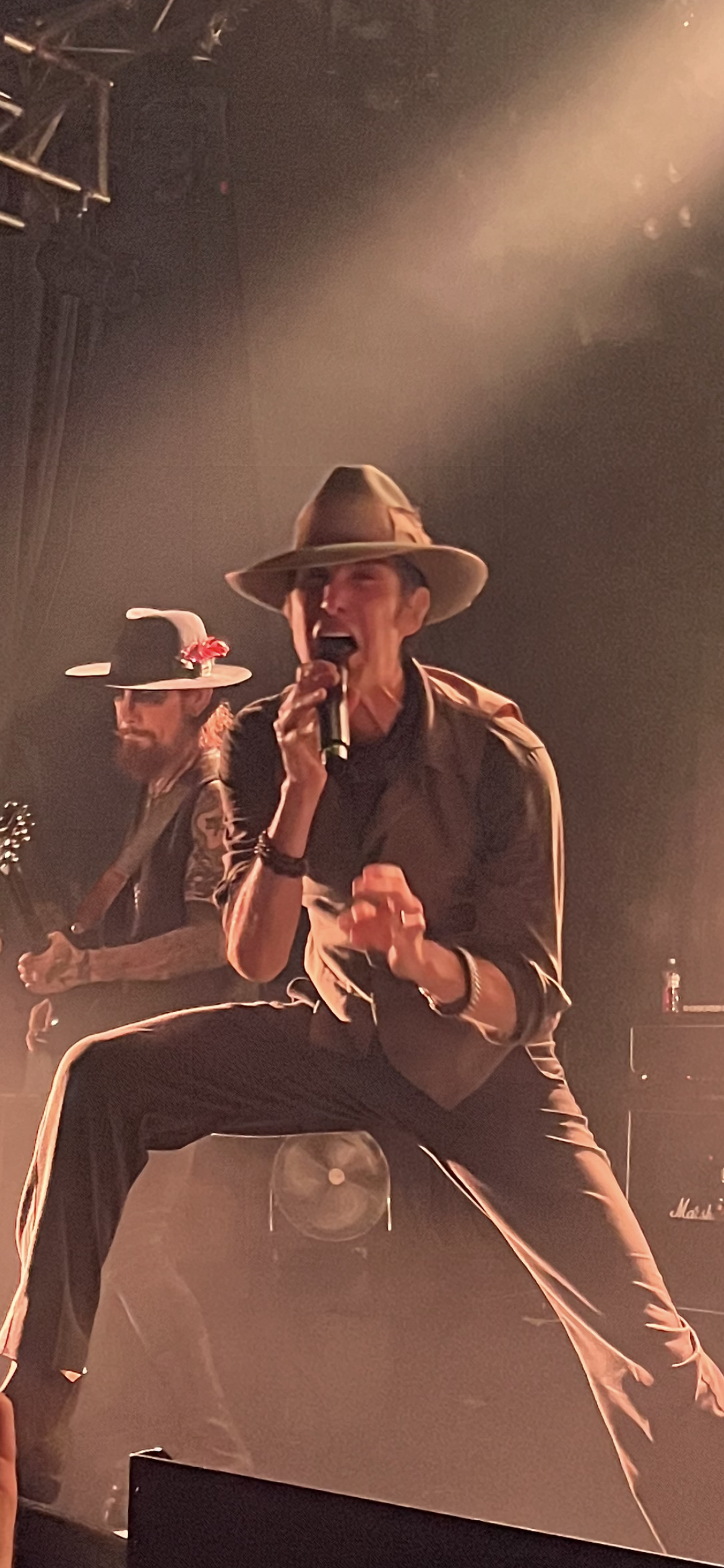 Les Docks sont chauffés à blanc quand le groupe entre sur scène et lance les premiers accords de ‘Kettle Whistle’. Perry Farrell apparaît alors, élégamment vêtu d’une chemise – gilet – pantalon sable et d’un stetson à la Indiana Jones, bouteille de vin à la main. Cool, souriant, le chanteur lifté évolue sur la scène en se balançant doucement et en suivant la section rythmique. Il apprécie chaque seconde, se charge de l’énergie donnée par les fans. La machine est lancée et les titres mythiques s’enchaînent : ‘Whores’ et ‘Had a Dad’ qui dépotent, ‘Ain’t No Right’ et sa ligne de basse imparable, incroyable version de ‘Pigs in Zen’ avec un Dave Navarro en feu à la guitare.