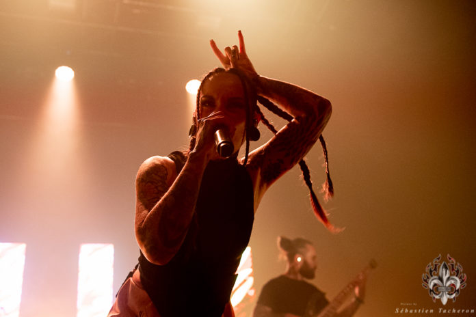 C’est Born Of Osiris, qui fait dans le Deathcore et qui est originaire de Palatine, dans l’Illinois, qui lance la soirée. Mis à part le nom qui me semblait vaguement familier, je n’avais jamais entendu ni vu ce groupe sur scène. Je dois être honnête, je n’ai pas accroché malgré le fait que ça joue super bien. Il y a de bons moments dans leur musique et le chanteur y est excellent, mais… ce genre de Metal ne me touche pas, je le trouve froid. Peut-être est-ce que j’ai l’impression qu’il y a beaucoup de pistes d’instruments supplémentaires, ce qui éloigne pour moi la magie du live. Cela dit, c’est mon point de vue.