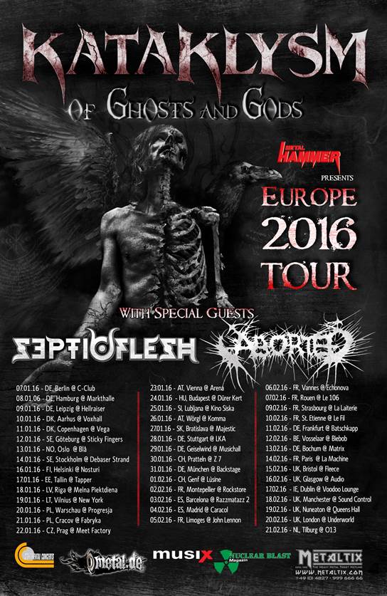 “Cela fait un petit moment que l’on a pas fait la tournée des clubs en Europe, et la dernière fois a été memorable. Cette fois on revient plus fort que jamais pour presenter notre album “Of Ghosts and Gods” avec quarante quatre show à travers le vieux continent” a déclaré Maurizio Iacono, le chanteur de Kataklysm.
