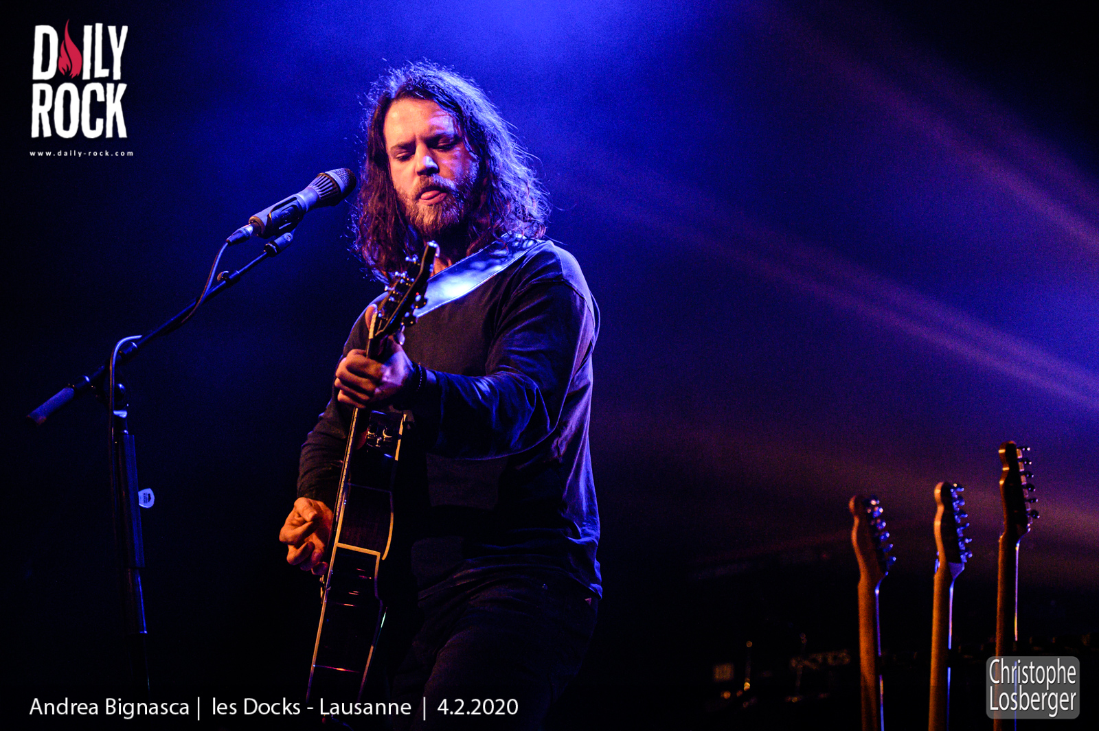 Andrea Bignasca (vocals, guitar, percussions). Andrea Bignasca @ Les Docks, Lausanne, Switzerland, 04.02.2020. (c) Christophe Losberger
