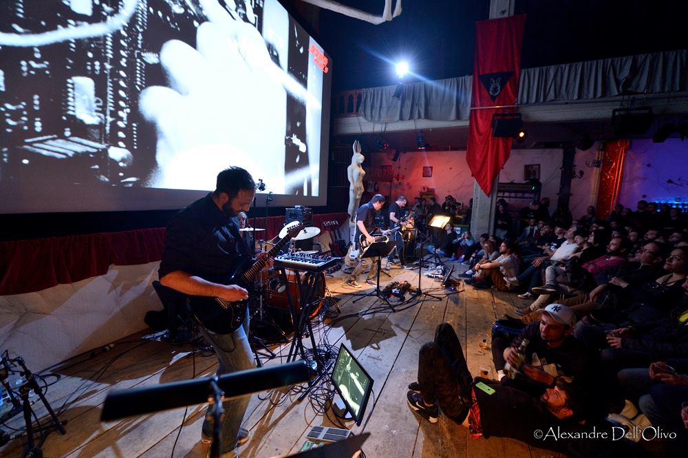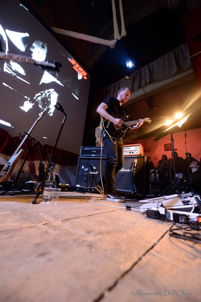 Dès le générique, le groupe balance du lourd et du décibel. La partie n’est pas gagnée pour le mathématicien Max Cohen, qui tente de trouver une séquence permettant de déchiffrer la bourse. Et ça ne va pas en s’améliorant, gare à la surchauffe cérébrale. Killbody Tuning accompagne, réinterprète la lente descente aux enfers du jeune Icare qu’est Max Cohen. La musique apporte une lourdeur et ferme les issues pour le spectateur, prisonnier avec son héros et condamné à voir et entendre, jusqu’aux dernières secondes. Le piège ‘Killbody Tuning’ nous prend aux tripes, interagissant avec le film jusqu’à presque percer l’écran par moment, comme lorsque Max, dans une crise, perçoit un son strident et se retourne pour regarder le spectateur ; le son étant joué par les gaillards de groupe. Les passages magistraux où le personnage sombre dans ses crises nous entraine avec lui dans une violence cérébrale amplifiée par le son du quatuor chaux-de-fonnier. Le jeu est posé avec précision sur l’image et ne laisse percevoir que par moment les dialogues du film ; pour ceux qui comme moi n’ont jamais vu « Pi » auparavant, les sous-titres sont une aide appréciée, même s’il est aussi possible de se laisser aller au rythme des images et de les prendre sans explication, à la manière d’un clip vidéo narratif géant.