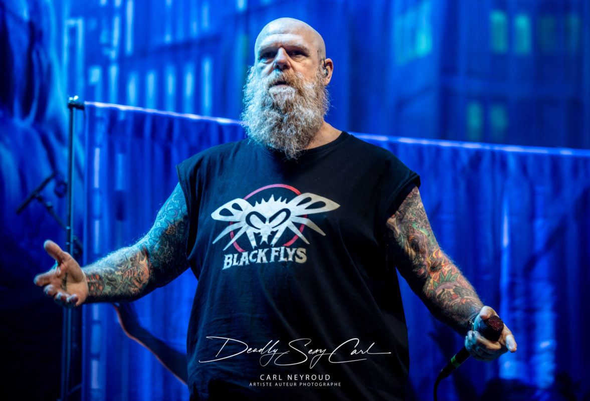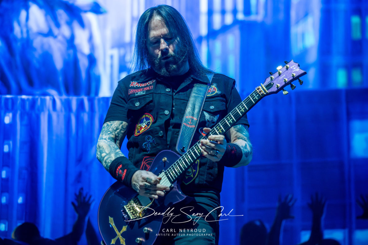 19h02, le groupe Exodus monte sur scène. Formé en 1979 en Californie, Exodus appartient à cette génération fondatrice du thrash metal, celle qui a façonné un style nerveux, rapide. Dans la salle, « We Will Rock You » de Queen résonne, puis la lumière s’éteint brusquement. Sur scène, les silhouettes apparaissent, cheveux longs en cascade pour la plupart, sauf le chanteur, qui impose une présence différente, compensant cette absence de crinière par une barbe imposante. Très vite, il engage le public, joue avec lui, installe un jeu de tension avec ces « hey oh » lancés comme des défis, puis cette phrase, un peu piquante, un peu calculée aussi : « Why are you so silent? I don’t think you deserve us. » Forcément, la réaction ne se fait pas attendre, le pit s’ouvre, encore timide au départ, ce qui lui vaut une nouvelle remarque, presque moqueuse, comme pour attiser davantage la foule. Le groupe enchaîne et glisse un clin d’œil évident à Slayer avec « Raining Blood ».