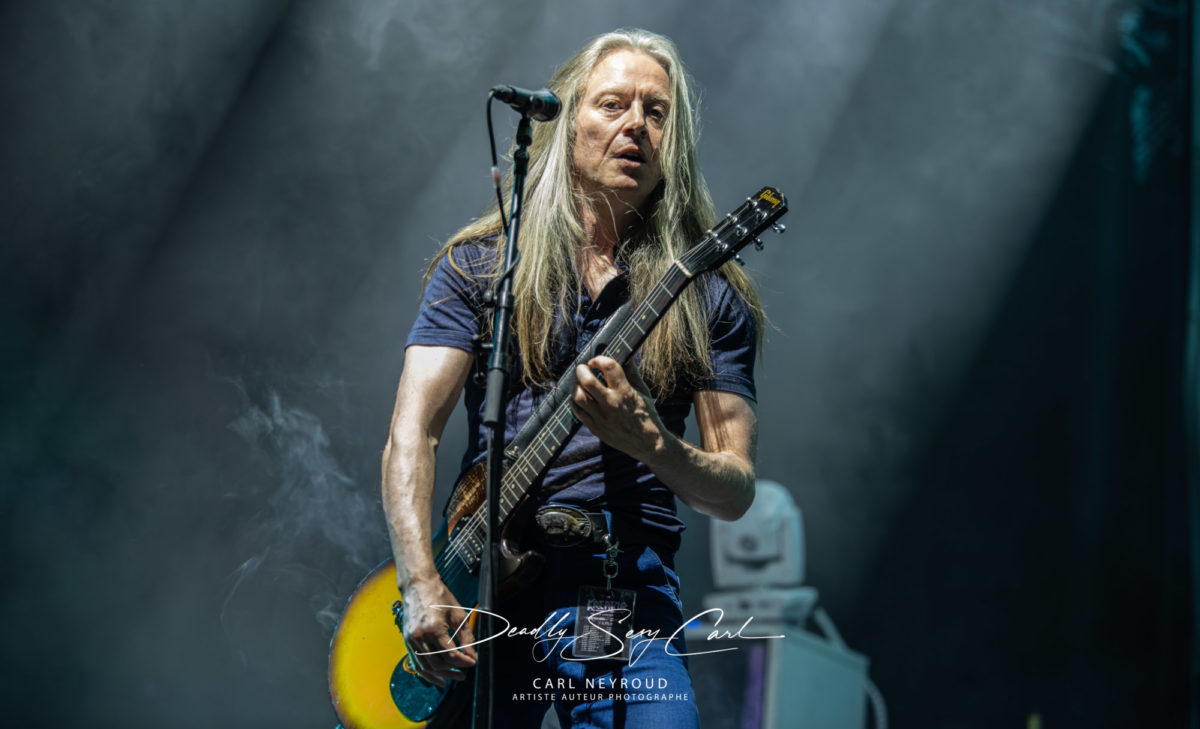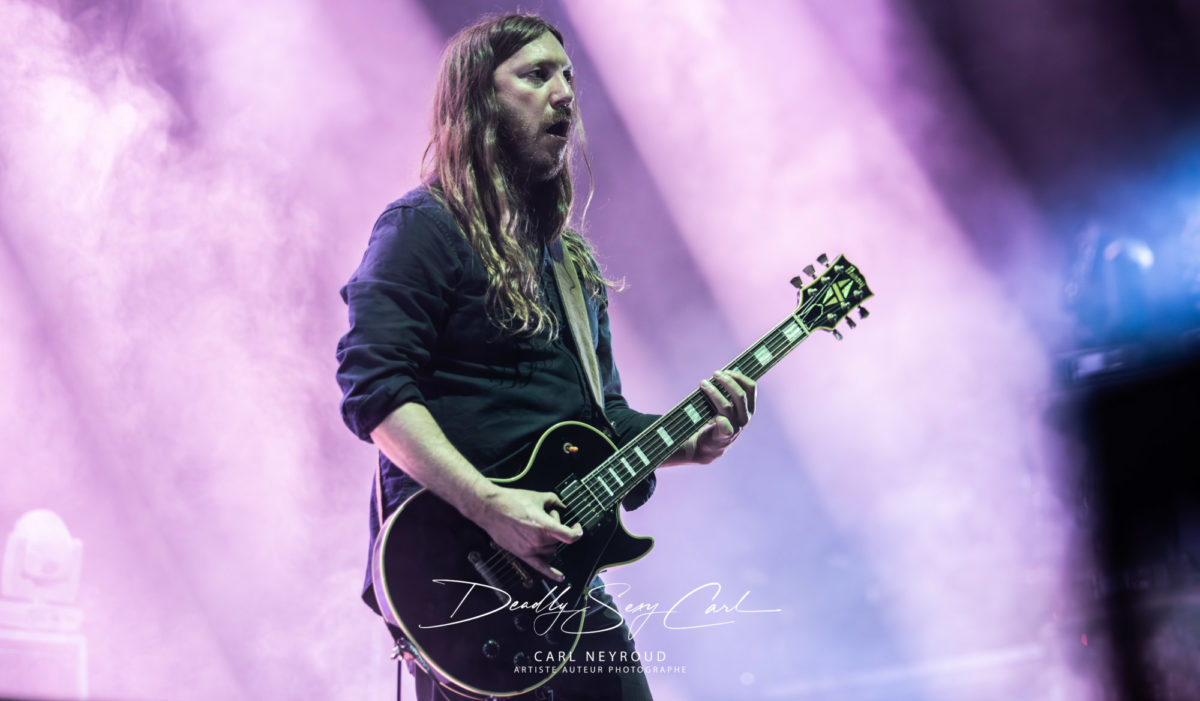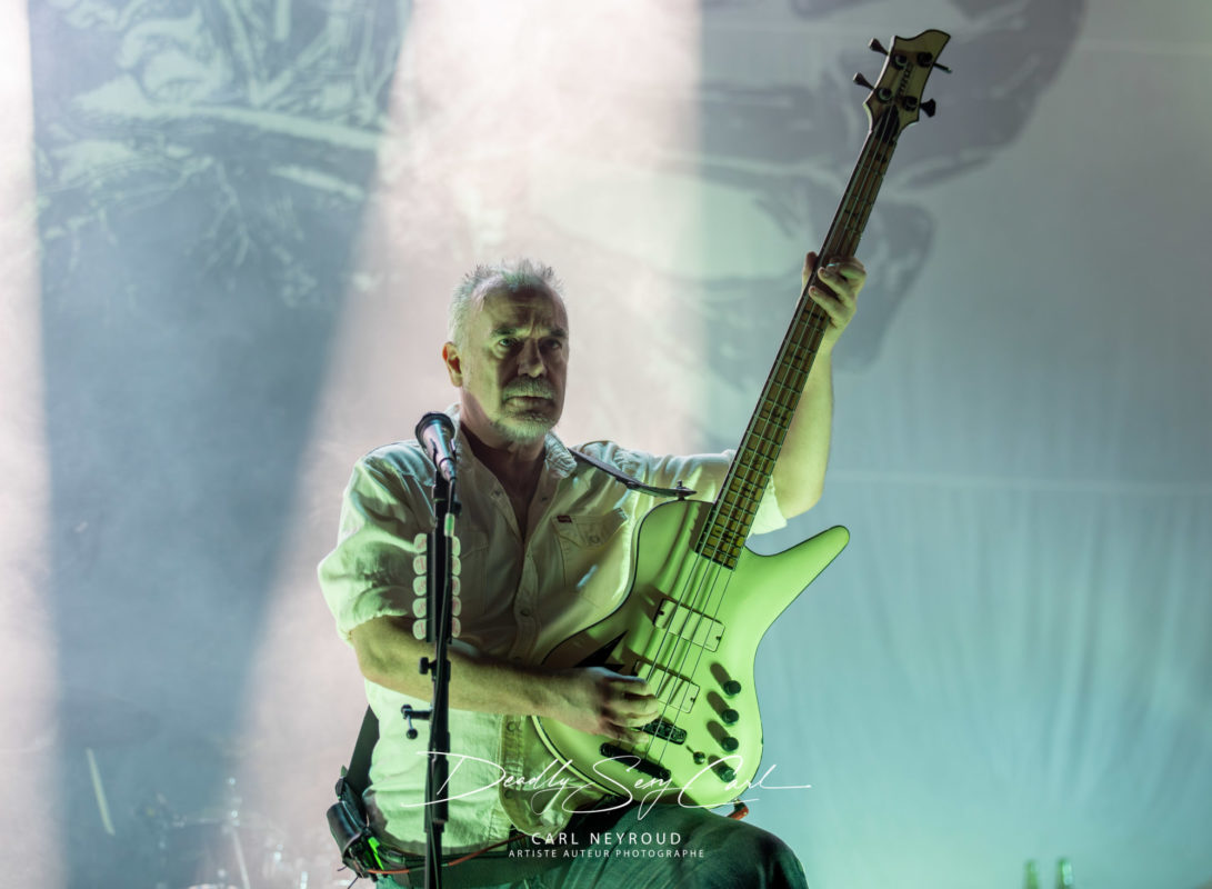 En suite c’est au tour de Carcass. Formé en 1985 en Angleterre, Carcass, pionnier du grindcore avant d’évoluer vers un death metal plus mélodique, notamment avec « Heartwork », album devenu culte, qui marque un tournant esthétique et sonore. Dès les premières secondes. Durant le set la scène est envahie de fumée, épaisse, persistante, qui brouille les contours, adoucit les lumières et crée une atmosphère lourde, comme si le concert se déroulait dans un espace confiné.