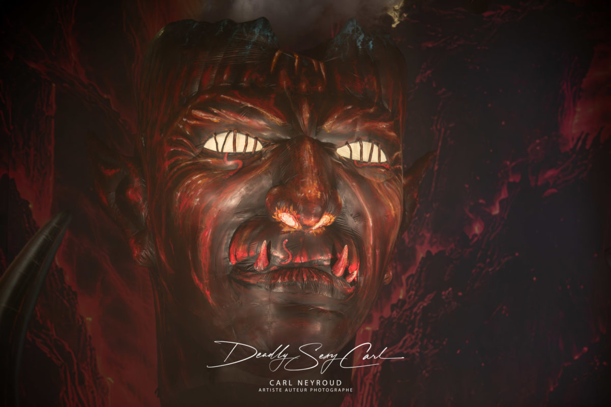 Le décor se dévoile, massif, spectaculaire, presque démesuré, dominé par une gigantesque tête de diable suspendue au-dessus du batteur, dont les yeux s’illuminent tandis que le sommet du crâne ouvert laisse s’échapper des volutes de fumée, comme une créature vivante. Cette structure occupe toute la largeur et la hauteur du plateau et constitue l’élément central du dispositif visuel. Le batteur, justement, est installé au cœur d’une paire de cornes monumentales, renforçant encore cette impression d’immersion totale. Autour, les éléments s’accumulent, presque à l’excès, des corps suspendus au-dessus de la scène, des pieds de micro ornés de têtes empalées, deux immenses figures démoniaques de chaque côté, comme figées dans un cri, des croix lumineuses suspendues, et ces flammes puissantes qui surgissent régulièrement, ponctuant les morceaux avec une intensité spectaculaire.