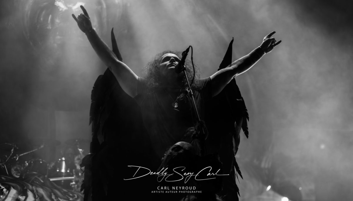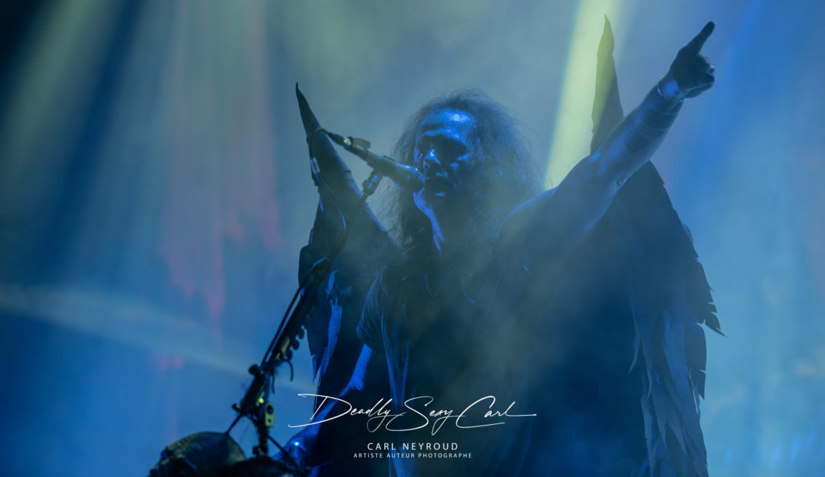 Dès le troisième titre, un wall of death est demandé, presque prématuré, comme pour tester immédiatement la réactivité du public, suivi d’une explosion de confettis, contraste saisissant entre violence et fête. Sur « Loyal to the Grave », le chanteur apparaît avec des ailes noires, ajoutant une dimension encore plus théâtrale à la performance, tandis que des figures masquées, évoquant sans le vouloir le célèbre Fantômas (pour les ceux qui ont la référence), traversent la scène avec des torches enflammées, allant jusqu’à embraser deux corps momifiés suspendus, dans une mise en scène assumée, provocante. Un moment plus inattendu survient avec l’arrivée d’une chanteuse, Britta, sur le titre « Tränenpalast », apportant une respiration différente, au milieu de cette déferlante sonore. Le concert s’achève sur un dernier wall of death, suivi une nouvelle fois d’une explosion de confettis, comme un point final spectaculaire, presque excessif, mais totalement assumé.