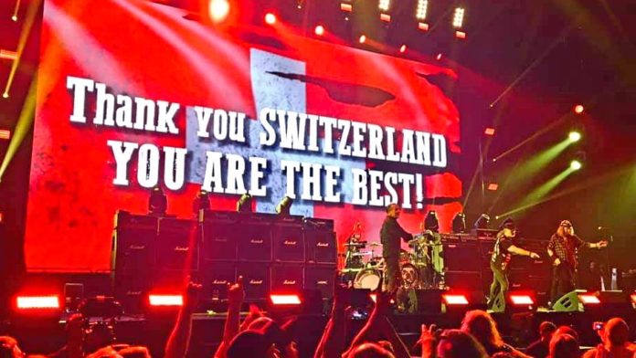 Direction Oerlikon pour pénétrer dans cette arène surchauffée …. « Bizarre en entrant dans une patinoire ! ». Cela faisait longtemps que je ne m’étais pas senti si jeune lors d’un concert … tous les fans suisses de rock se sont donnés rendez-vous pour dire « Adios Amigos » à ce groupe de légende, le plus grand groupe suisse de rock : 45 ans d’histoire retracée dans un joli film en ouverture du concert (quelques fans l’ont trouvé trop long à leur goût et ont commencé à siffler) qui relate leurs débuts à Soleure jusqu’à cette apothéose zürichoise, en passant par leurs années de folies aux USA, où ils furent nommés, en 2003, citoyens d’honneur de la ville de Memphis (Tennessee), rien que ça !