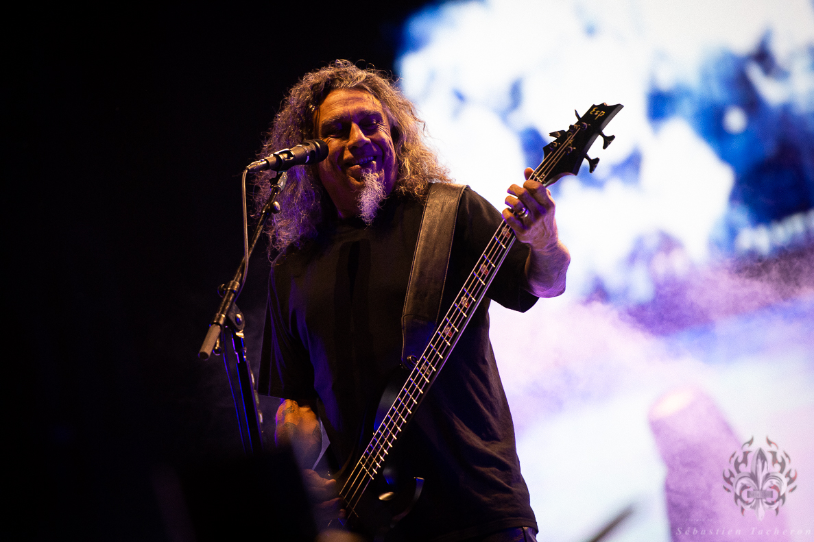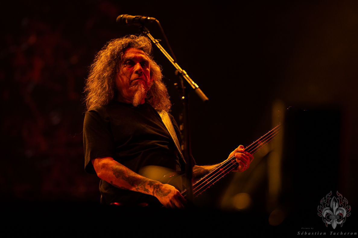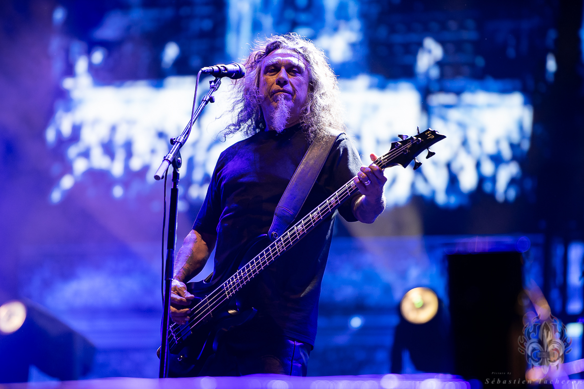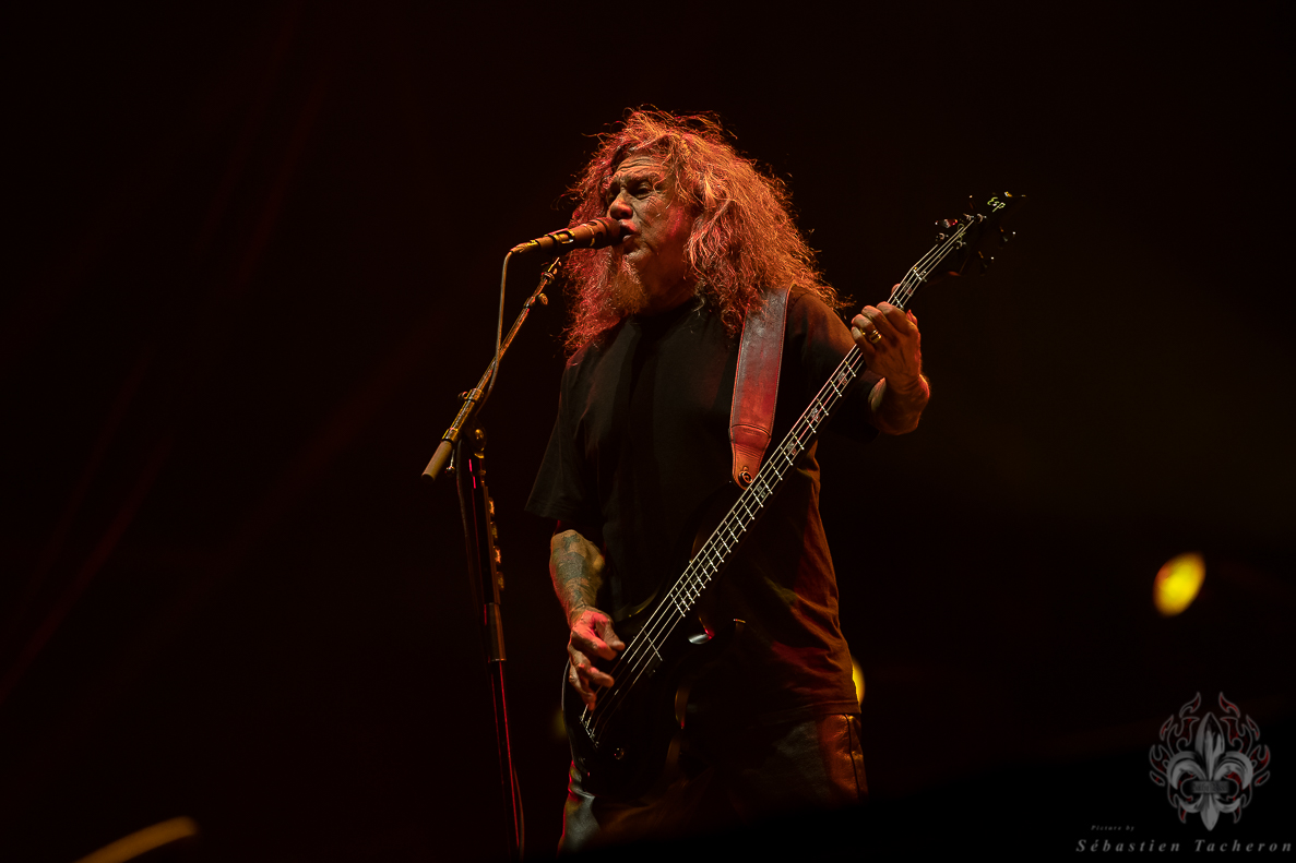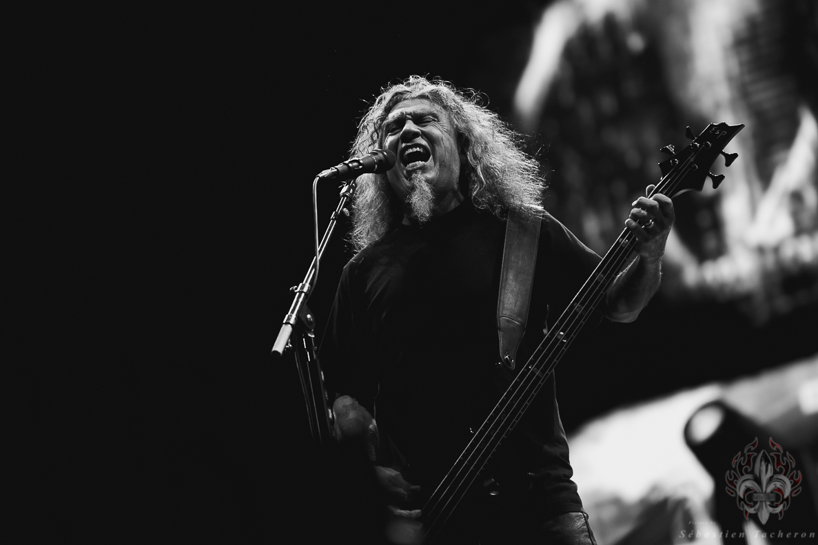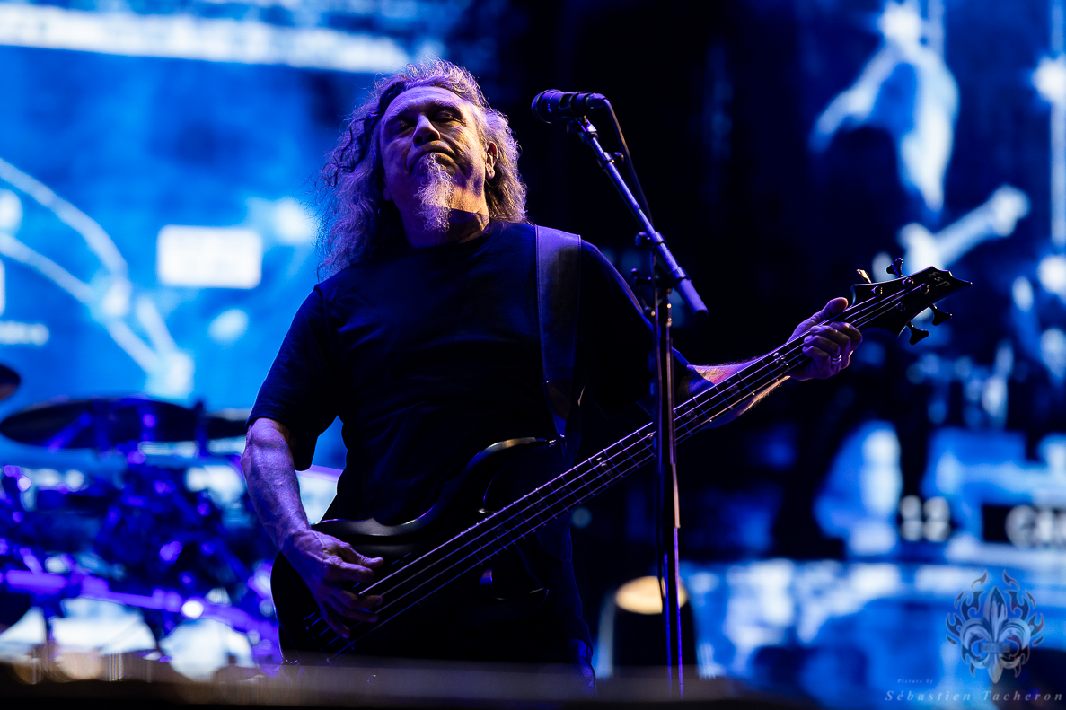 Avant Dead Skin MaskTom Araya a remercié tout le monde avec deux ou trois mots en français et a pris une grande respiration, comme s’il absorbait l’énergie du public. Si ce titre est lourd et malsain, avec ses projections morbides sur les écrans, il permet, si on peut dire ça, à la foule de se reposer un peu. Mais pas pour longtemps, car arrivent Hate WorldwideSeasons in the Abyss ou encore Hell Awaits.