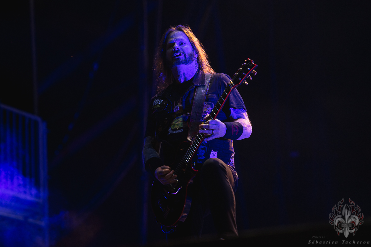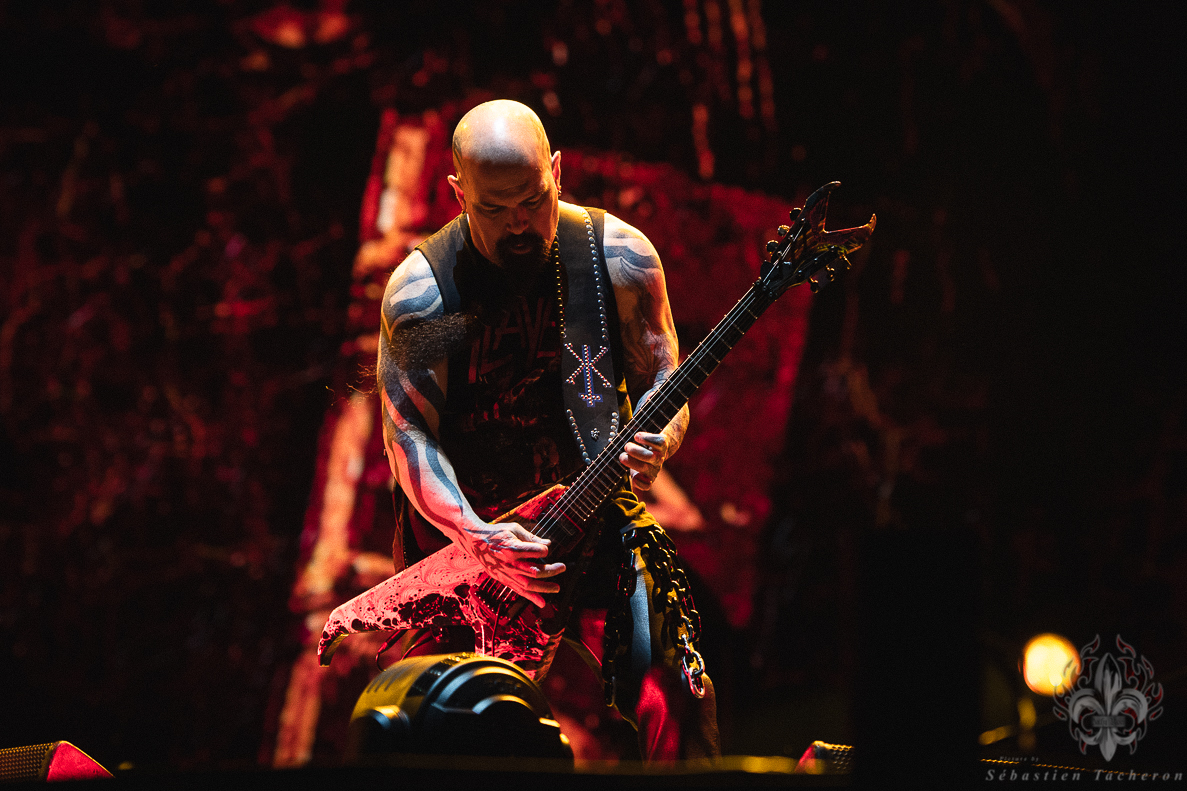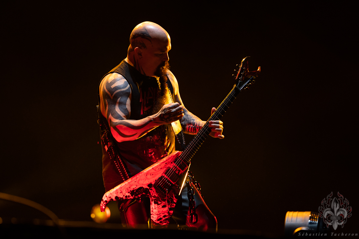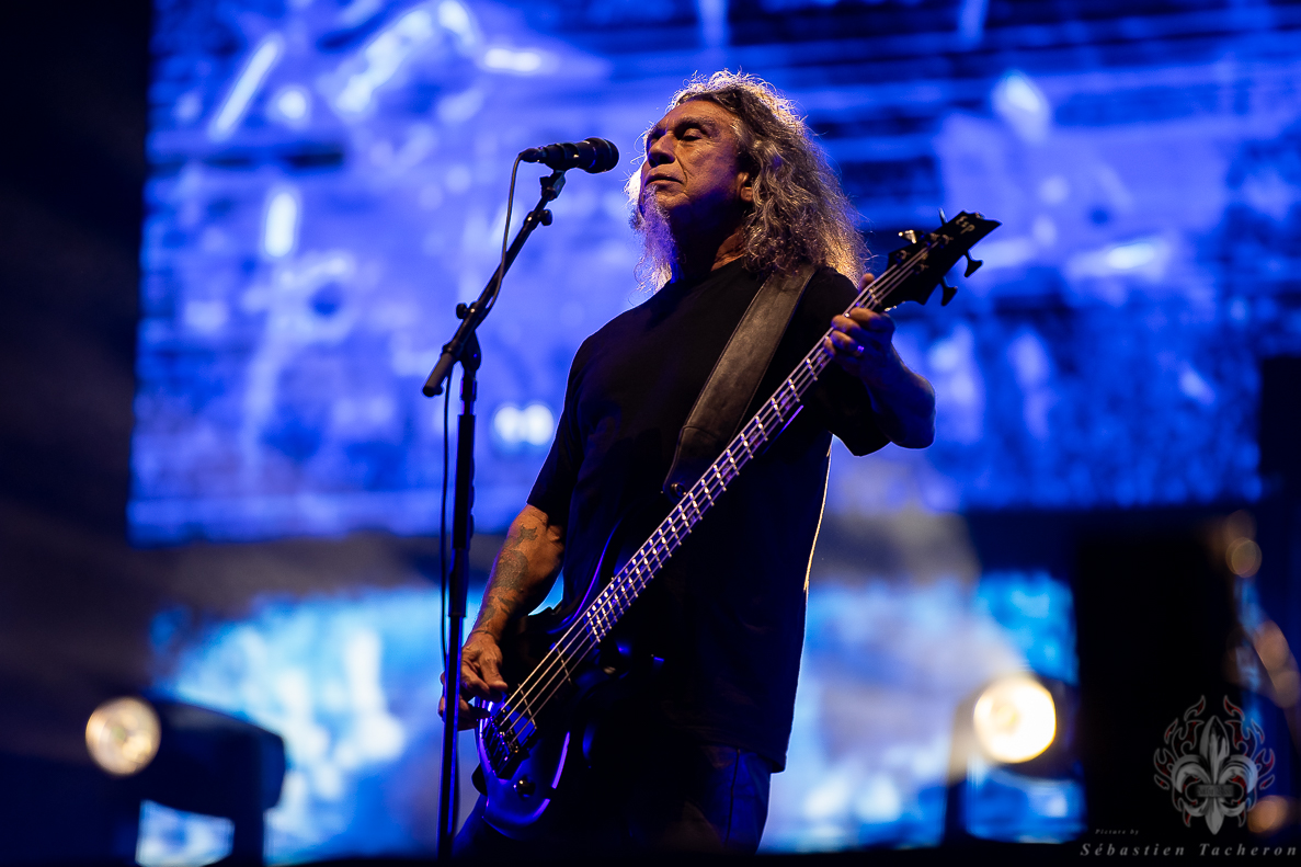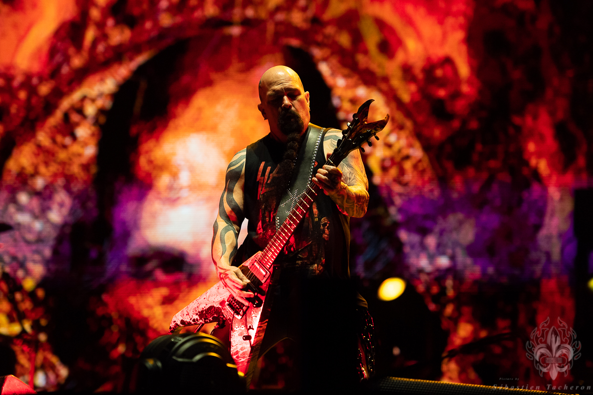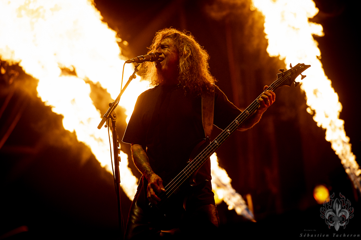 Avant Dead Skin MaskTom Araya a remercié tout le monde avec deux ou trois mots en français et a pris une grande respiration, comme s’il absorbait l’énergie du public. Si ce titre est lourd et malsain, avec ses projections morbides sur les écrans, il permet, si on peut dire ça, à la foule de se reposer un peu. Mais pas pour longtemps, car arrivent Hate WorldwideSeasons in the Abyss ou encore Hell Awaits.