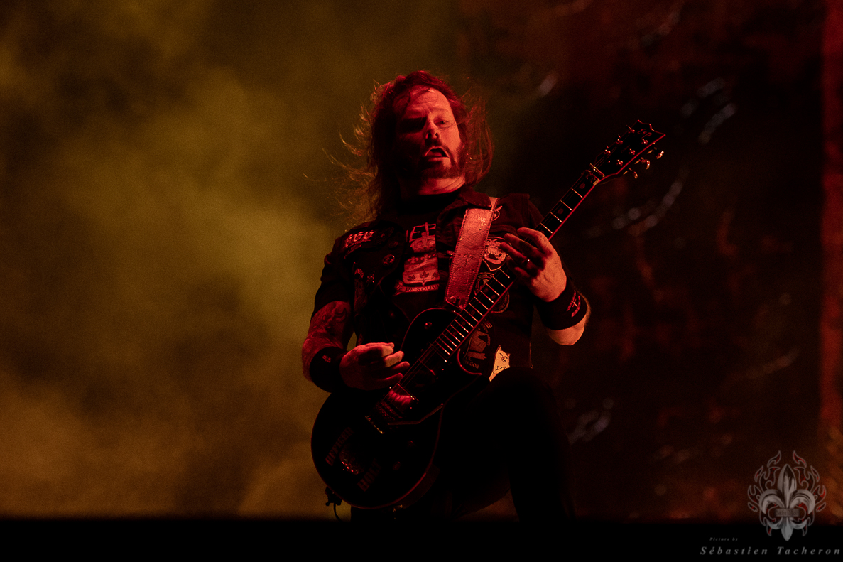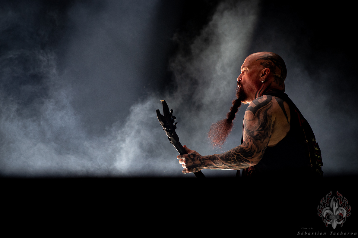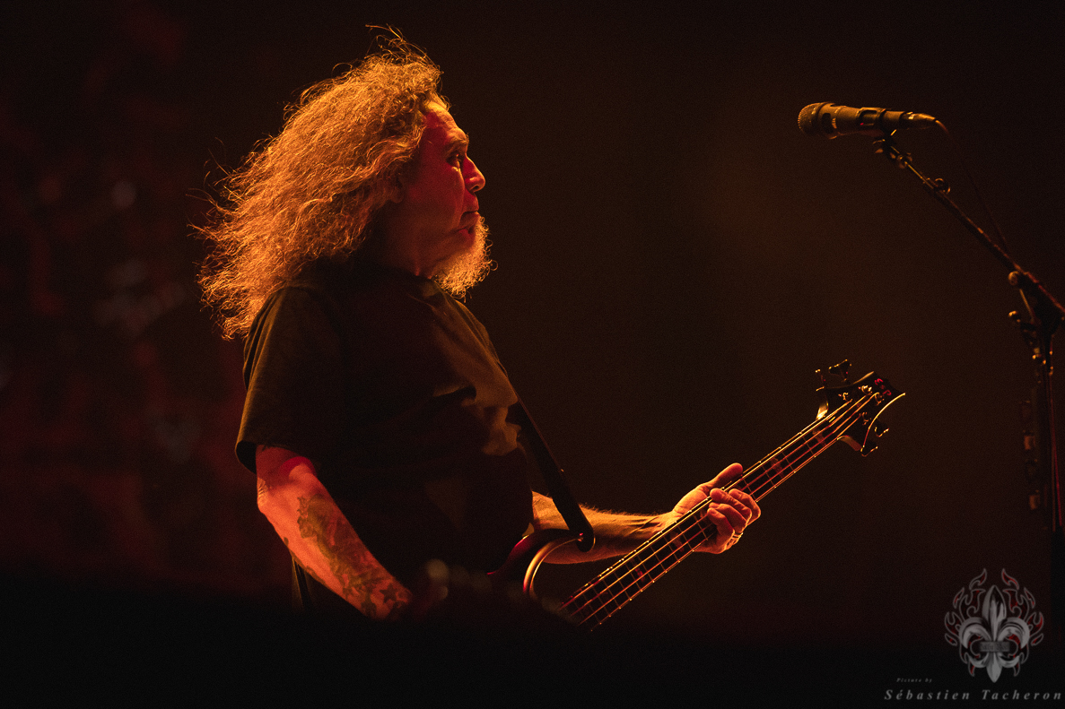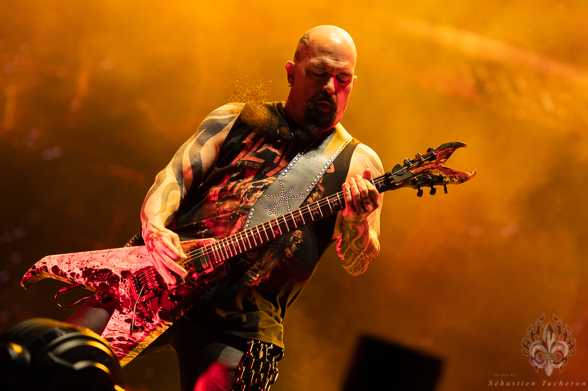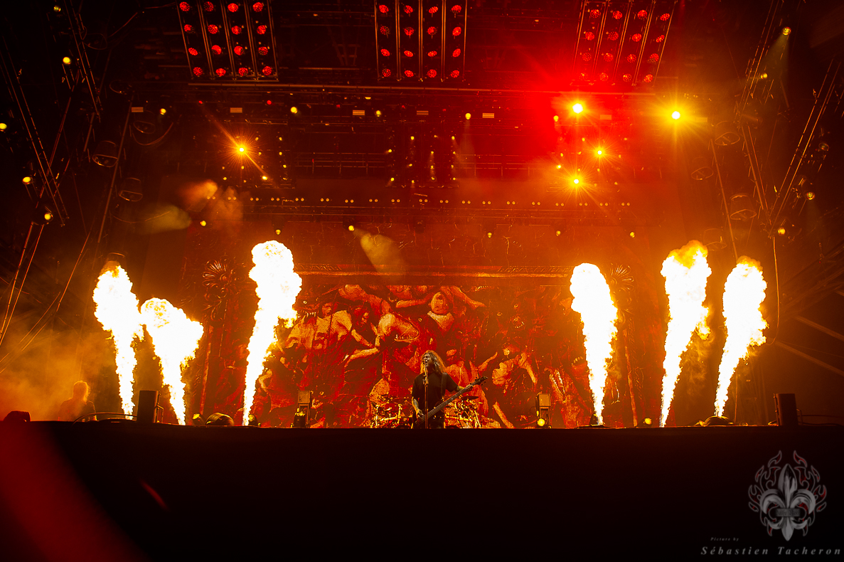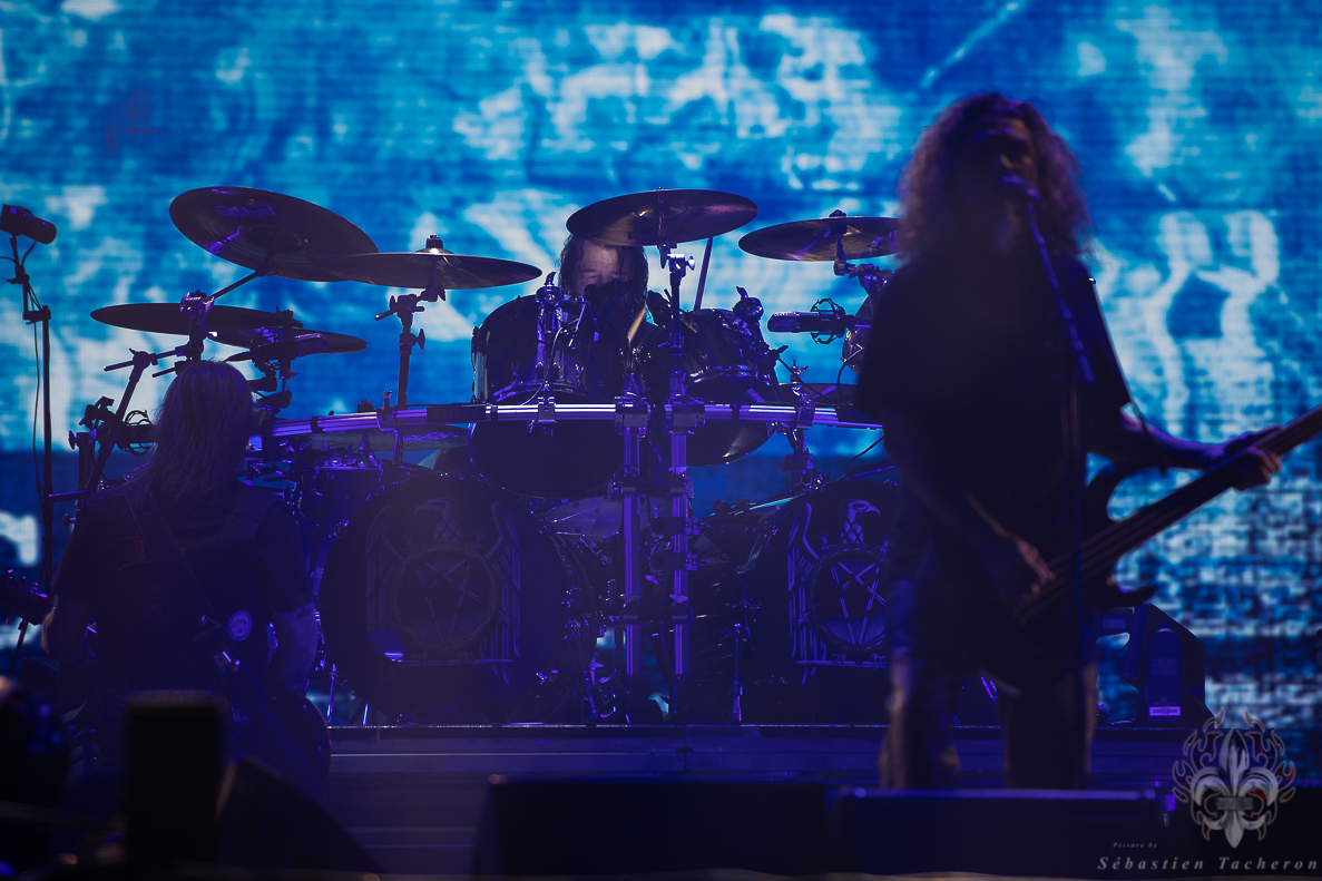 Avant Dead Skin MaskTom Araya a remercié tout le monde avec deux ou trois mots en français et a pris une grande respiration, comme s’il absorbait l’énergie du public. Si ce titre est lourd et malsain, avec ses projections morbides sur les écrans, il permet, si on peut dire ça, à la foule de se reposer un peu. Mais pas pour longtemps, car arrivent Hate WorldwideSeasons in the Abyss ou encore Hell Awaits.