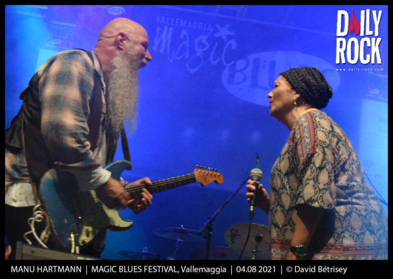Au tour de Manu Hartmann de nous emmener dans son univers de Soul, rythm’n’blues, quelque part entre Etta James et Janis Joplin, une voix puissante qui l’avait fait gagner le Swiss Blues Challenge en 2018 et elle avait même atteint les demi-finales à Memphis, respect ! A noter son guitariste, de secours et de luxe, à ses côtés, M. Philipp Bluedög Gerber (Backliner et ami de Krokus et Gotthard…), qui a mis quelques notes de rock dans ce show, vraiment pas pour me déplaire, un chouette moment.
