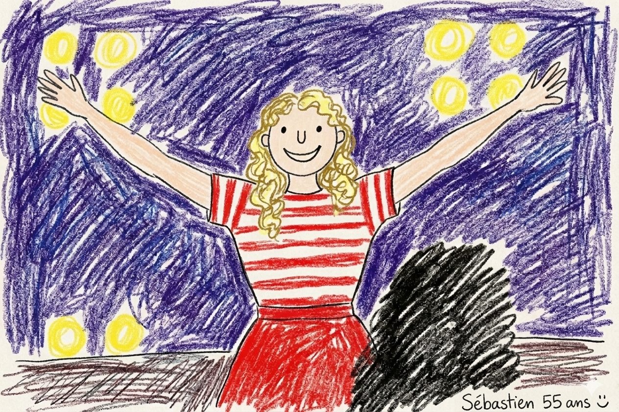Sur scène, elle ressemble à une petite fille qui aurait trouvé un micro et décidé que tout ce qui lui traverse l’esprit mérite d’être dit. Elle sourit comme si elle venait de faire une bêtise, court partout comme un enfant hyperactif et laisse des silences tellement bien placés qu’on ne sait plus si on doit rire… ou appeler un thérapeute.