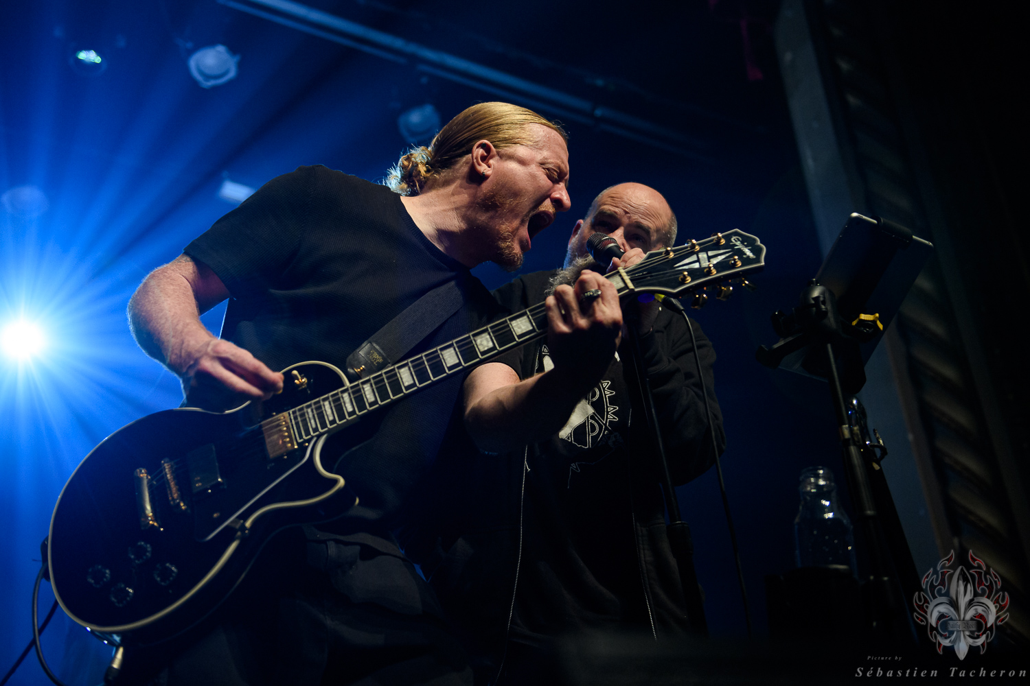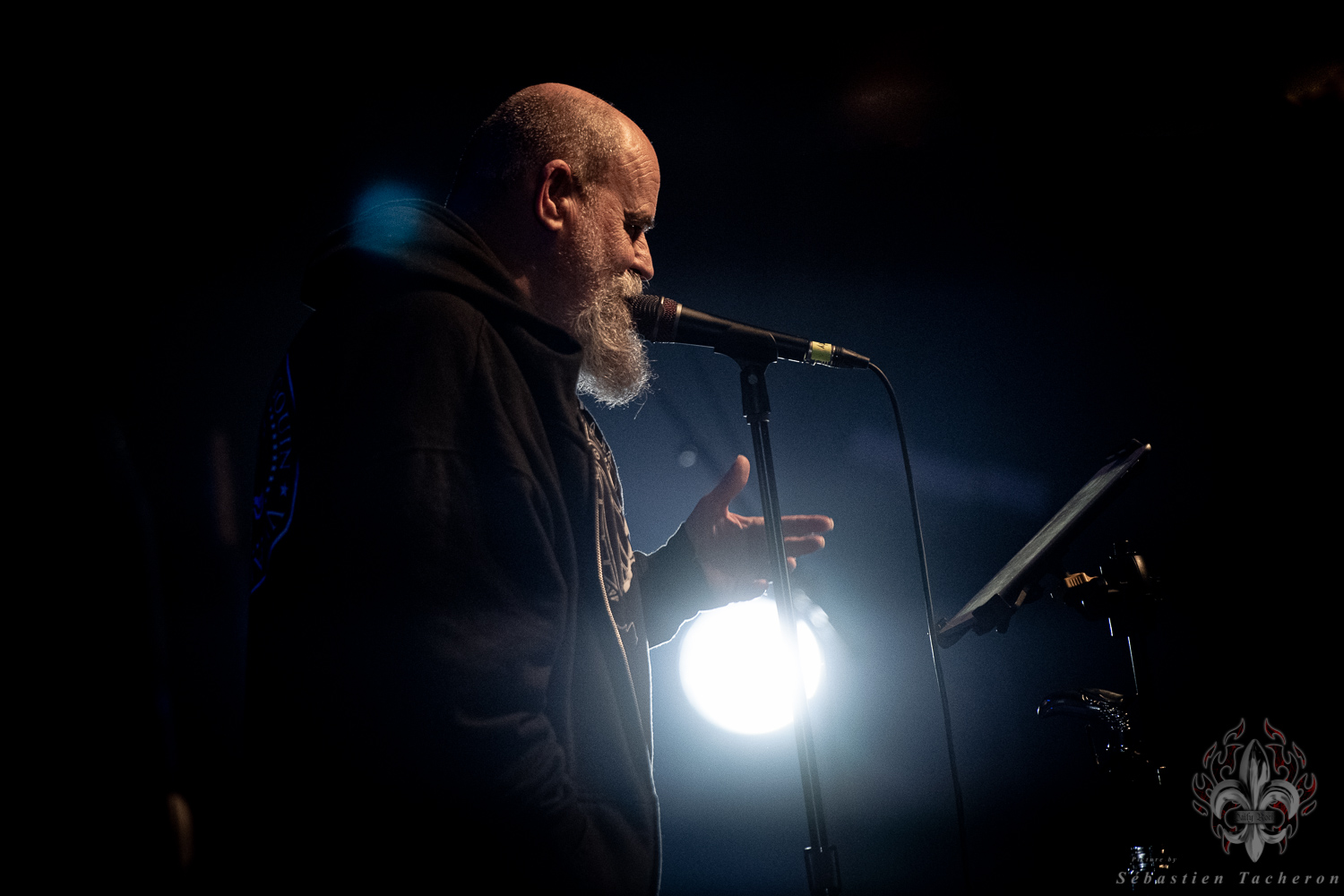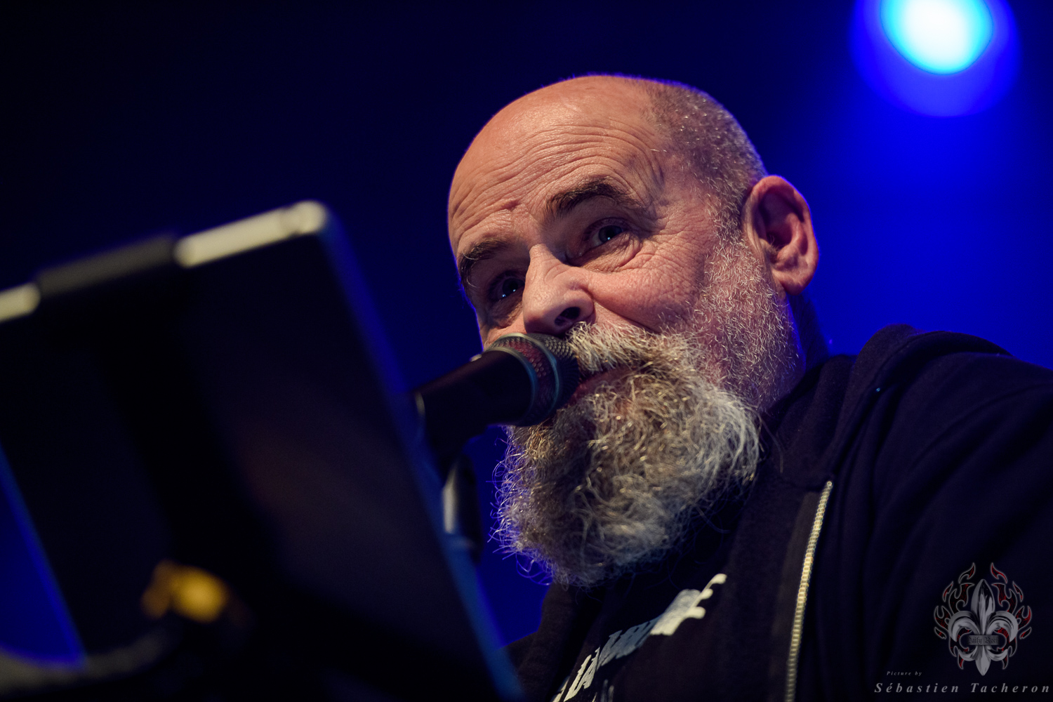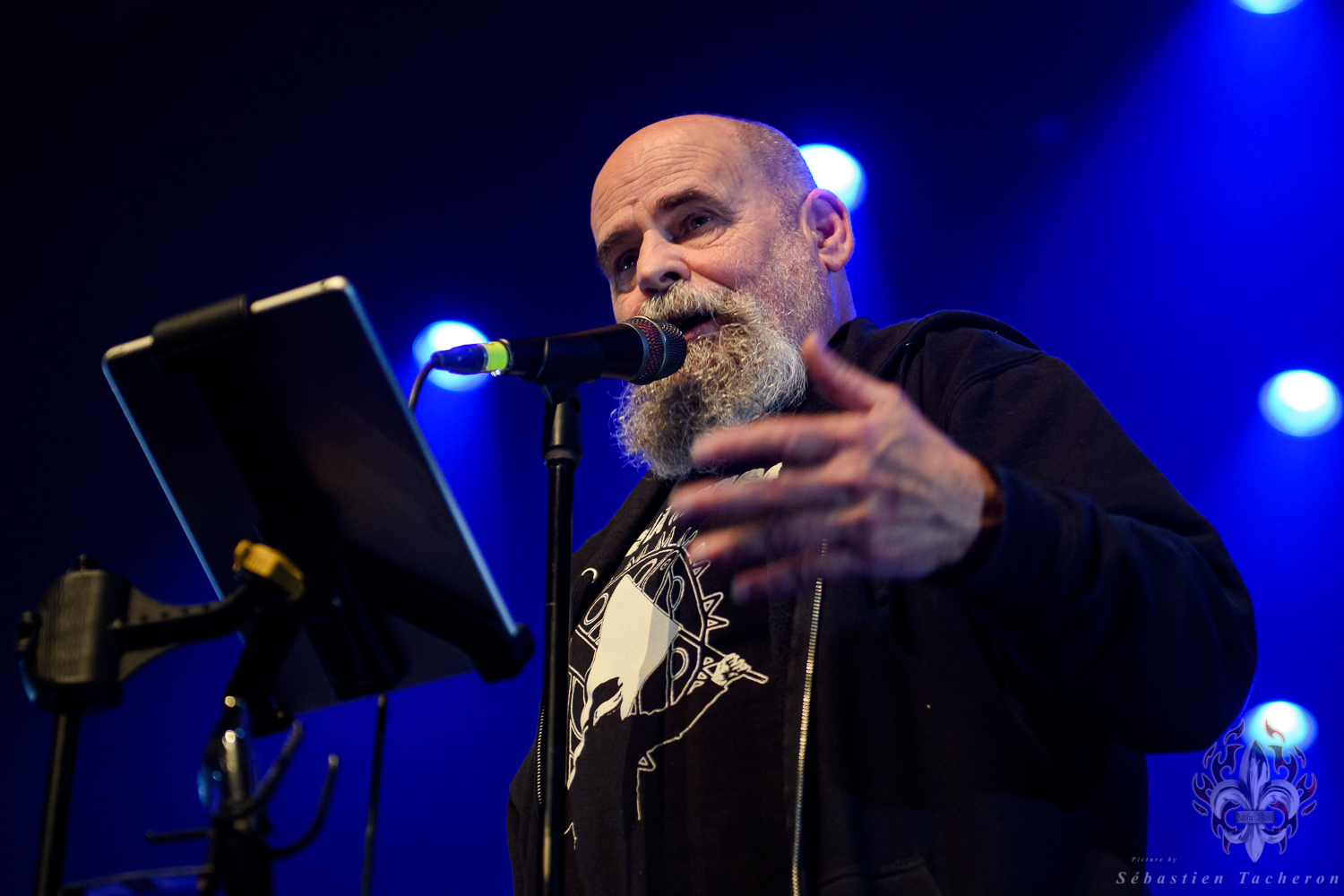 Si j’ai eu la chance, comme plusieurs Sherbrookois, d’avoir assisté à ce show, ce n’est rien comparé à ce que j’ai vécu juste avant. C’est grâce à Sébastien Tacheron, photographe talentueux et passionné pour Daily Rock Québec, que j’ai eu un accès privilégié au groupe. Sébastien, c’est l’artiste derrière les photos du présent article, mais aussi celui qui a pris le cliché et saisi l’âme de Rudy lors de la photo qui fait la couverture de son livre Rudy en 23 tounes. Avec lui, nous avons eu la chance de faire une entrevue avec Rudy avant le show, juste les trois ensemble dans sa loge.