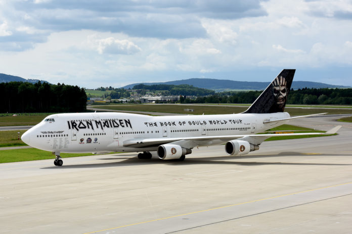 Eddie has landed ! Cet après-midi à 16h00, avec quarante minutes de retard sur l’horaire prévu, Ed Force One, le jumbo-jet privé de Iron Maiden, a atterri à l’aéroport de Zurich-Kloten. Une petite foule de quelques centaines de fans l’attendait sur le balcon-bellevue ainsi que beaucoup d’autres dans les champs à proximité de la piste. Comme dans les précédentes deux tournées, le groupe a décidé de voyager autour du monde avec son propre avion privé mais cette fois ils ont mis la barre encore plus haut. A la place du précédent et « trop petit » Boeing 757, cette fois le groupe est en tournée avec un Boeing 747, jusqu’il y a quelques années l’avion de ligne le plus gros en circulation (maintenant surpassé par l’énorme A380). Avec ce « petit » jouet le groupe peut se déplacer avec sa production complète et tout son entourage. Le pilote de ce monstre du ciel était encore une fois Bruce Dickinson lui-même. Il est en effet depuis plusieurs années pilote de ligne professionnel (eh oui, parce qu’être le chanteur de Iron Maiden n’est pas assez apparemment). Pour pouvoir avoir l’honneur de se mettre aux commandes, Bruce a dû entreprendre une formation, test final inclus. C’est donc avec trépidation et joie que la petite foule a attendu l’atterrissage du groupe à Zurich cet après-midi. Et je peux vous confirmer que c’était très particulier de voir passer à quelques mètres cet énorme avion avec un des logos les plus connus de l’historie de la musique. Le groupe est donc arrivé sans problèmes en Suisse et les 20’000 fans qui vont assister à leur concert de vendredi du Sonisphere à Lucerne n’ont plus que deux petit jours à attendre.