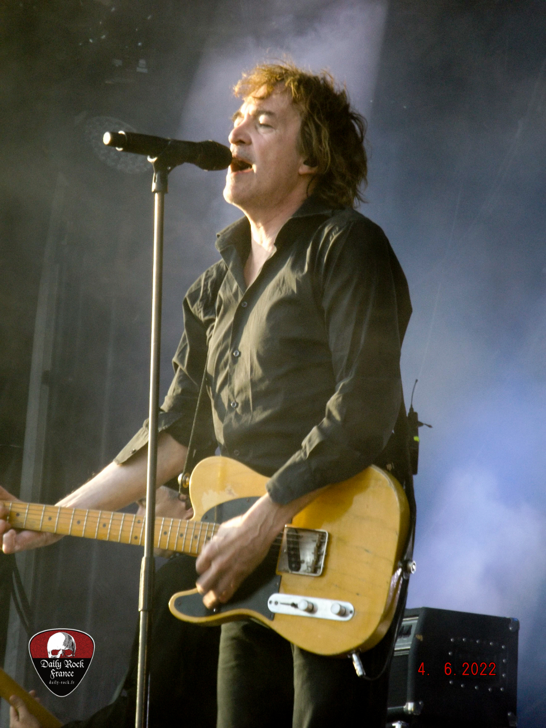 On commence donc notre aventure par la découverte du groupe local : Snap Border, qui joue sous le chapiteau ‘La Cabane’. Un groupe très énergique, jouant sur ses terres, et qui offre une belle prestation. Dommage que le son ne lui rende pas vraiment justice aujourd’hui. En tout cas Snap Border est efficace et commence à se faire une place dans le monde du rock français en partageant parfois la scène avec des groupes comme Tagada Jones, ou Mass Hysteria. Le public est là et soutien son groupe même sous une chaleur étouffante. La journée se passe tranquillement et nous allons nous diriger vers la grande scène pour applaudir, dans un style quelque peu différent : Cali. Une pointure de la chanson française qui va nous balader entre, poésie, entre pop, folk et rock, entre tendresse, mots justes et prise de positions. Un showman qui sait faire vriller son public avec ses tubes comme ‘C’est quand le bonheur’ mais aussi grâce à sa fougue et son sourire. Et il aime partager avec ses fans, courir au milieu du public, aller voir les spectateurs plus au fond, faire monter sur scène les photographes présents. Bref, Cali c’est le partage et la bienveillance, et le public ne s’y trompe en réservant un accueil plus que chaleureux aux musiciens sur scène.