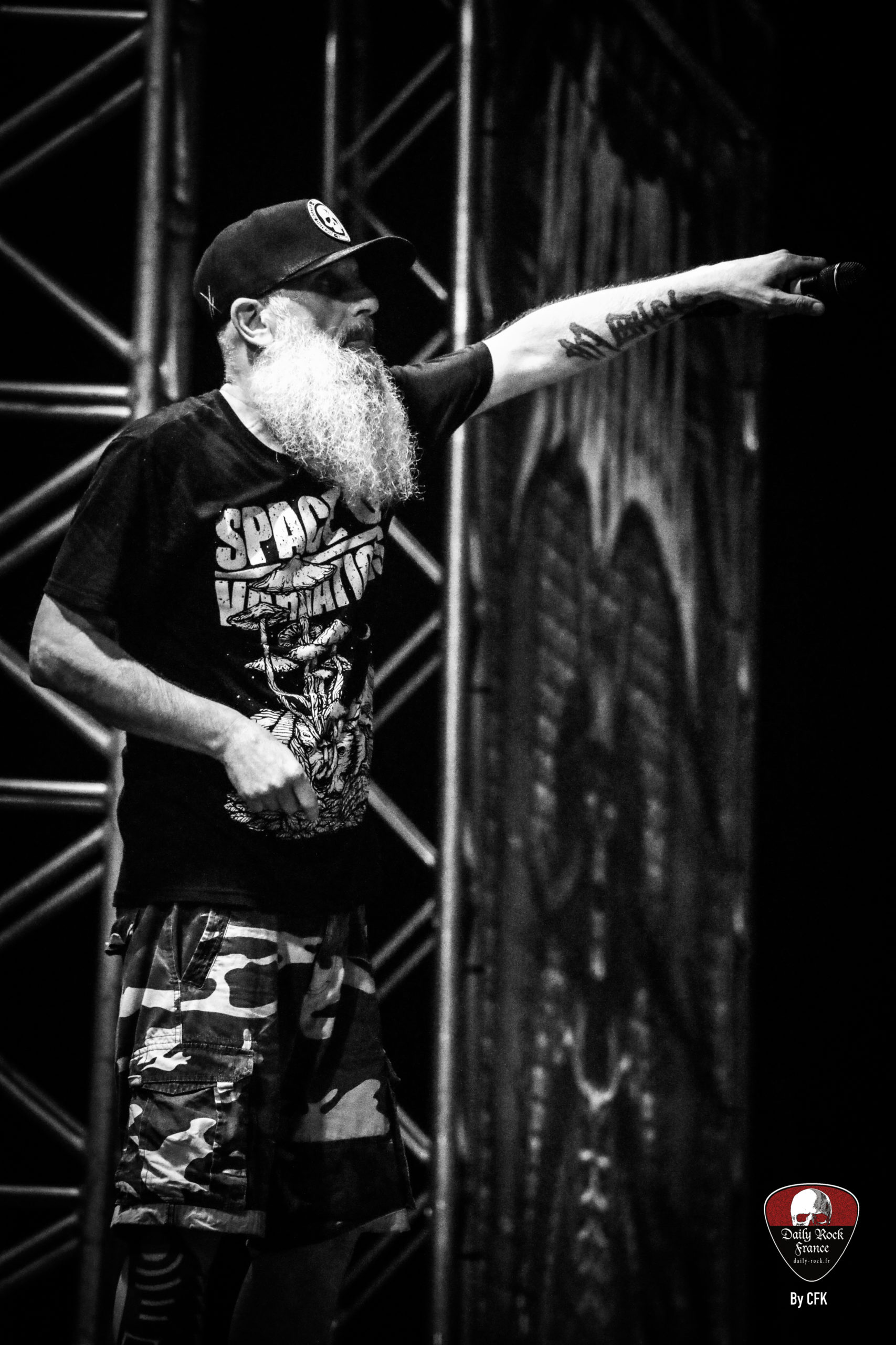 Puis, c’est au tour de Didier Super, artiste français connu pour ses performances provocatrices et satiriques, de faire son entrée. Si vous n’êtes pas adepte du second degré, ce concert n’est pas pour vous. On aime ou on n’aime pas. Le parti pris de Didier Super est de choquer, et ça fonctionne. Heureusement, le public metalleux a de l’humour et réagit joyeusement aux velléités proférées sur scène par le chanteur. « Vous avez de la chance de m’avoir dans votre petit festival de merde », l’entendra-t-on dire. Évidemment, en Lorraine et surtout en Moselle, on ne pouvait pas esquiver les blagues sur les Allemands. L’ambiance est bon enfant, le public s’assoit et s’installe confortablement pour apprécier le spectacle qu’offre un Didier Super visiblement très en forme.