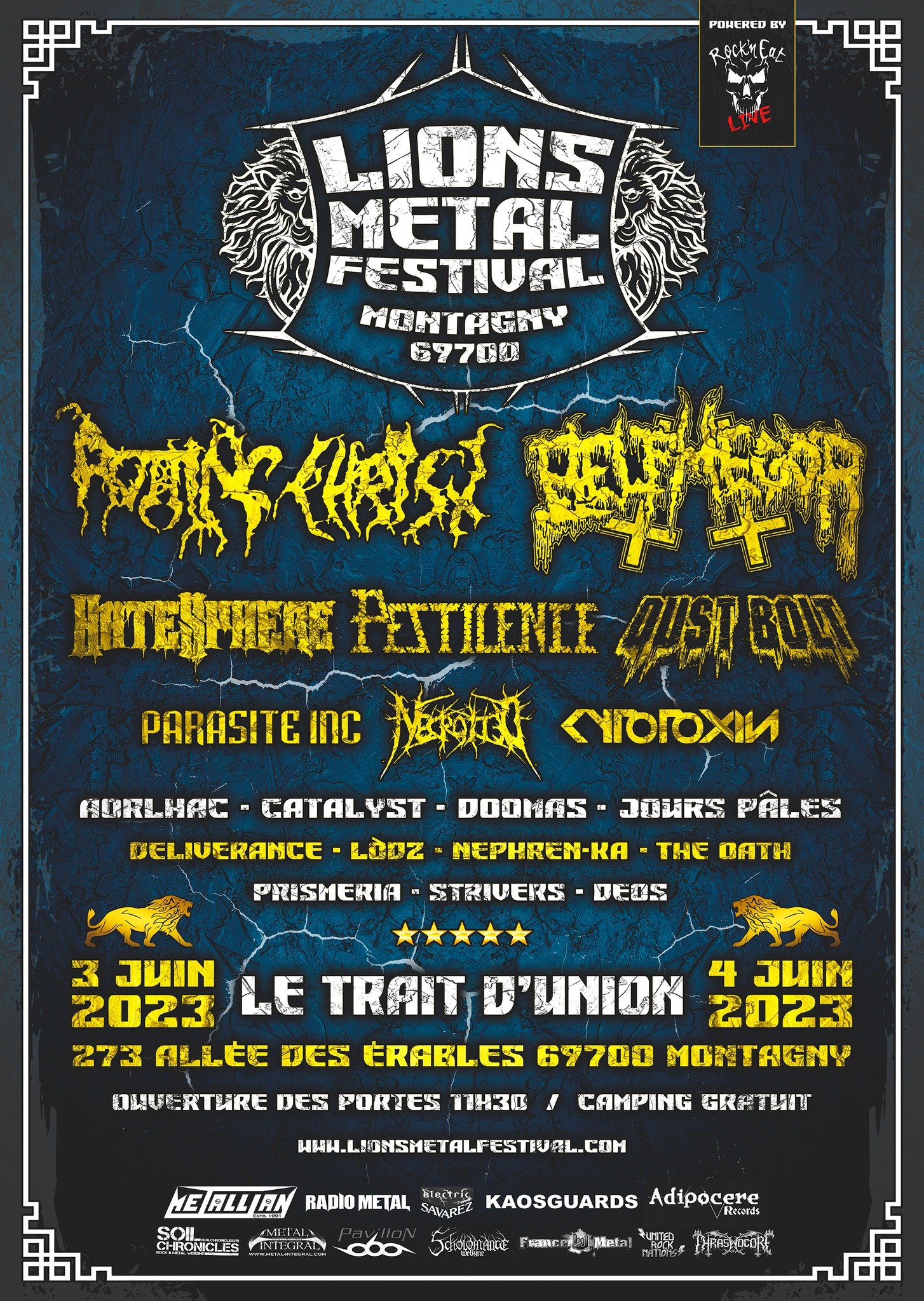 Ce week-end aura lieu la 5ème édition du Lions Metal Festival. Située à Montagny (entre Lyon et St-Etienne), le festival « indoor » se déroulera sur deux jours et fait la part belle aux groupes de metal extrême. Le festival propose une affiche allant du death au black en passant par le thrash, avec des tête d’affiches comme Rotting Christ, Belphegor, Hate Sphere, Pestillence et Dust Bolt.