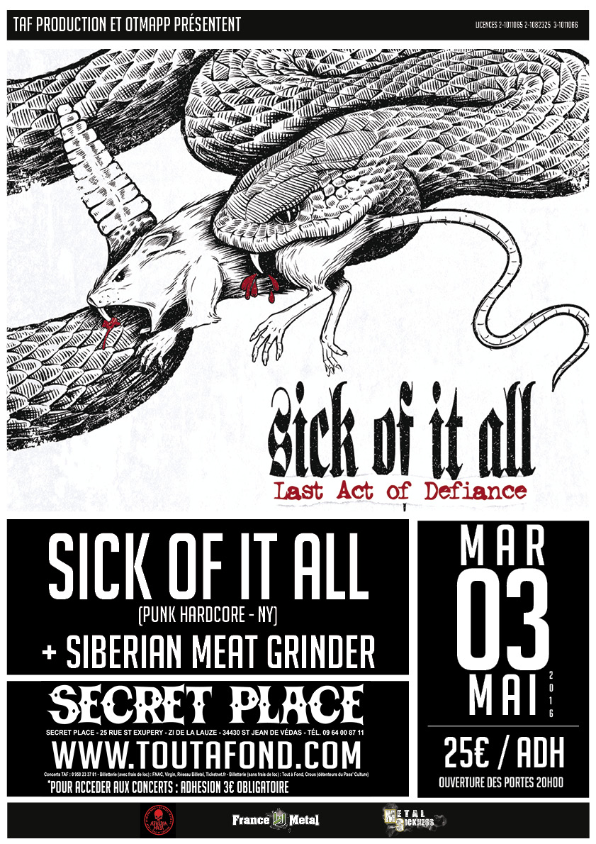 Nous revoilà du côté de Montpellier et de chez Fifi à la Secret Place. Ce soir c’est lecture de poésies avec les maîtres du New York Hardcore : Sick Of It All ! Ceux- ci viennent fêter leurs 30 ans et gratifient le sud d’une soirée, le tout accompagnés de Siberian Meat Grinder, groupe qui a actuellement le vent en poupe, autant que Municipal Waste.