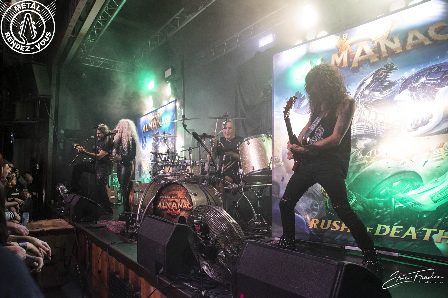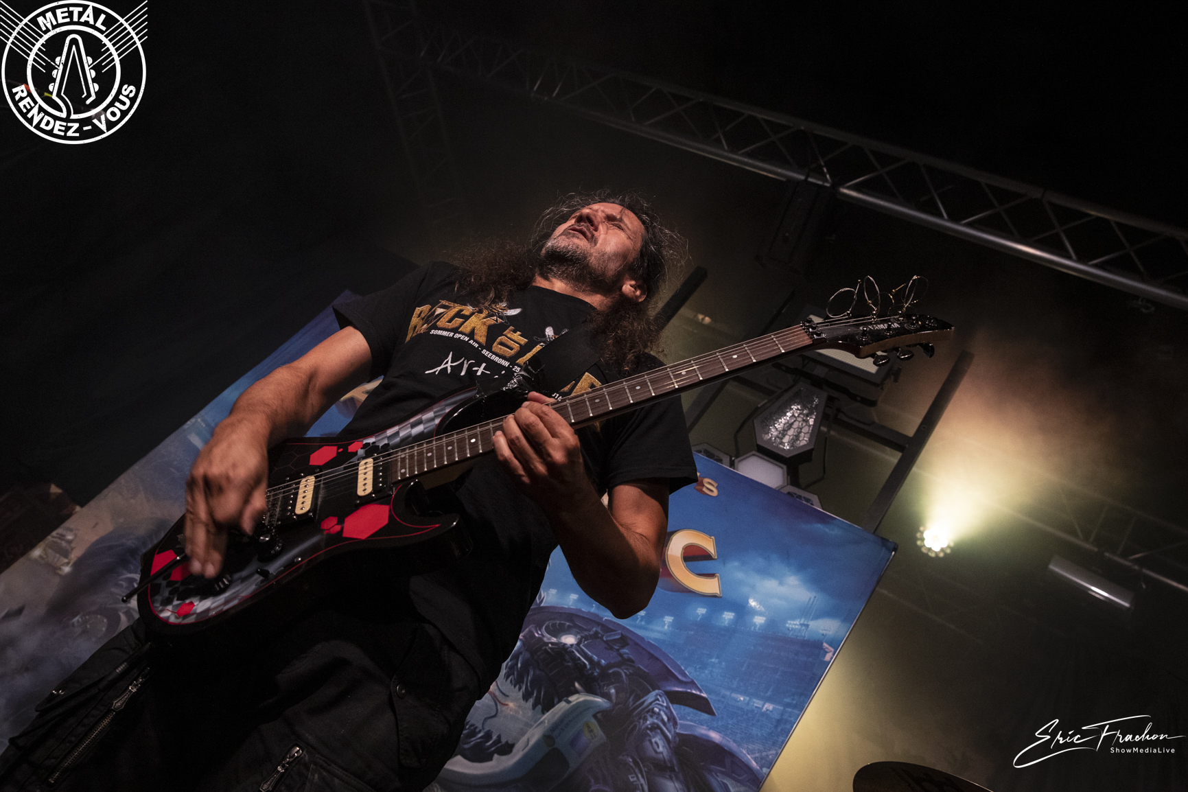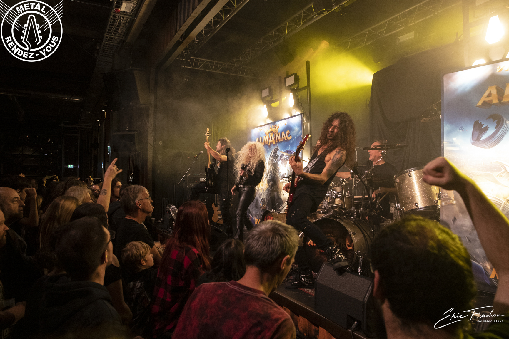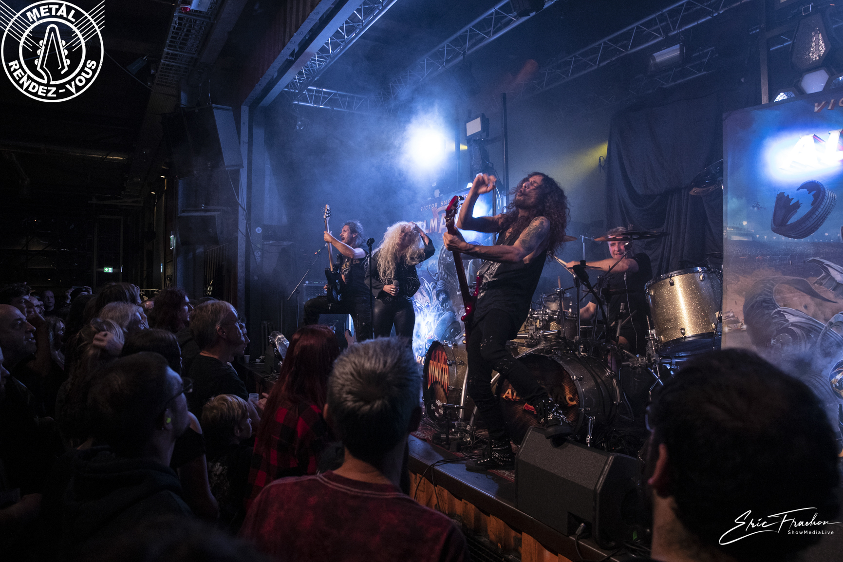 Victor Smolski fait son entrée sur scène, ou plutôt revient sur scène, car il partagea l’espace de quelques titres les planches avec Dymytry. Almanac, deuxième groupe de ce soir, fut fondé en 2015 par Victor Smolski. Pour la faire courte (car le CV du coco est très étoffé), Victor était le guitariste du groupe allemand Rage (1999-2015). C’est d’ailleurs par une reprise de ce dernier qu’il entame son set, ‘Innocent’ de l’album ‘Speak of the dead’ (2006). On entre dans un univers beaucoup plus technique et progressif. On sent par contre l’audience un peu plus circonspecte et sur la retenue. Le guitariste de Minsk nous offre même en primeur des titres de son quatrième album solo à venir. Et puis son solo de guitare, avec un clin d’œil à feu Eddie et son ‘Eruption’ a ravi les guitaristes présents. La bonhommie du quatuor, leur plaisir d’être là et cette bonne humeur communicative font passer un bon moment à la majorité du public. En revanche, soyons honnête, Almanac fait un peu office d’OVNI sur l’affiche du jour.