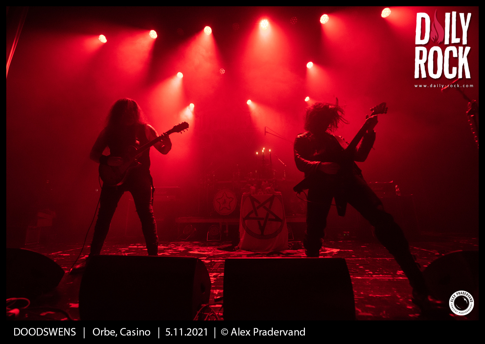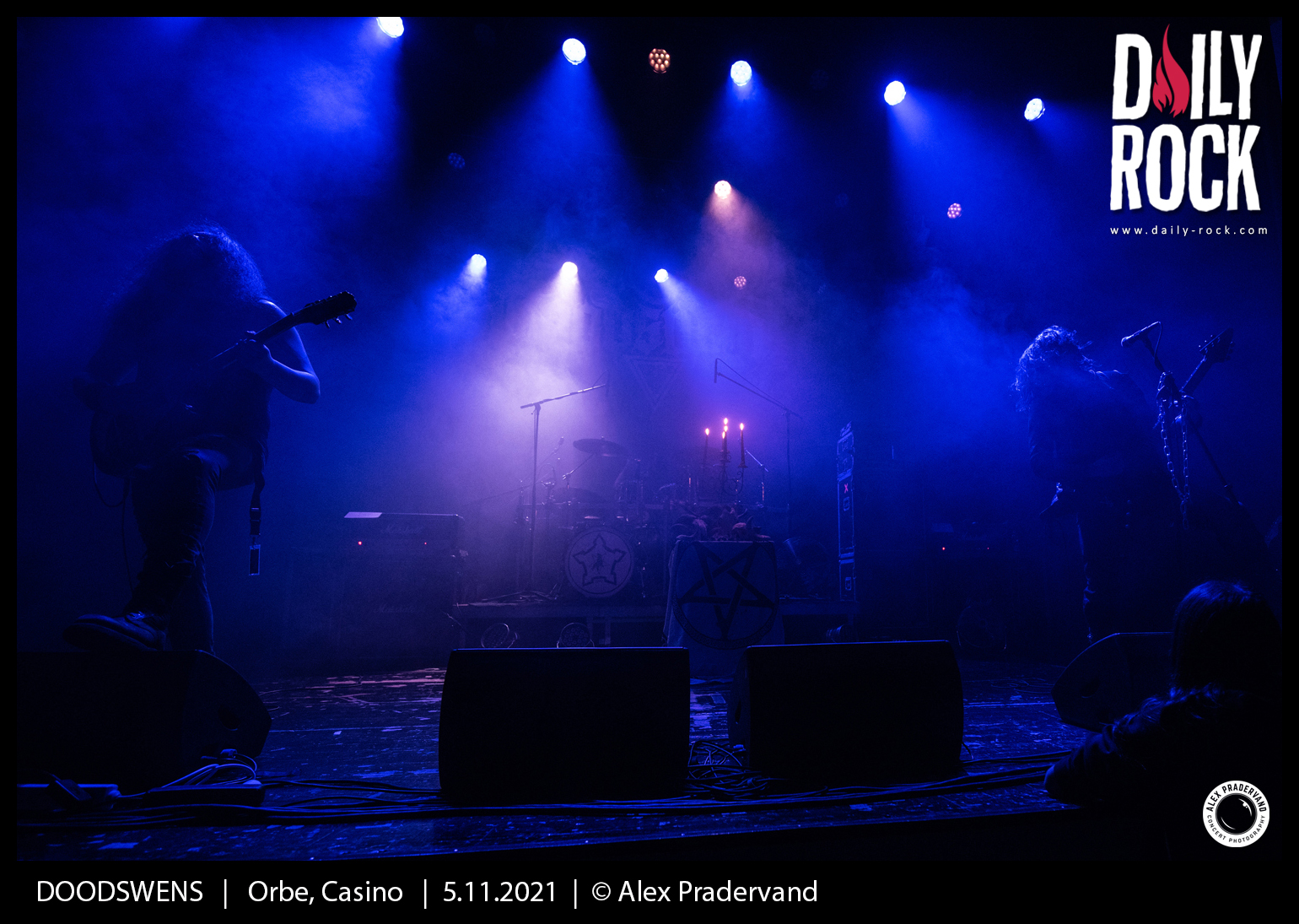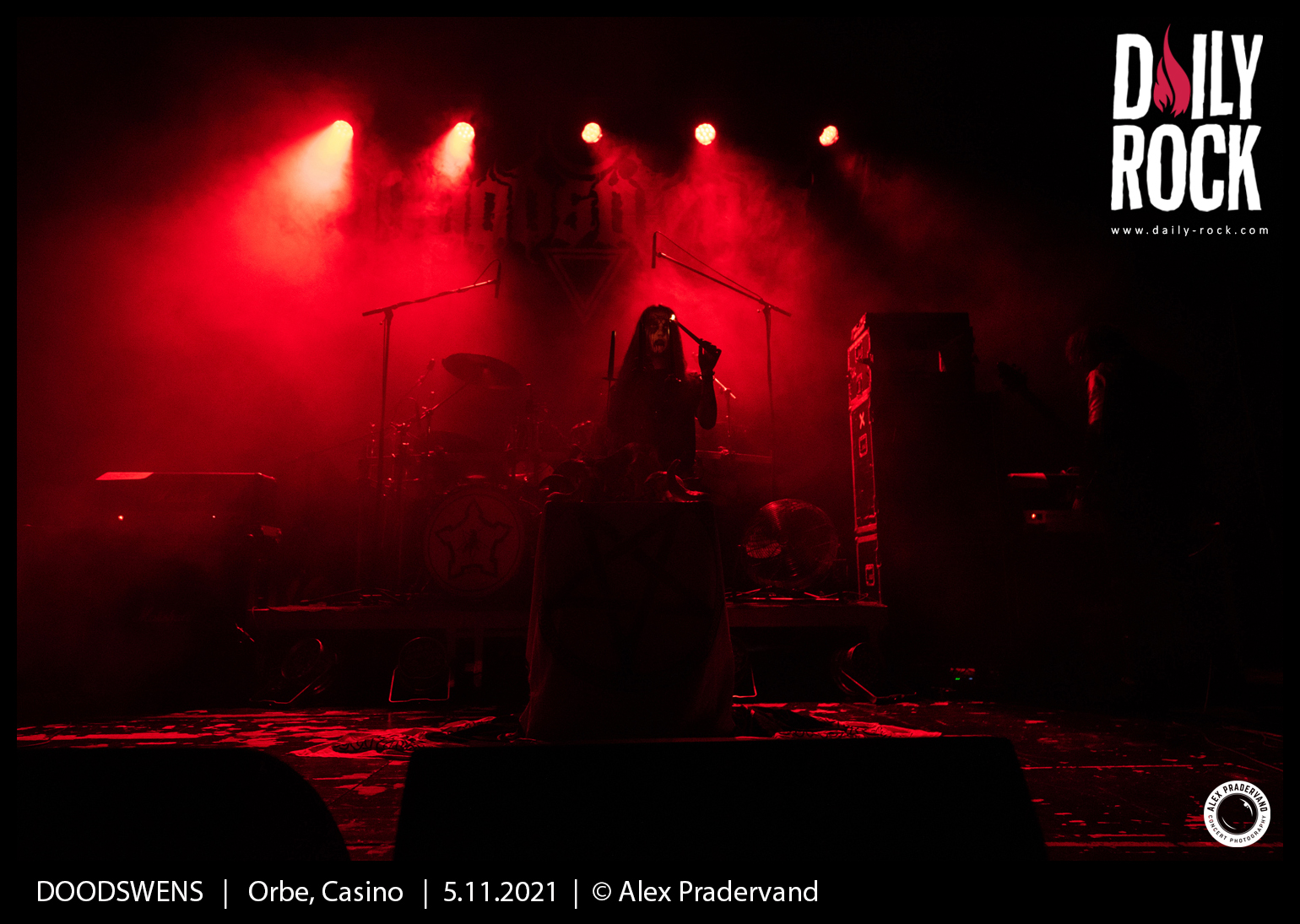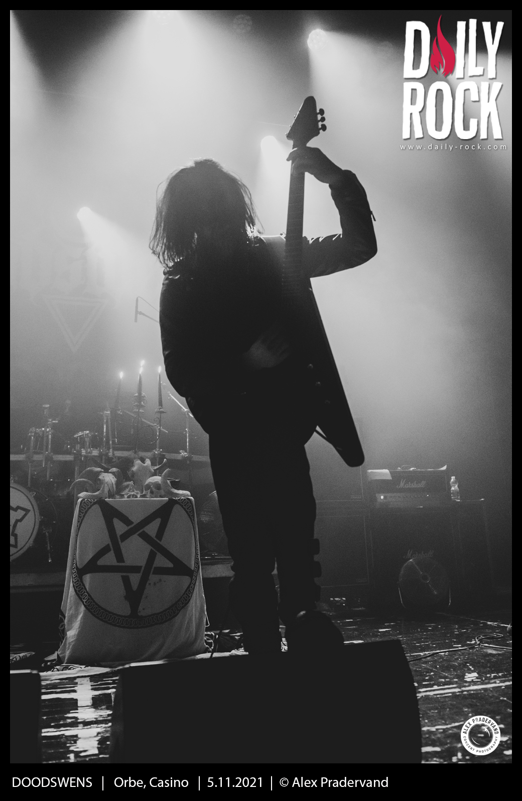 C’est donc Doodswens qui débute, comme prévu, son concert à 20.00 heures. Sur le devant de la scène, quelques ossements et un bougeoir allumé juste avant que les musiciens apparaissent. Deux guitaristes et vraisemblablement un batteur, que l’on entendait bien à défaut de le voir. Les hollandais jouent un set au tempo assez lent par rapport au reste de la soirée. Cela flirte un peu avec le doom au niveau des arrangements, mais la voix ne laisse aucun doute, c’est du black. Après une vingtaine de minutes un peu ennuyeuse, il y a un morceau qui envoie bien, mais ce ne sera que provisoire, le set retrouvant son tempo plus lent jusqu’à son terme. La bonne nouvelle, c’est que le son est plutôt pas mal du tout (devant en tous les cas) et surtout que cela tient, pas de coupure d’électricité.
