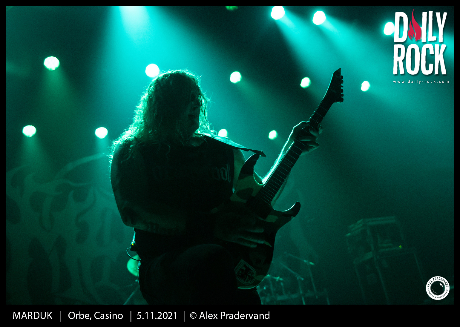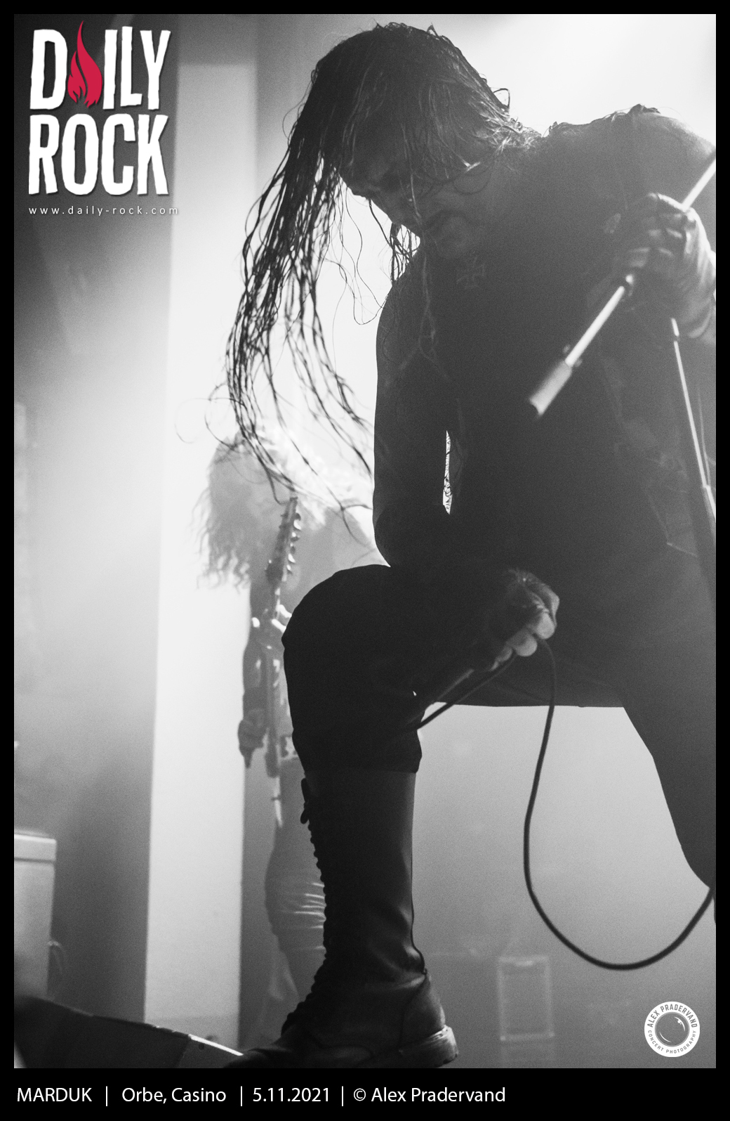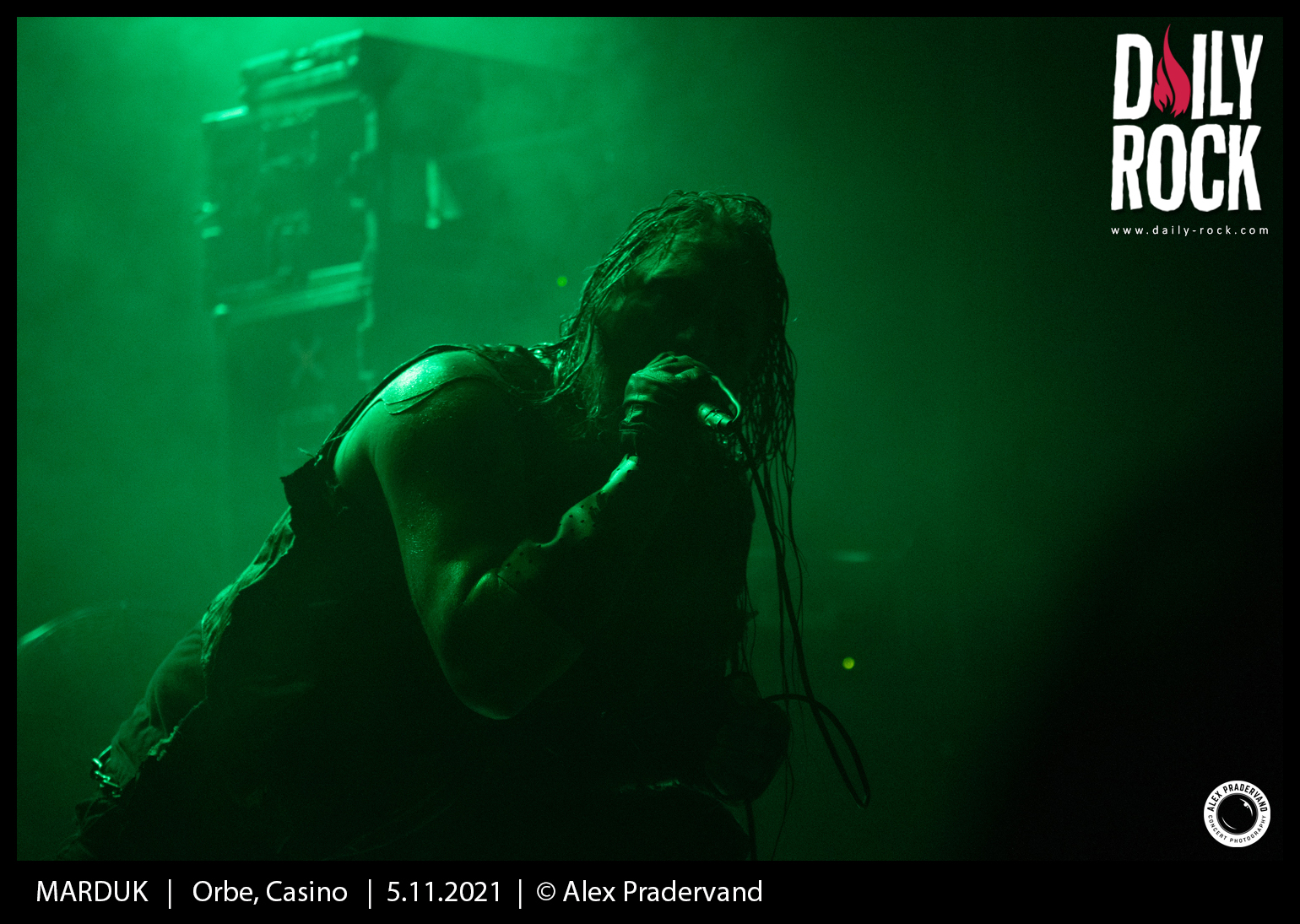 Il est 22.10 heures, la salle est maintenant bien pleine quand la bande d’intro démarre. Marduk au complet investit la scène et là tu vois que rien que les gars sont déjà imposants même avant de commencer à jouer. Ils se mouillent bien la tête avec de l’eau avant de débuter leur set. Là aussi on devine plus que ce que l’on voit, mais quelle puissance quand cela démarre. Vraiment un groupe plus impressionnant à mes yeux sur scène que sur disque. Tournée anniversaire oblige, ce sont des titres de tout leur répertoire, dont un bon nombre de vieilles chansons, ce qui semble ravir tout le monde. Pas beaucoup d’interaction avec le public, mais quand même un assez improbable check de Mortuus avec un jeune fan sur les épaules de son père entre deux chansons. Respect aux parents qui éduquent leurs enfants de cette manière.