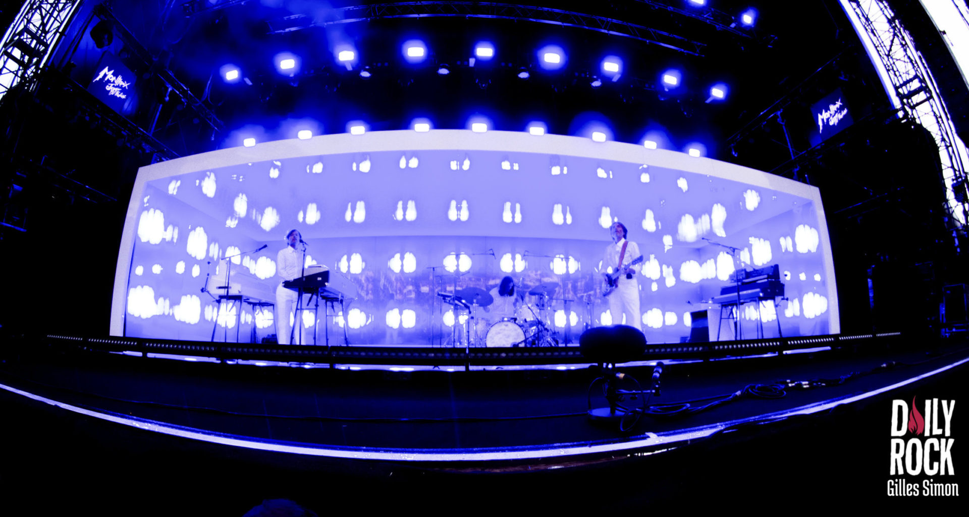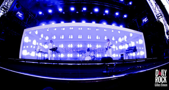 Le concept est simple, rejouer leur album phare ‘Moon Safari’, l’album qui a fait connaître le duo d’electronic performers français sur la scène internationale. Une musique electro aux lignes de basse groovy inspirées et aux ambiances reposantes très 70’s. Jouant au milieu d’une sorte d’aquarium de lumière, l’installation paraît simple mais très efficace visuellement. Accompagné d’un batteur, le duo tout de blanc vêtu enchaîne les morceaux de son album culte sans blabla avec en fond de jolis tableaux qui habillent des atmosphères souvent planantes. Pour compléter le set, Air dégaine ‘Venus’ de leur album ‘Talkie Walkie’, ‘Highschool Lover’, de la mythique bande-son de ‘The Virgin Suicides’ et ‘Don’t be Light’ de ‘10000 Hz Legend’ pour un final plus dynamique.