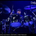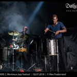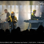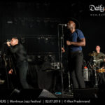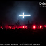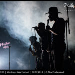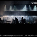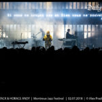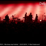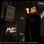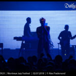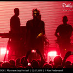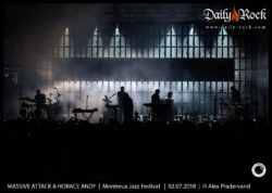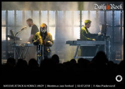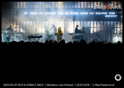 21.15 heures, les photographes sont en régie, c’est-à-dire au fond de la salle derrière la table de mix, pour les trois premiers morceaux du concert de Massive Attack. L’écran géant est bien en place. Les utilisateurs de l’application Montreux Insiders ont pu avoir accès à la setlist de ce soir en primeur. Sans surprise, c’est la même sur toute la tournée. Cela début avec le toujours très fidèle Horace Andy sous les projecteurs pour ‘Hymn Of The Big Wheel‘. Le fameux écran géant distille ses messages en français ce soir, interrogeant sur le sens de la vie, la mort ou encore Dieu. Autant c’était assez incroyable en 2014 que cela semblait quelconque lundi soir. Sans un mot, Daddy G, moins jeune père que sa première partie, prend le relais pour ‘Rising Son‘. On voit les silhouettes de tous les musiciens sur scène entourées par les deux batteries aux extrémités, mais entre le peu de lumières pour mettre en évidence l’écran géant et les fumigènes, on ne voit pas grand chose. En plus, les écrans géants de la salle restent noirs pour obliger le public à regarder en direction de la scène. Autant dire que les photos sont dans la même veine.