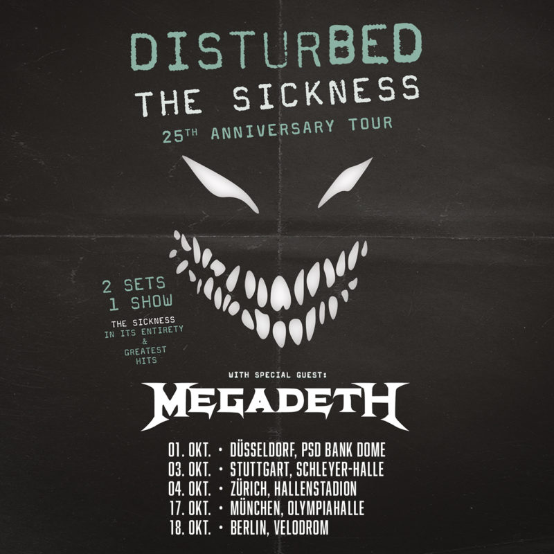 Disturbed est en effet en tournée hommage pour les 25 ans de son album culte ‘The Sickness’ (qui sera joué en entier avec également un set best of) et Megadeth est son invité spécial sur les 17 dates de la tournée. Megadeth qui a récemment annoncé qu’il allait encore sortir un tout dernier album et ranger les guitares après une ultime tournée, donc faut pas hésiter à aller les voir pendant que c’est encore possible.