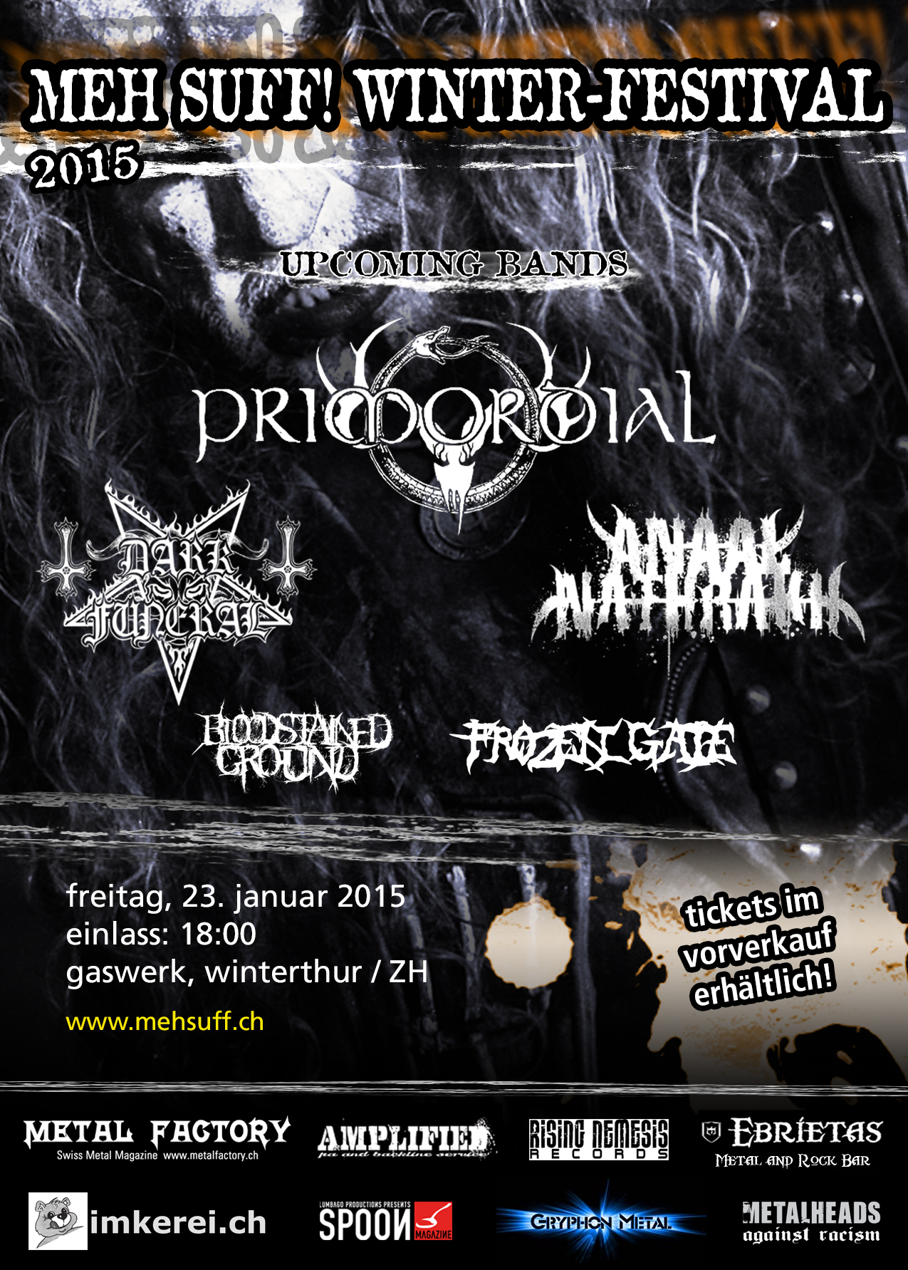 Meh Suff, pour les nouveaux, c’est un peu l’équivalent de l’asso Fer De Lance, mais en Suisse allemande. Tout au long de l’année, ils organisent un paquet de soirées metal, lorgnant souvent sur le black et le death, couronnées par ce qui est probablement le meilleur festival de hard en Suisse début septembre, où Satyricon, Ensiferum, Vader et autres lurons se disputaient la vedette lors de la dernière édition. Parce qu’un festival par année, c’est pas assez, tout le monde approuvera, les gaillards rempilent avec un deuxième événement annuel, baptisé, surprise !, Meh Suff – Winter – Festival. L’affiche est comme d’habitude partagée entre des pointures suisses, Bloostained Ground, Frozen Gate, Defaced, et des pointures internationales. Au nombre de celles-ci, on retient le groupe de brutal death metal maltais (!) Abysmal Torment, Gorod, Defeated Sanity, et Belphegor. Tout ça est trop gras pour vous ? La première nuit saura peut-être davantage vous séduire avec Anaal Nathrakh, dont le dernier bébé fut notre album du mois il y a peu, Dark Funeral, qu’on ne présente plus, et Primordial – là, ceux qui me connaissent savent qu’on touche un point sensible. L’event metal de l’hiver, c’est à Winterthur, on se réchauffe comme on peut.