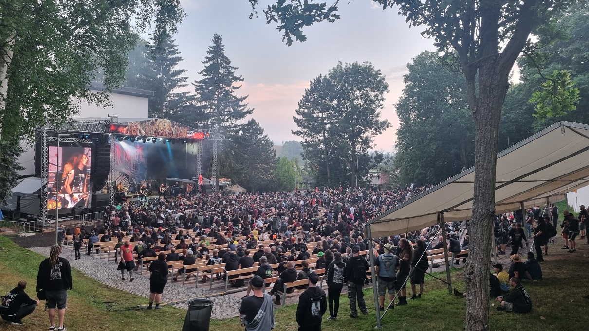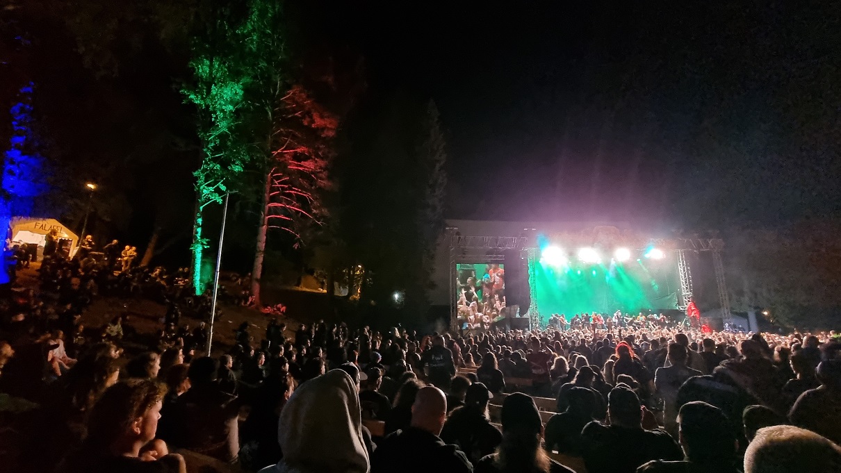 Underground, fait maison et esprit de famille sont les valeurs portées par l’organisation. En effet, le festival n’est pas du tout sponsorisé et il est 100% indépendant, mais cela n’empêche en rien d’avoir de bonnes infrastructures. La scène entourée de gradins puis d’arbres, faisant office de cinéma en plein air le reste de l’été, est parfaitement aménagée et équipée d’un grand écran. De plus, et c’est une des particularités de l’Obscene Extreme, un mètre de largeur du devant de la scène est dédiée exclusivement aux slammeurs, crowdsurfers et stagedivers. Autant dire que sur certains concerts, on a très peu vu les musiciens tellement il y avait de monde sur scène ! Le son était lui aussi irréprochable, surtout quand on sait qu’il n’y avait que 10 à 15 minutes de changement de plateau.