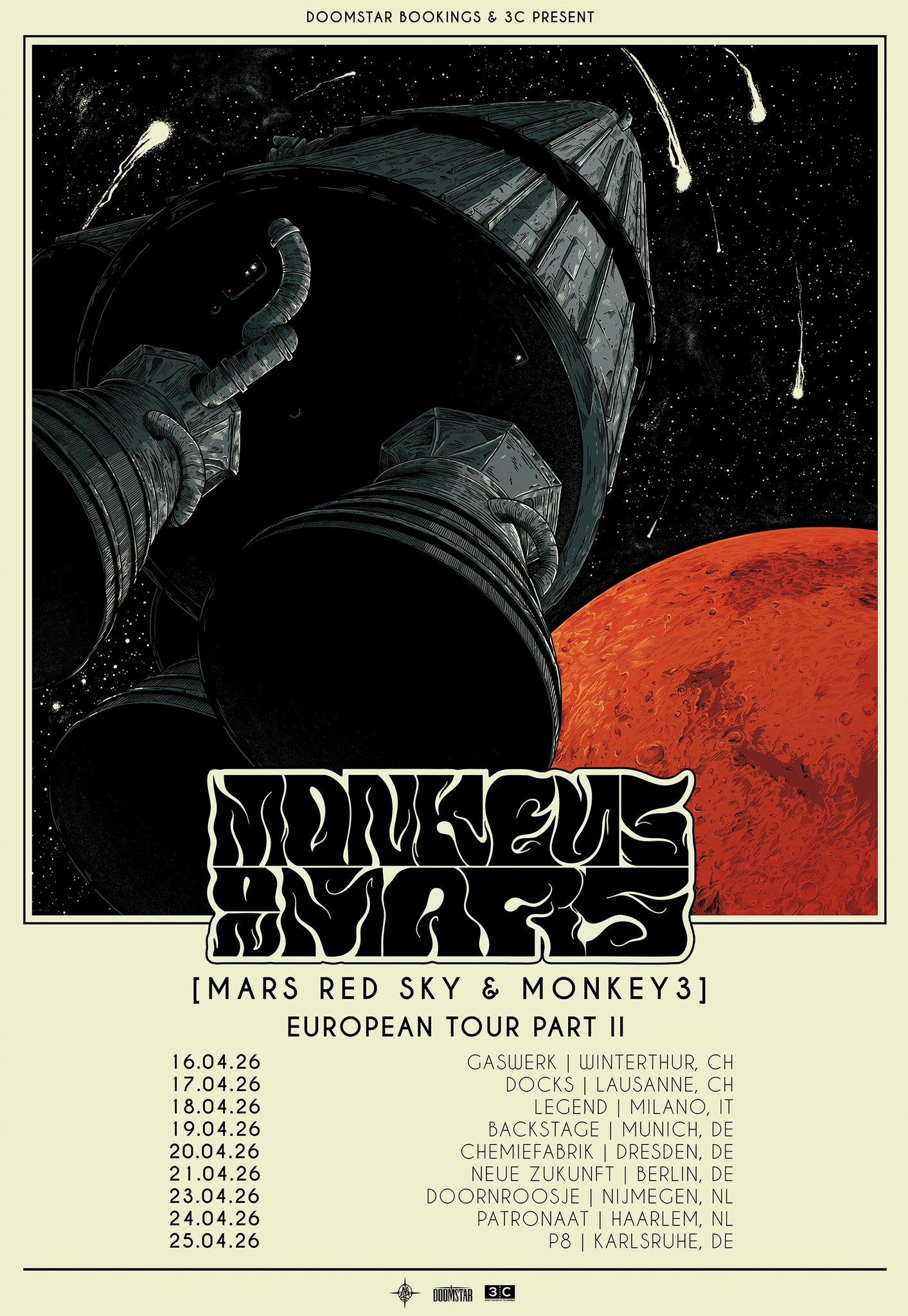 On se réjouit que Monkeys on Mars fasse deux escales en Suisse également, le 16 avril 2026 au Gaswerk de Winterthur et le lendemain, 17 avril aux Docks de Lausanne !!!