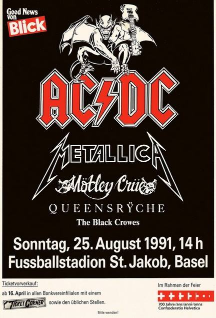 Il y a 25 ans aujourd’hui, jour pour jour, se tenait en Suisse l’une des meilleures affiches pour un concert de rock que nous ayons eu sur le sol helvétique. Le célèbre Monsters of Rock faisait escale à Bâle en ce 25 août 1991, quelques jours après l’original ayant lieu à Donnington en Angleterre. Un événement unique qui ne se fera malheureusement qu’une seule fois en Suisse. Une affiche d’exception avec AC/DC, Metallica, Mötley Crüe, Queensrÿche et The Black Crowes, organisée par Good News. Les Monsters of Rock, c’est une époque où le metal régnait en maître dans le monde ! Imaginez que AC/DC tournait pour son album Razors Edge, Metallica pour le Black Album, Mötley Crüe pour Dr Feelgood et à un album près Queensrÿche pour Operation Mindcrime, quatre albums qui ont posé une marque indélébile dans le metal ! Et c’est assurément rien de moins que l’ancêtre du Sonisphere, Download ou autres Ozzfest. Nous avons collecté ci-dessous quelques propos de fans présents à cet événement remplis de nostalgie. Cet article est magnifiquement illustré par les photos inédites de notre ami et partenaire Joseph Carlucci que nous ne remercierons jamais assez !